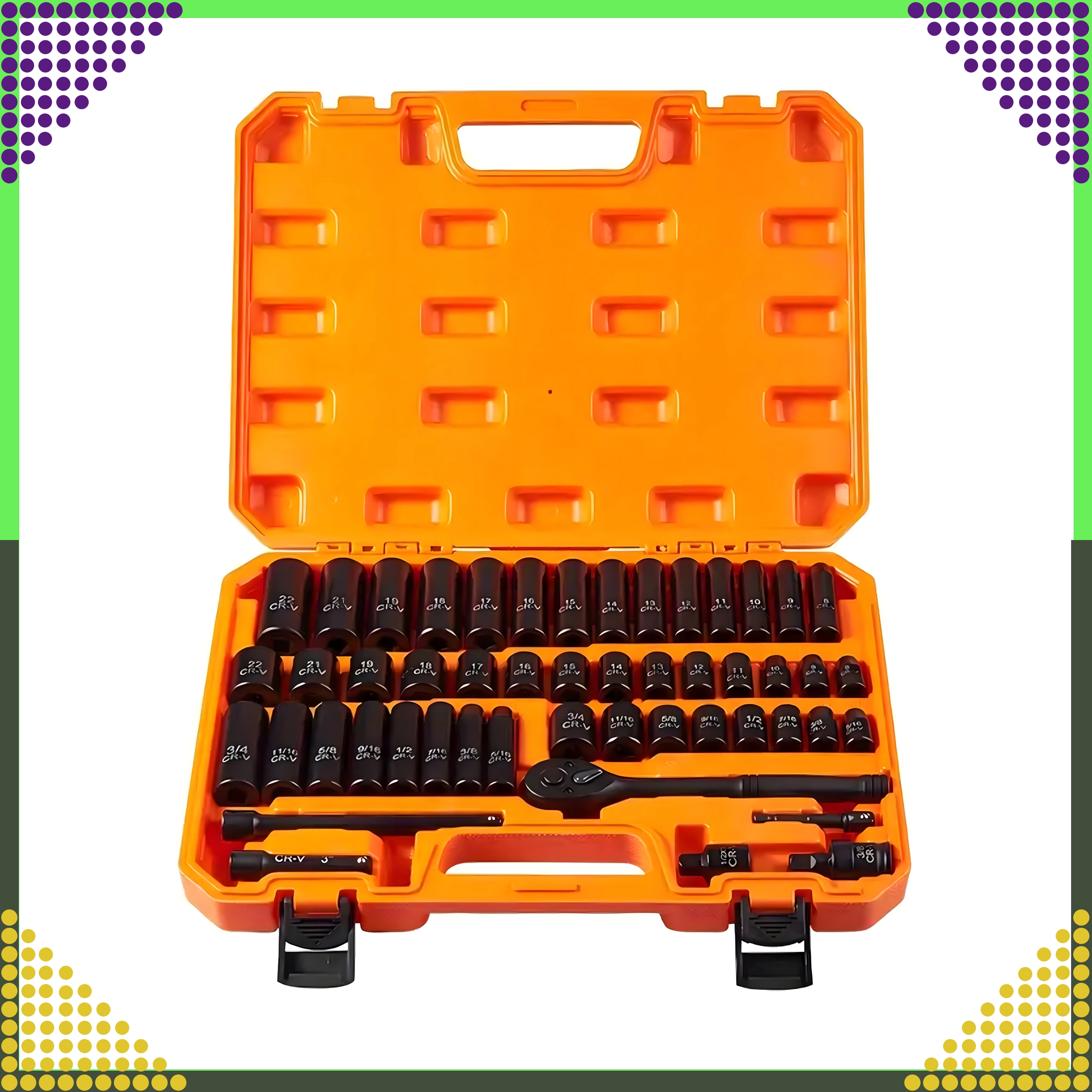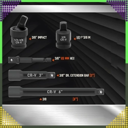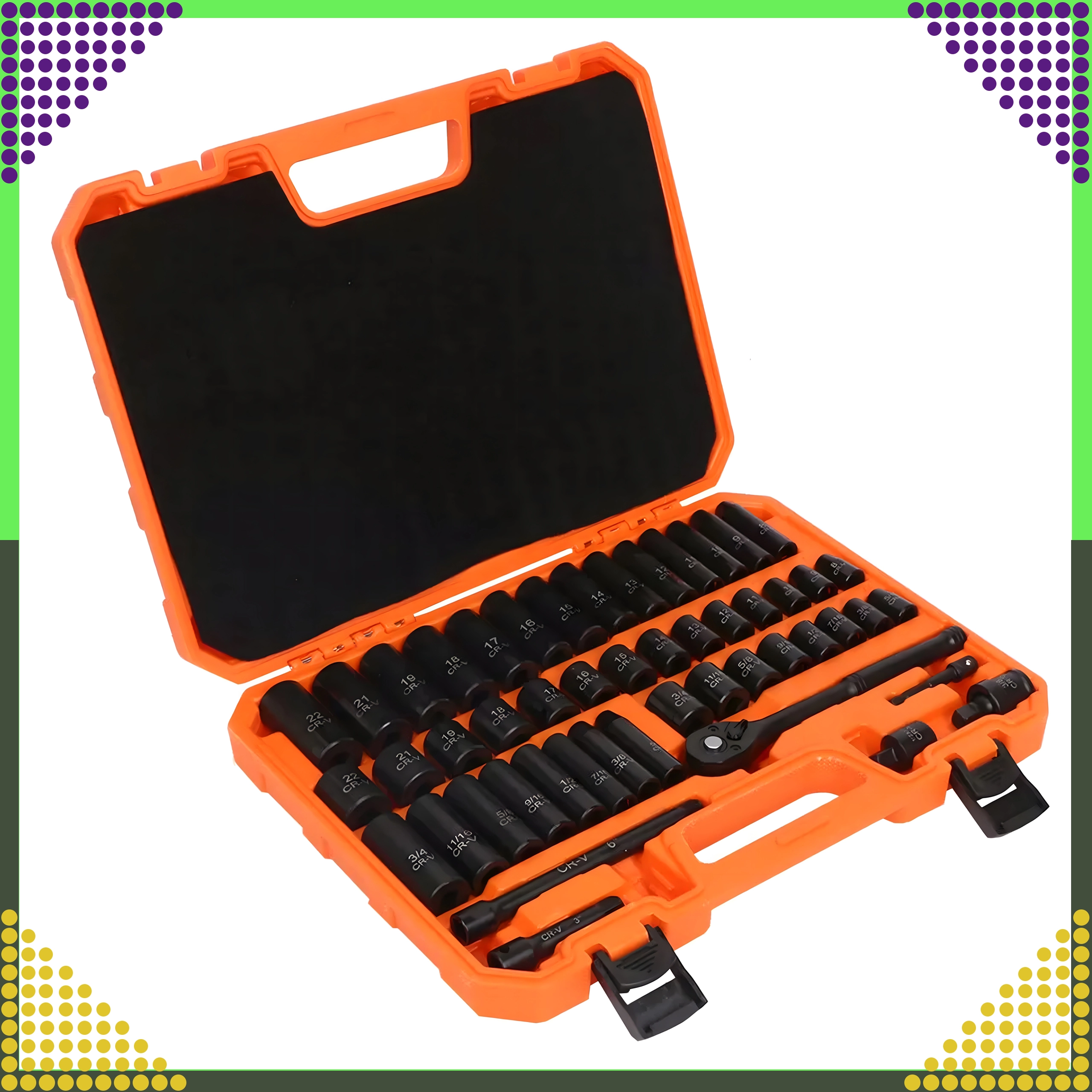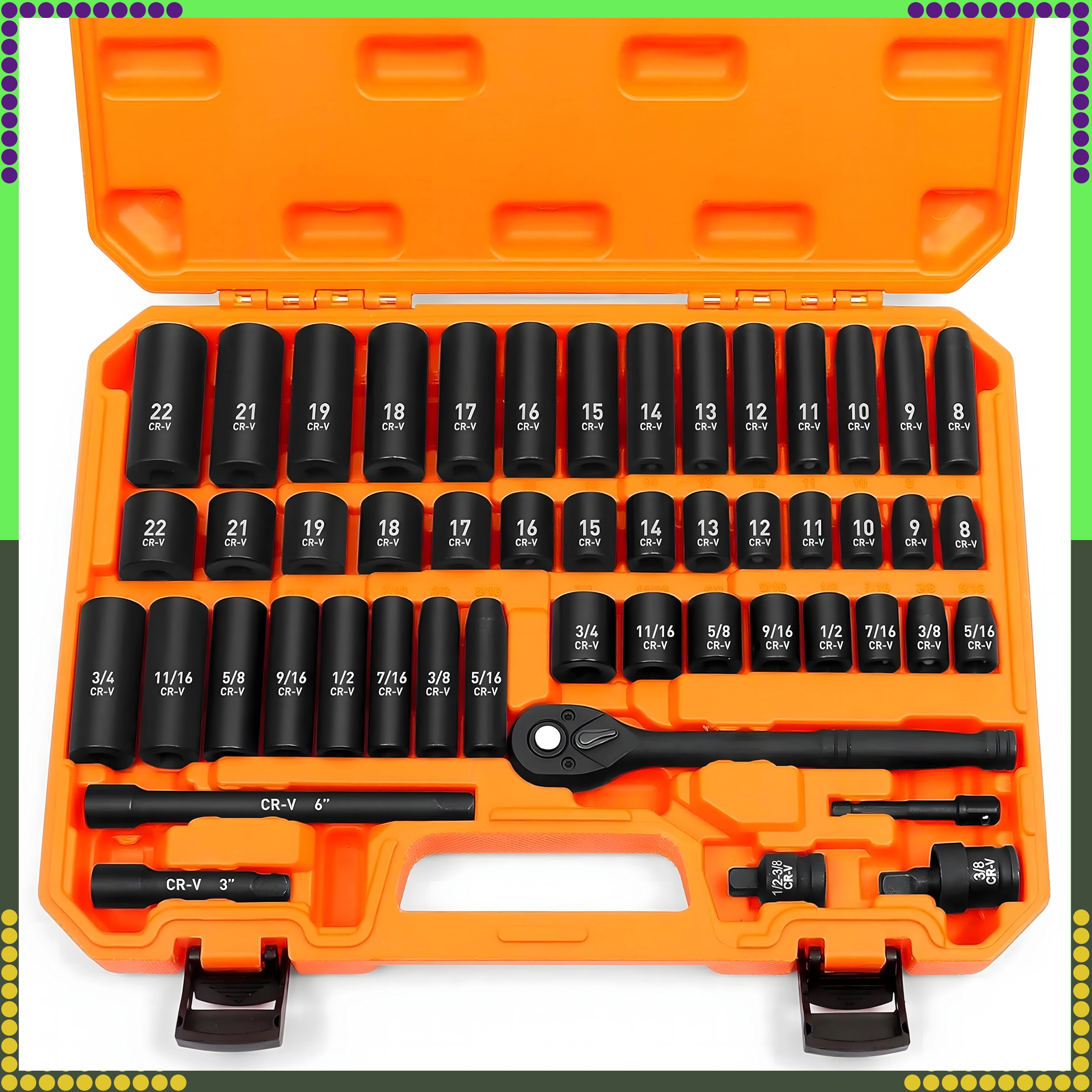 Profesjonalny zestaw udarowych nasadek z napędem 3/8'' zawiera aż 50 elementów w rozmiarach metrycznych i SAE. Oferuje nasadki sześciokątne dla pewnego chwytu, grzechotkę 3/8'', przedłużki oraz przegub uniwersalny. Wykonany z wytrzymałej stali Cr-V i dostarczany w solidnej przenośnej walizce dla perfekcyjnej organizacji.