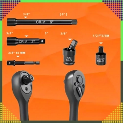 - Grzechotka 3/8'', przedłużki, przegub uniwersalny, adaptery (w zależności od zestawu)