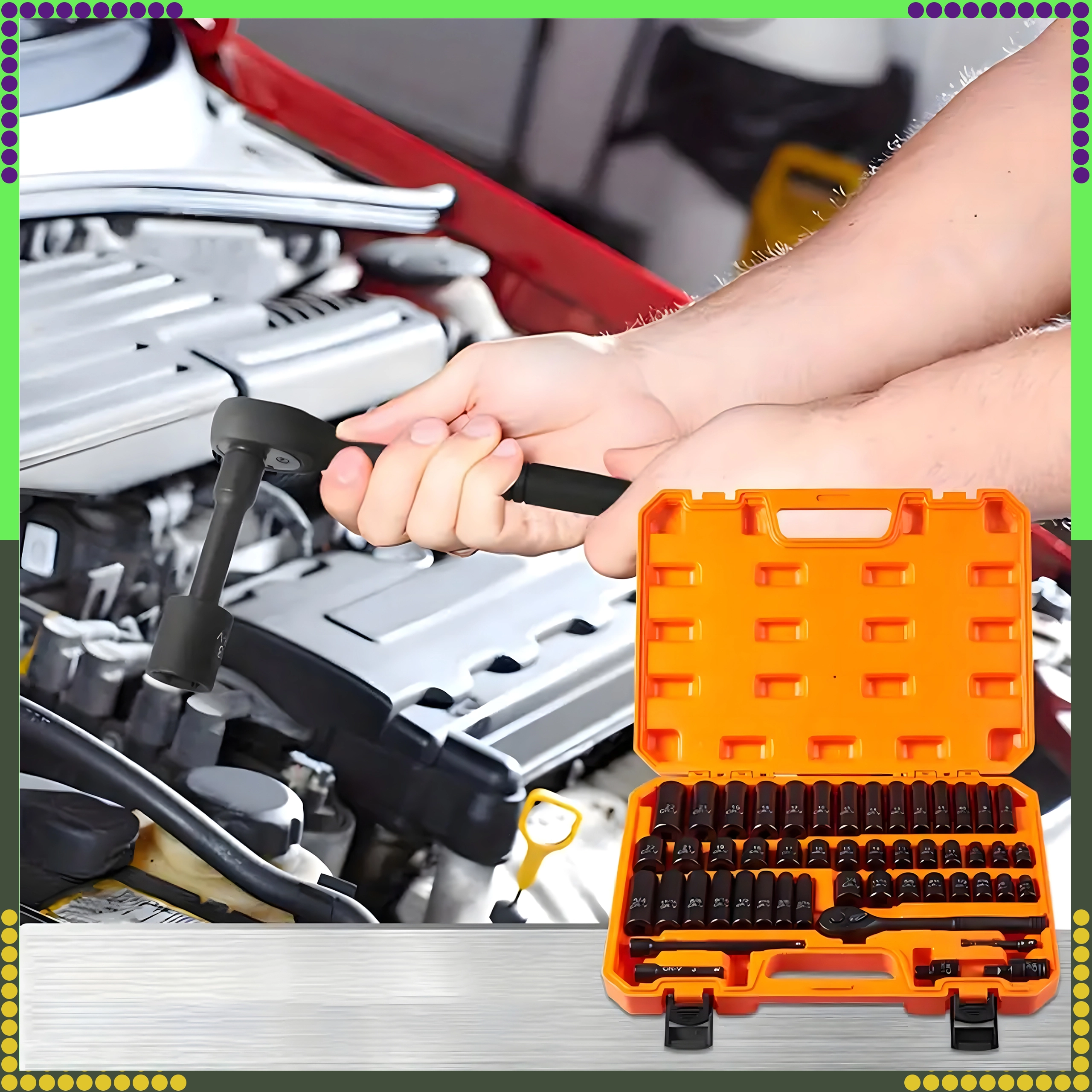 - Kompletne wyposażenie 50 elementów: nasadki metryczne i SAE, grzechotka 3/8'', przedłużki, przegub uniwersalny.