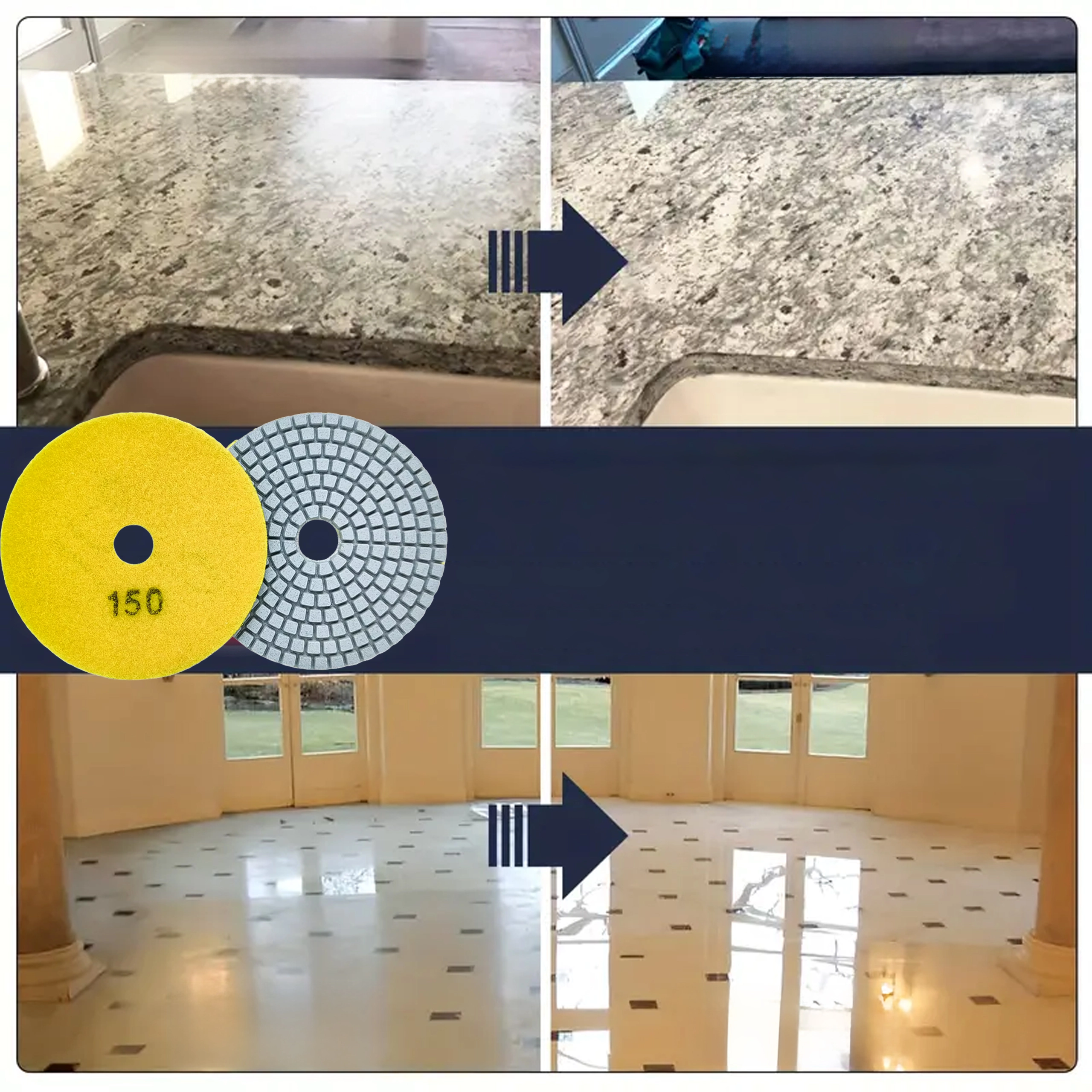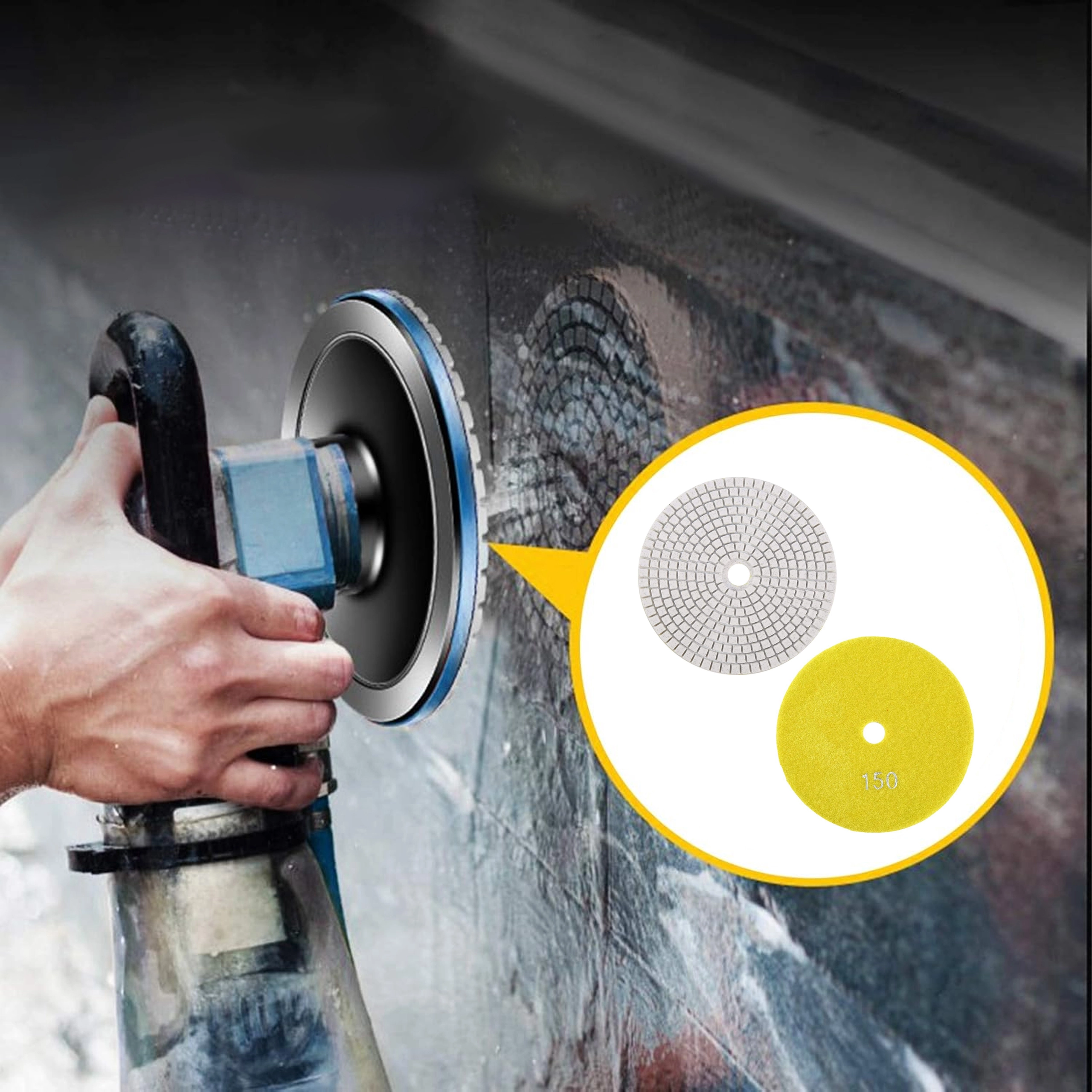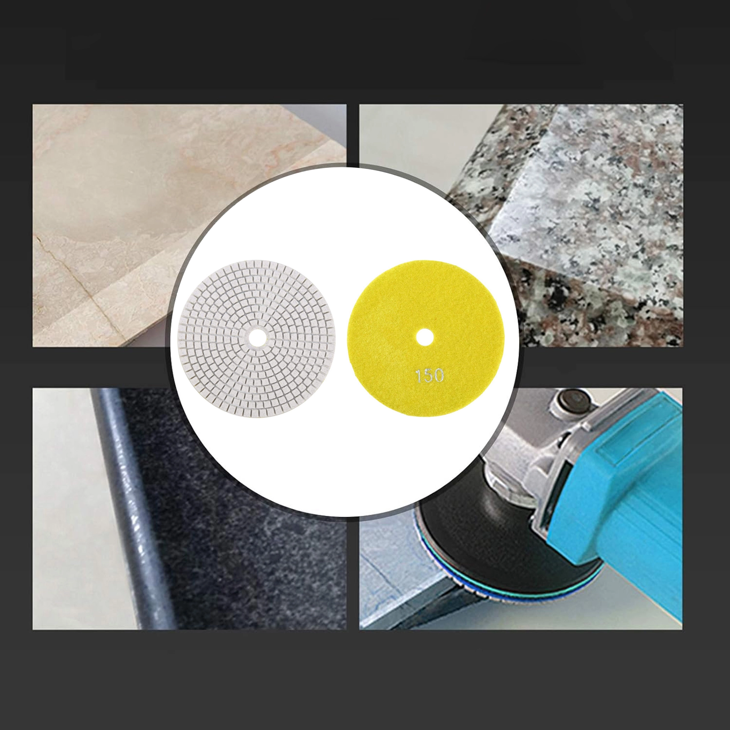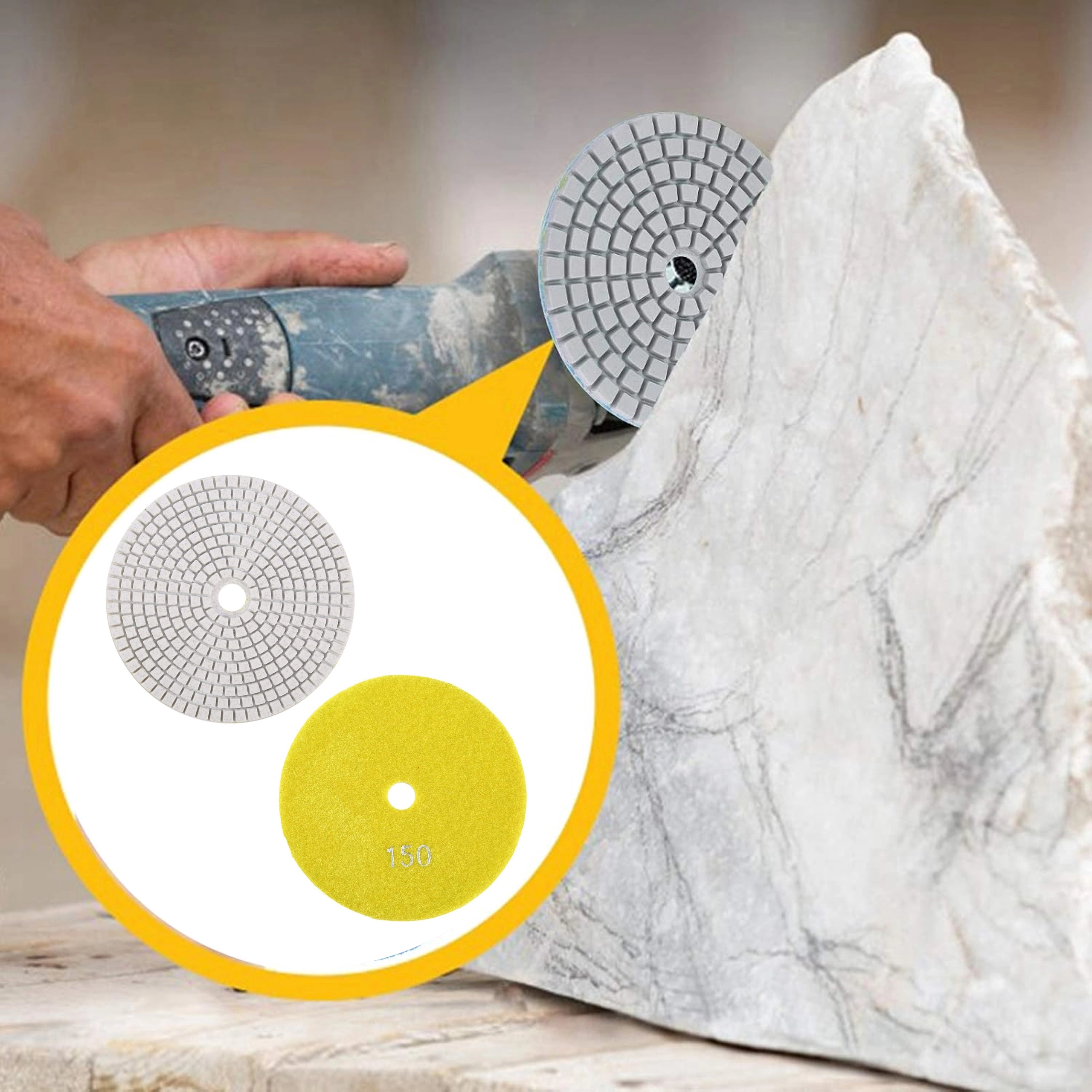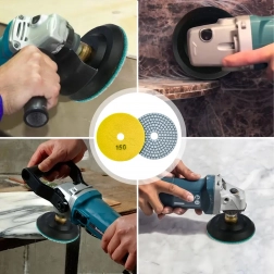 Tarcze diamentowe o gradacji 150 są idealne do wygładzania i wstępnego polerowania twardych materiałów. Segmentowana powierzchnia zapewnia skuteczne chłodzenie i odprowadzanie pyłu, co daje czysty i powtarzalny efekt na krawędziach i płaskich powierzchniach.