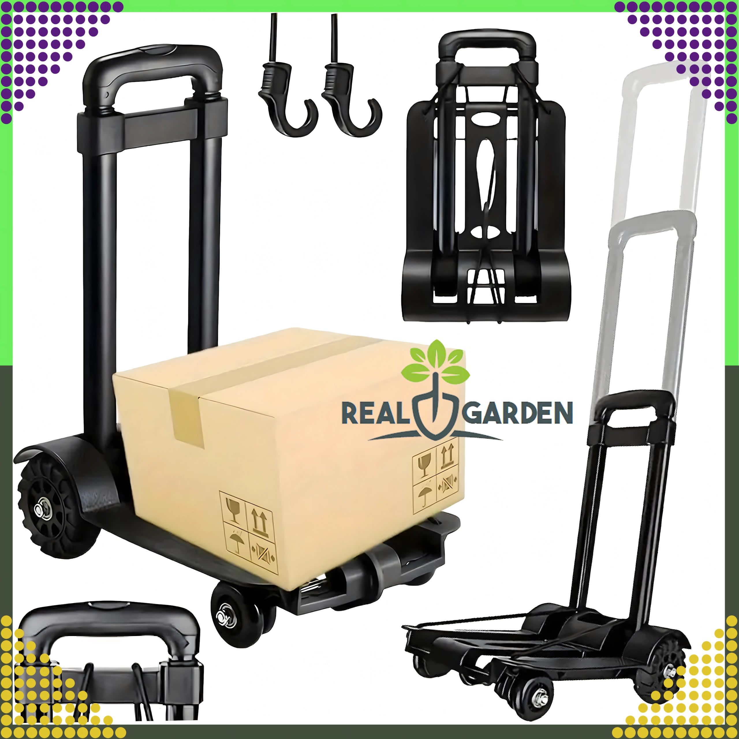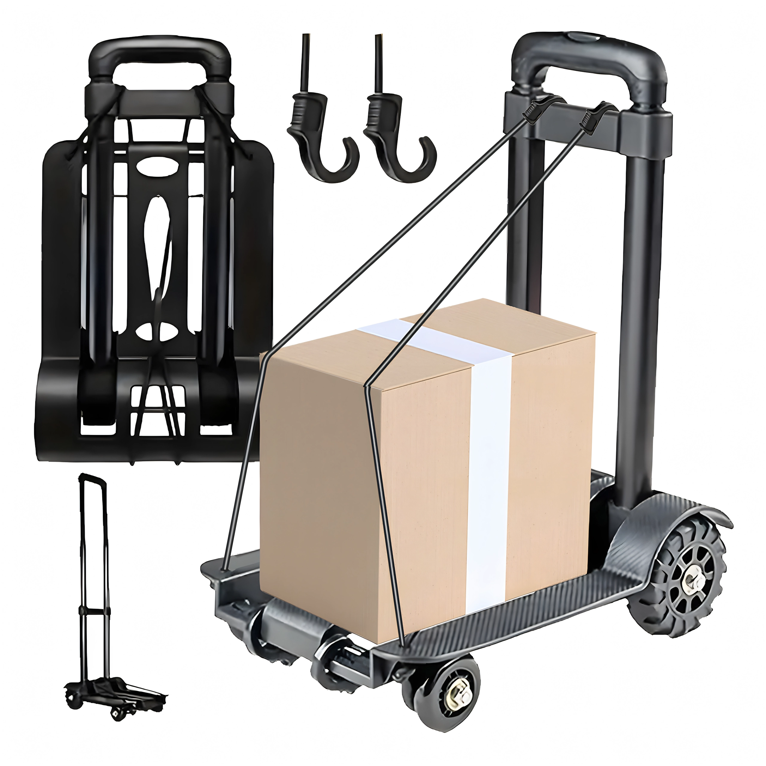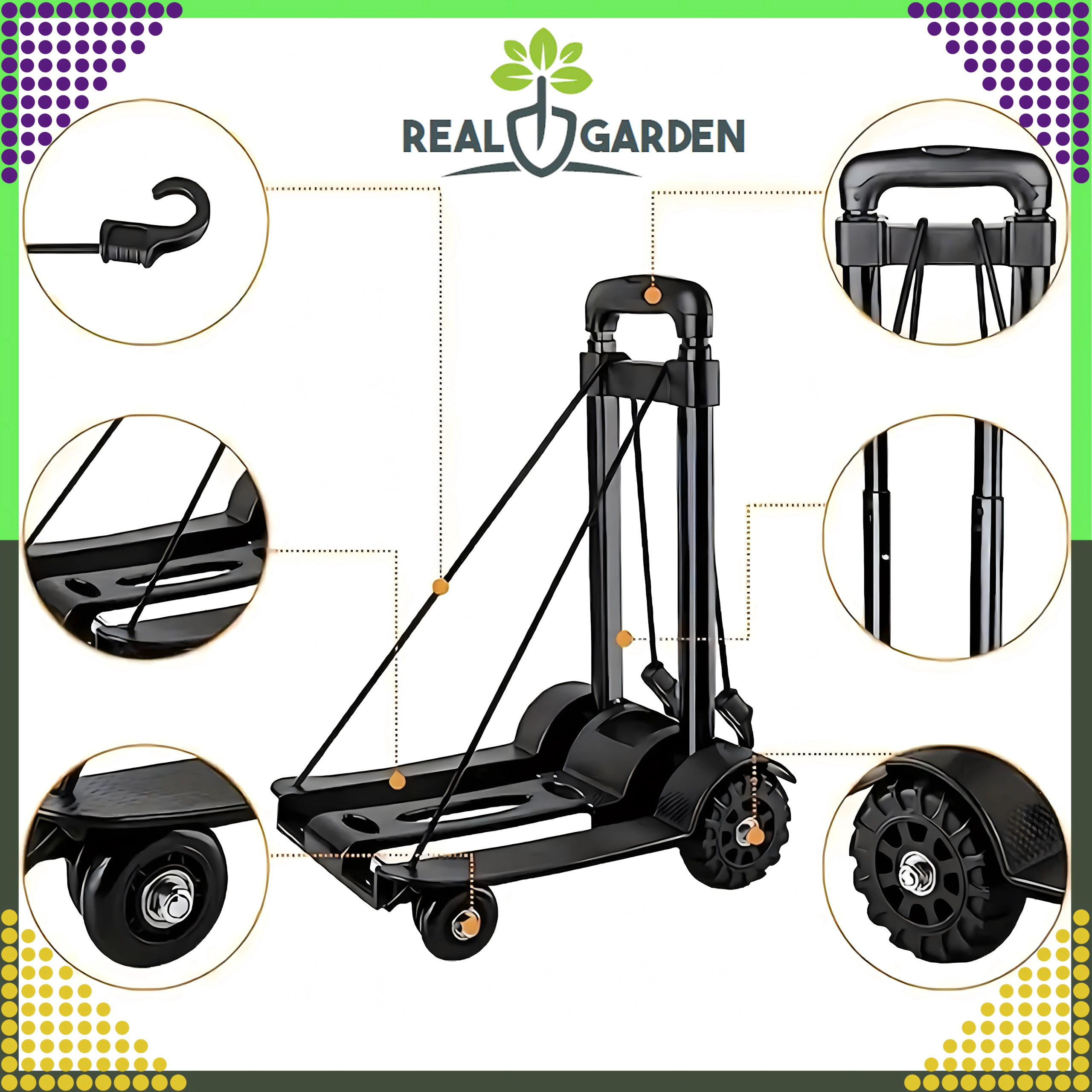 Wózek idealnie sprawdzi się do zakupów, dostarczania paczek, w magazynach i warsztatach. W opakowaniu znajdują się gumowe linki mocujące z hakami, które pewnie utrzymają przewożony ładunek na miejscu i zwiększą bezpieczeństwo obsługi.