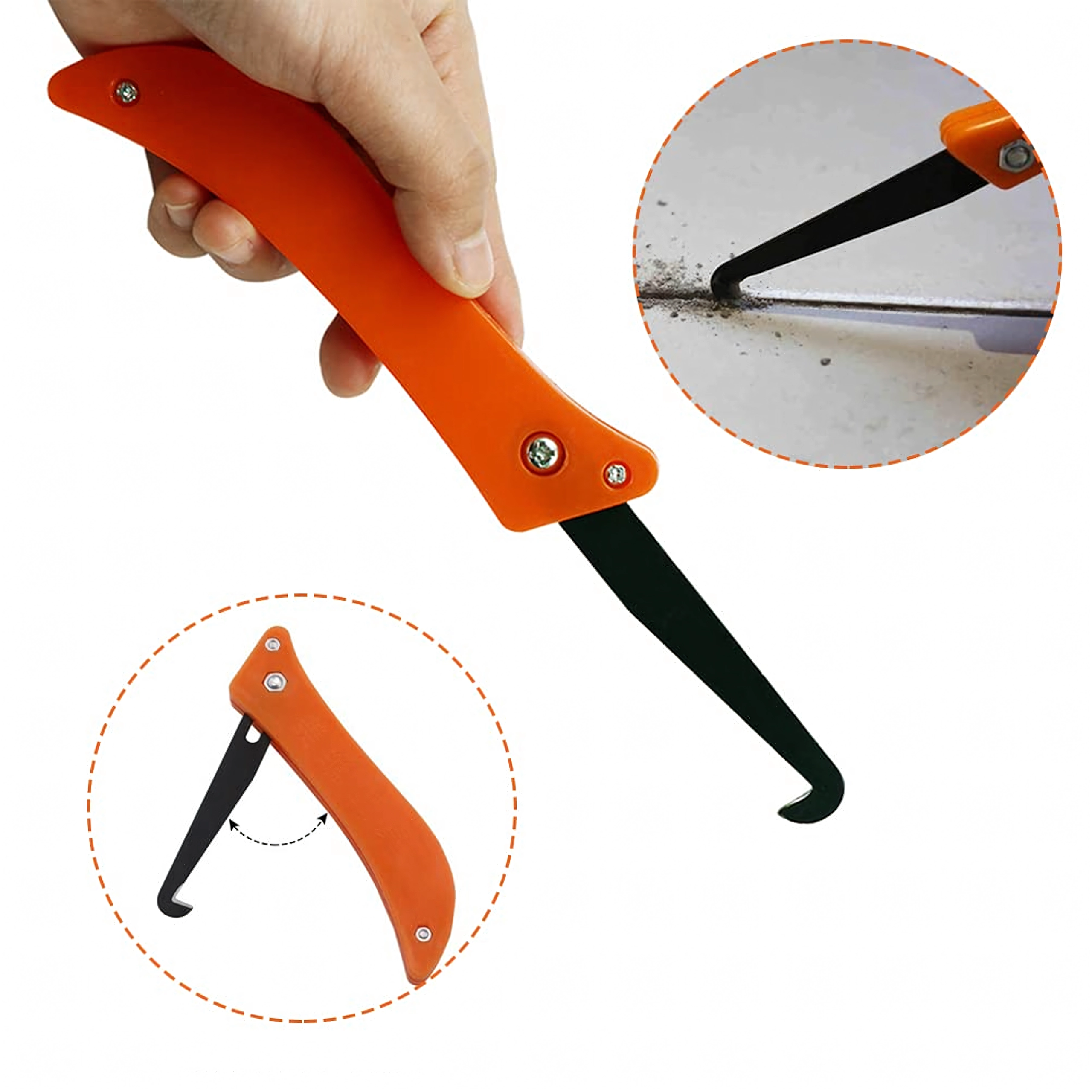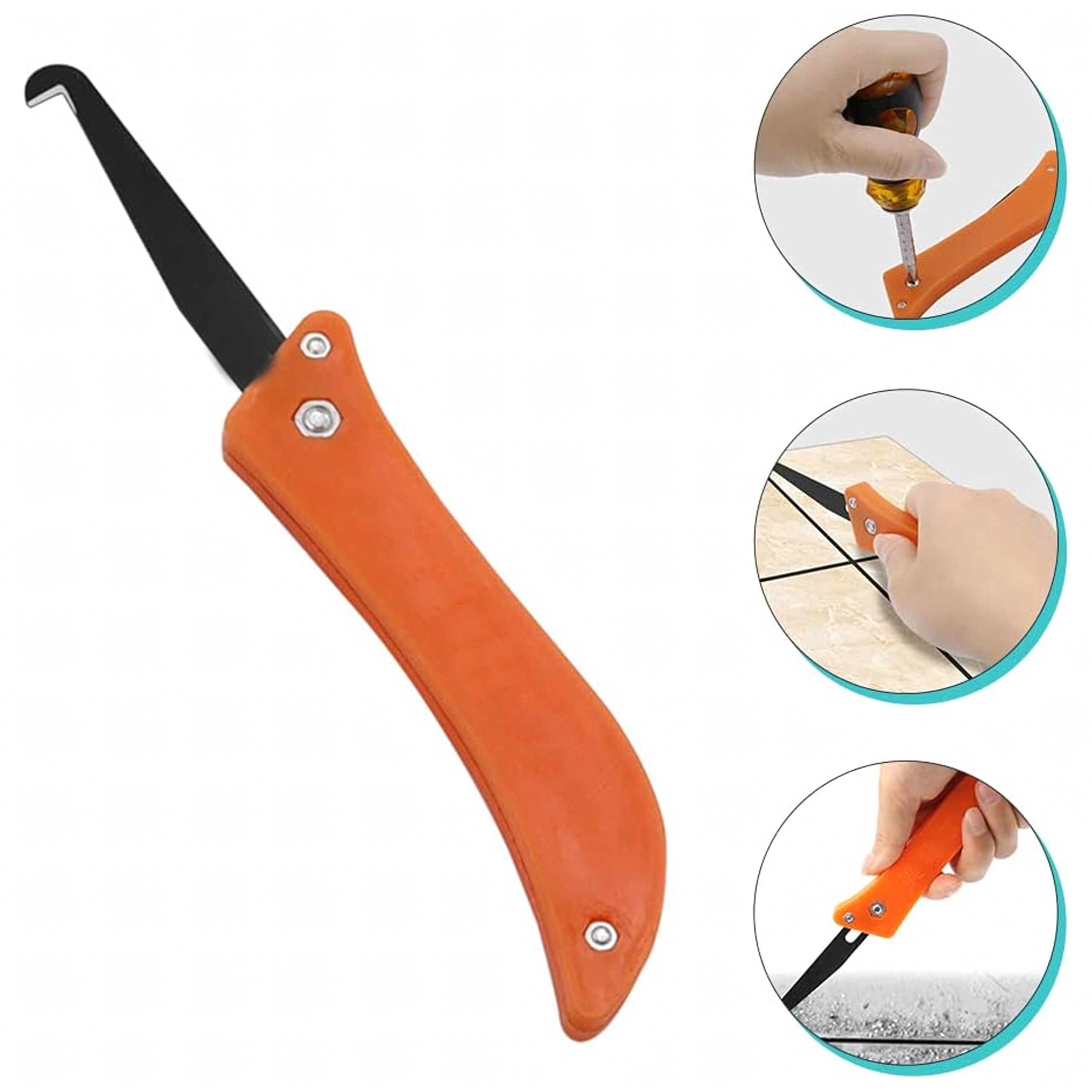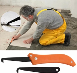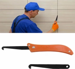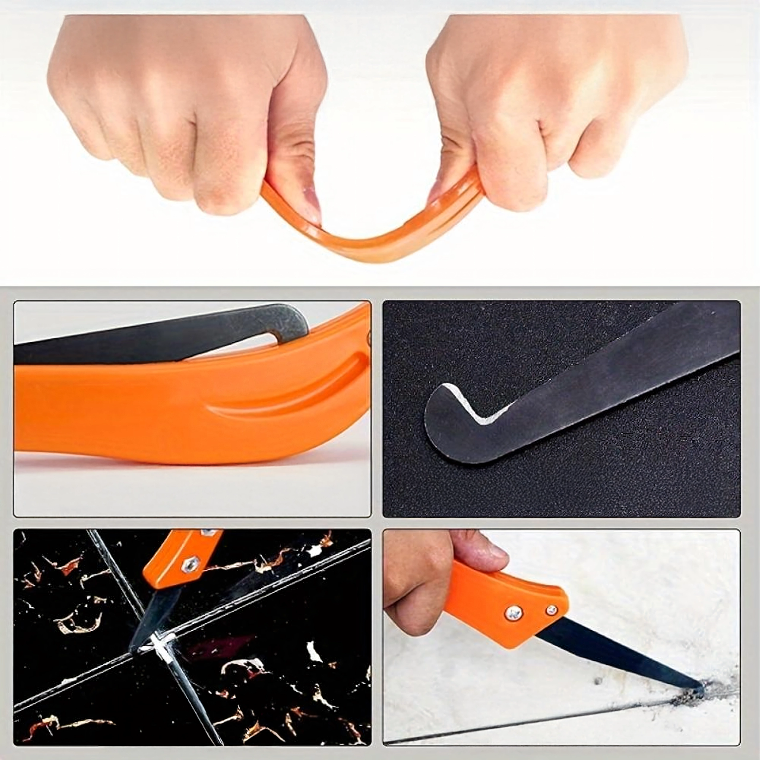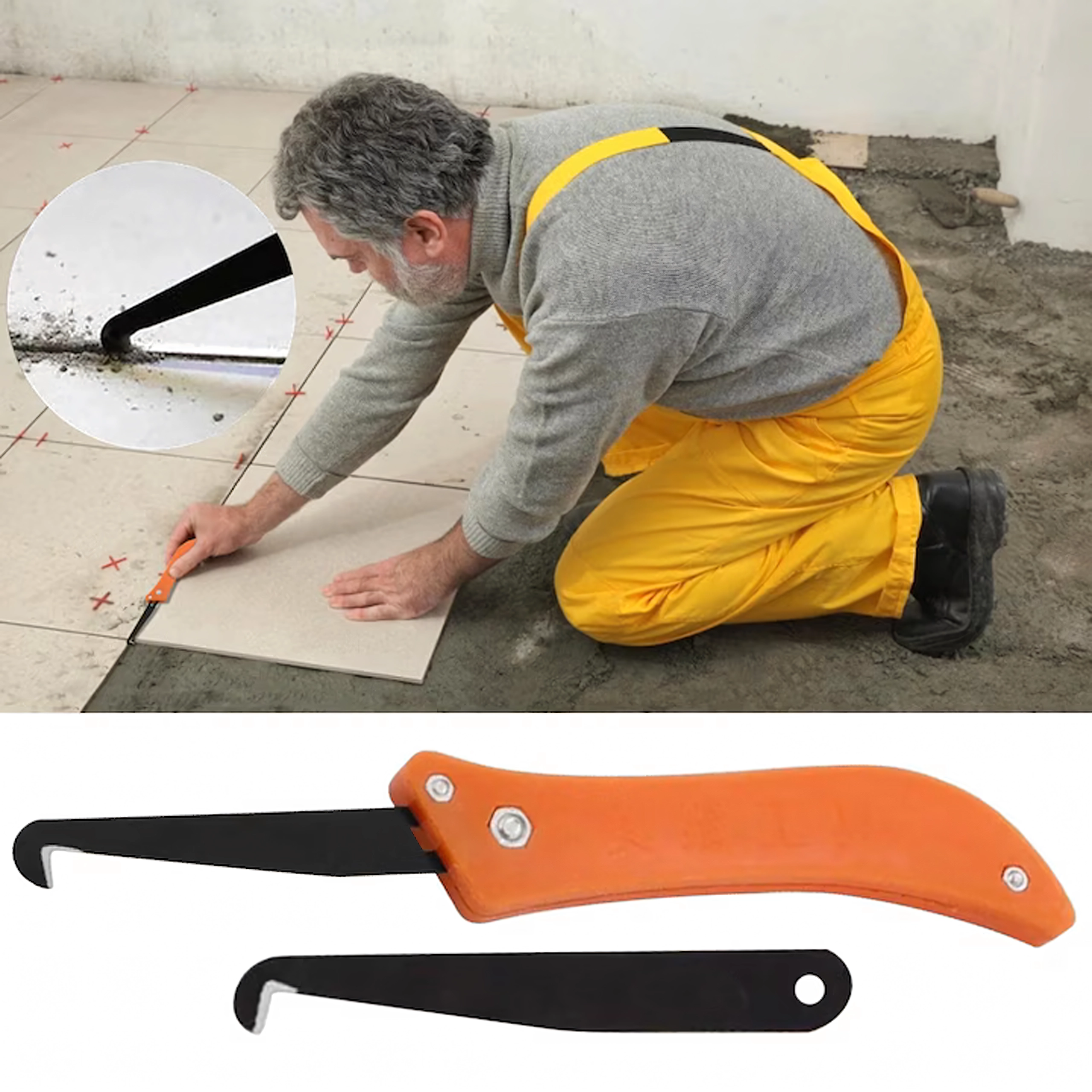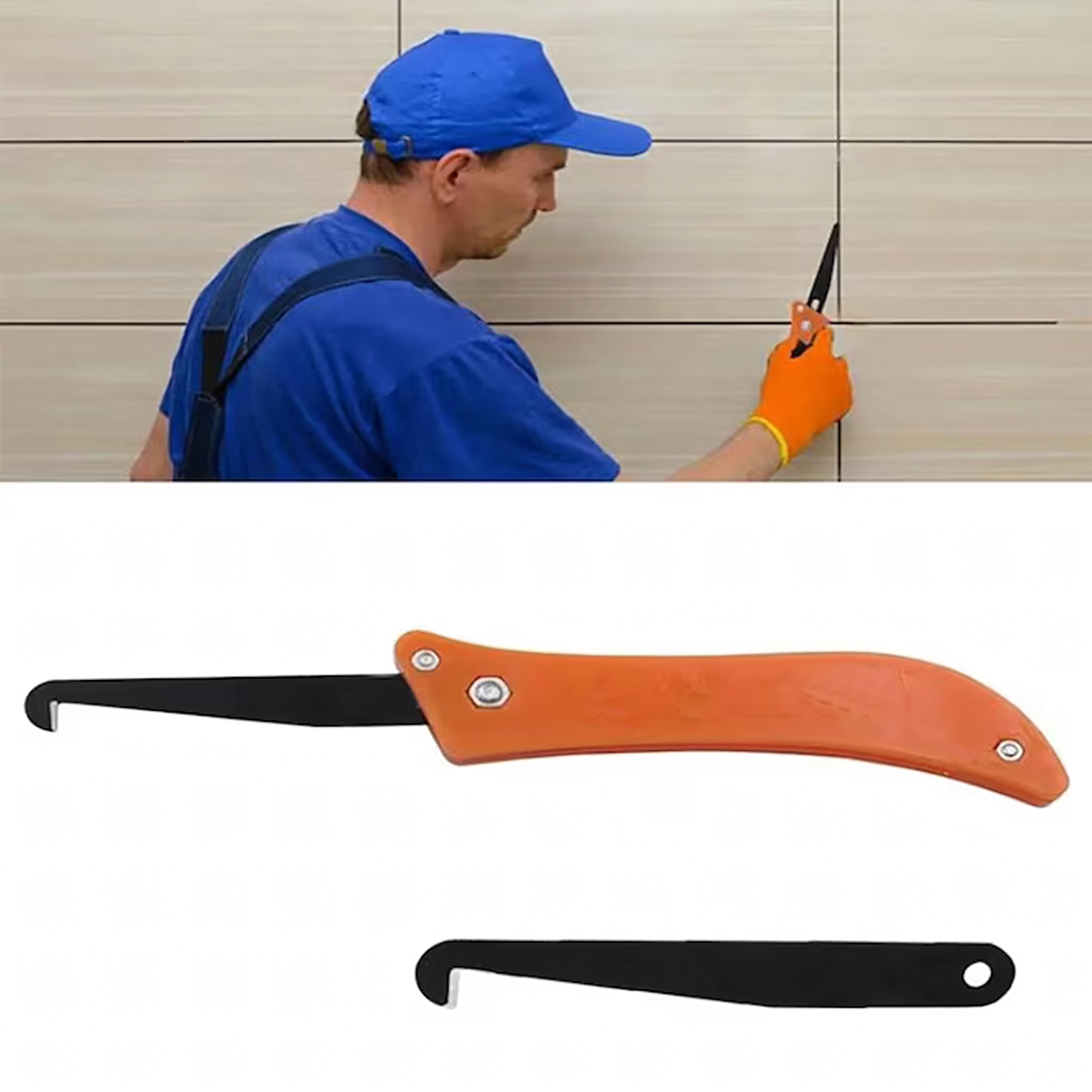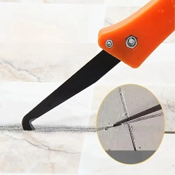 Zagięte, cienkie ostrze łatwo wchodzi w wąskie szczeliny między płytkami i dokładnie usuwa starą fugę, resztki silikonu oraz nagromadzone zanieczyszczenia.