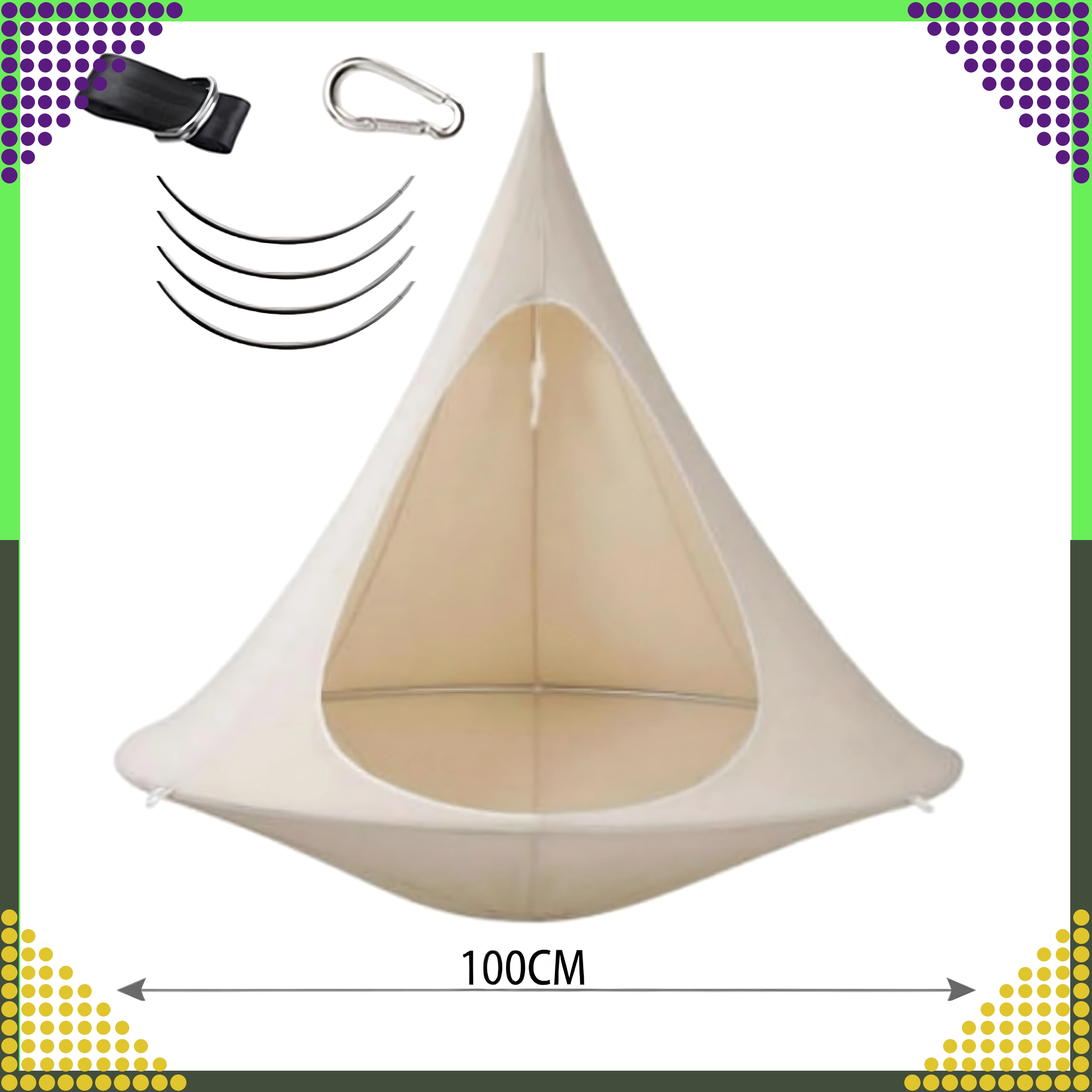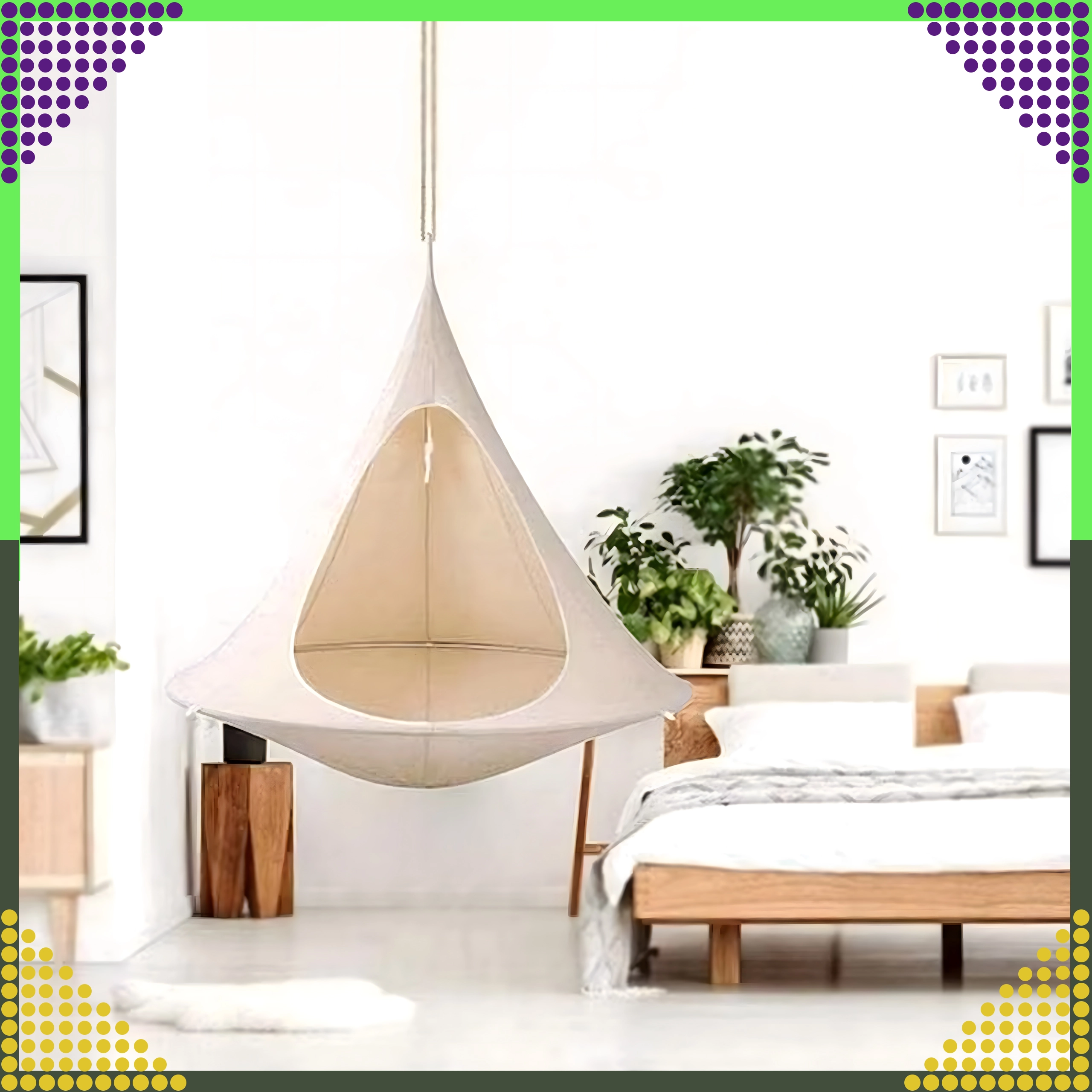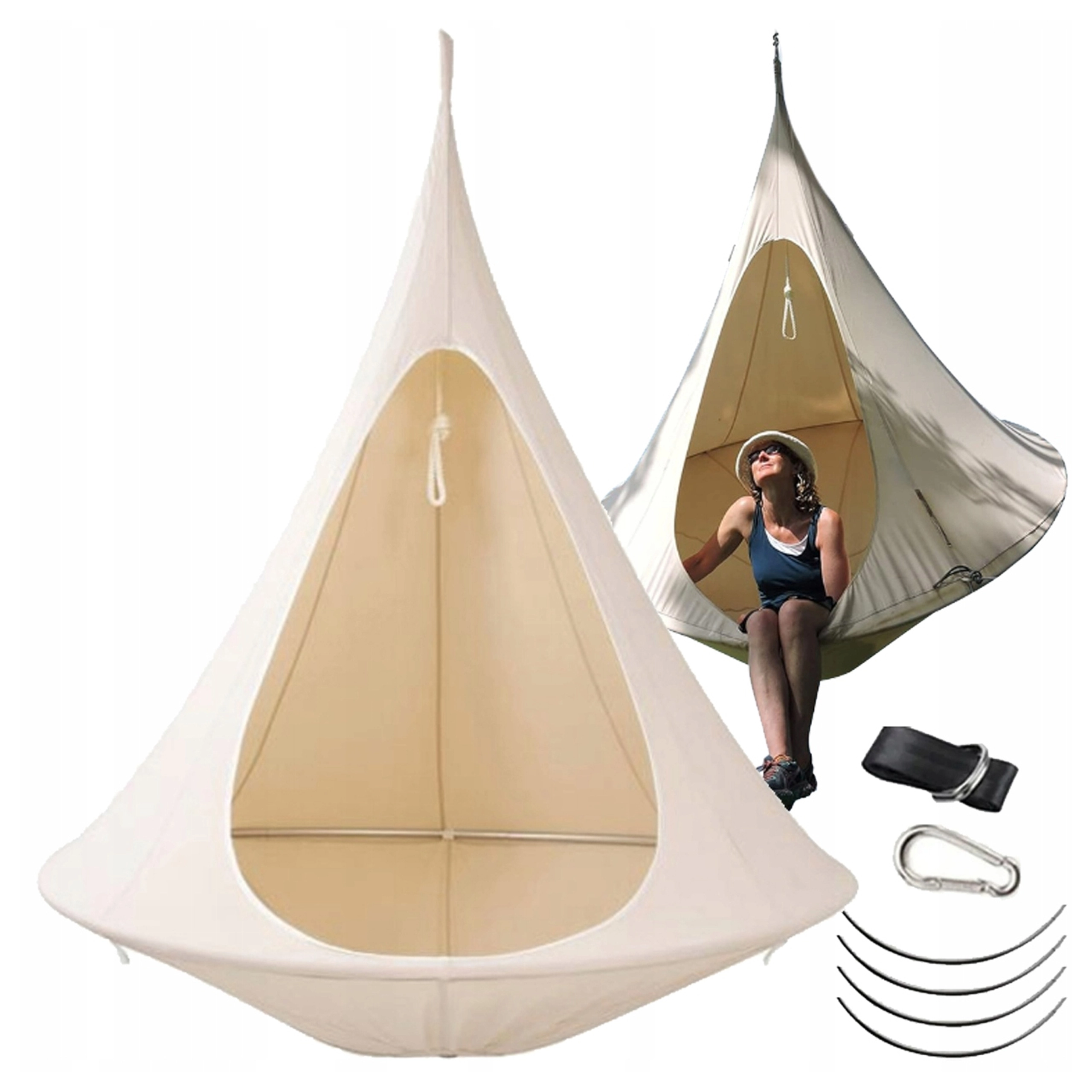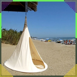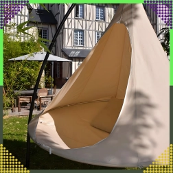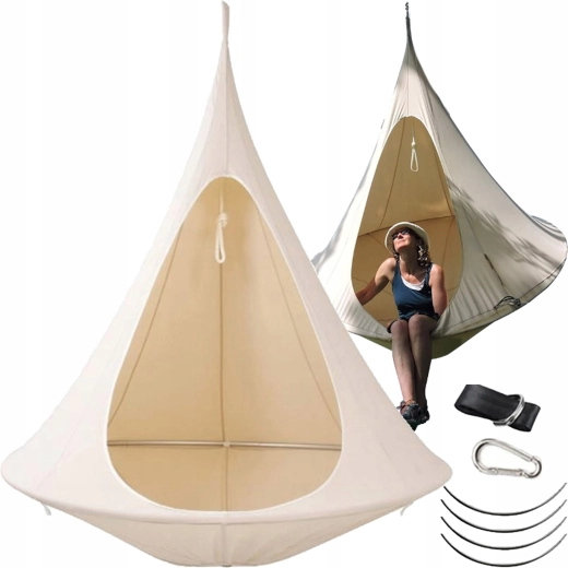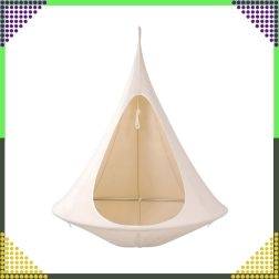 Wiszący hamak w kształcie kokonu tworzy przyjemną, bezpieczną i spokojną przestrzeń do czytania, relaksu lub popołudniowej drzemki. Dzięki oddychającemu materiałowi i trwałemu zawieszeniu na jednym punkcie nadaje się do pokoju dziecięcego, salonu oraz do ogrodu pod drzewem. Beżowy kolor łatwo dopasować do każdego stylu.