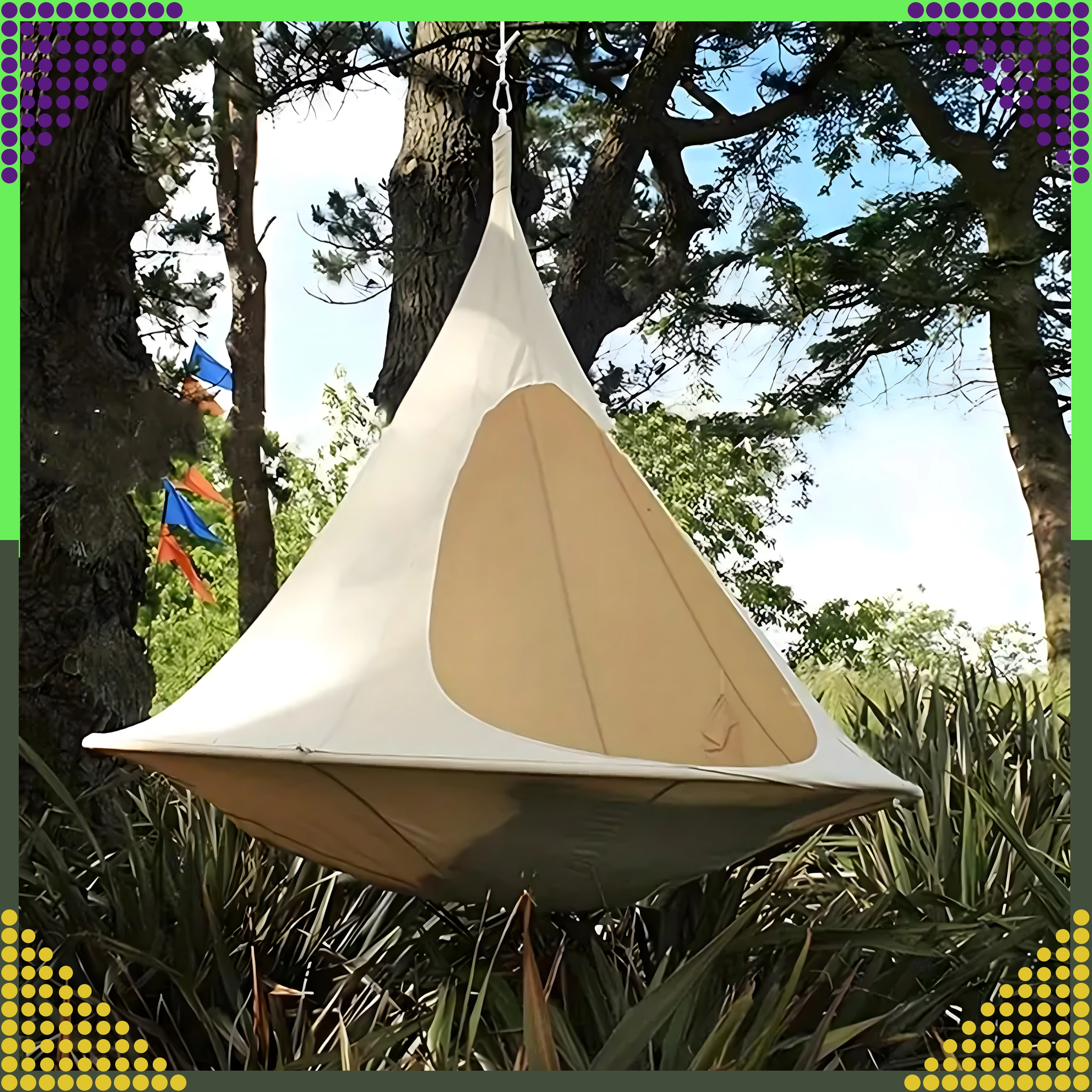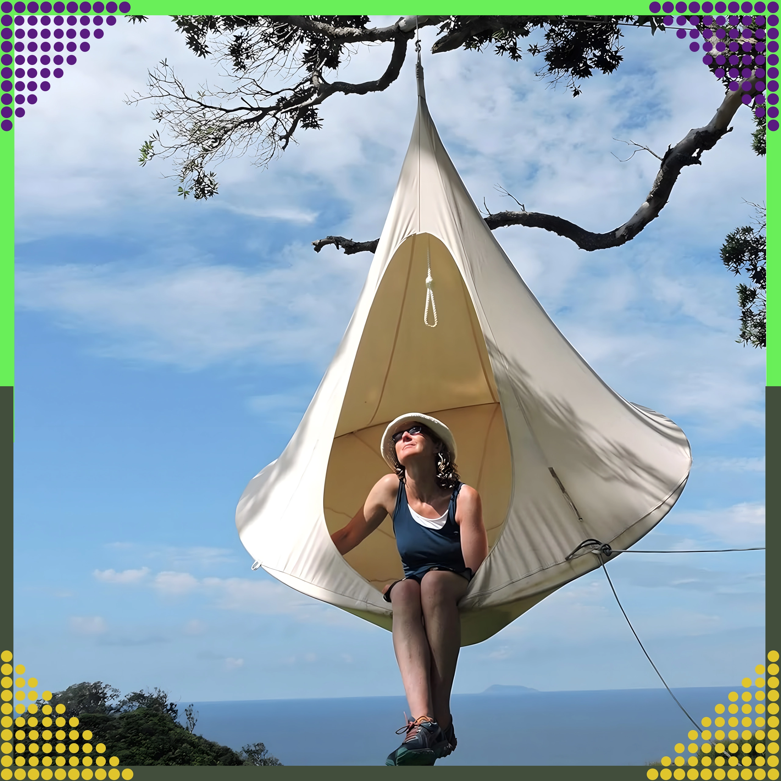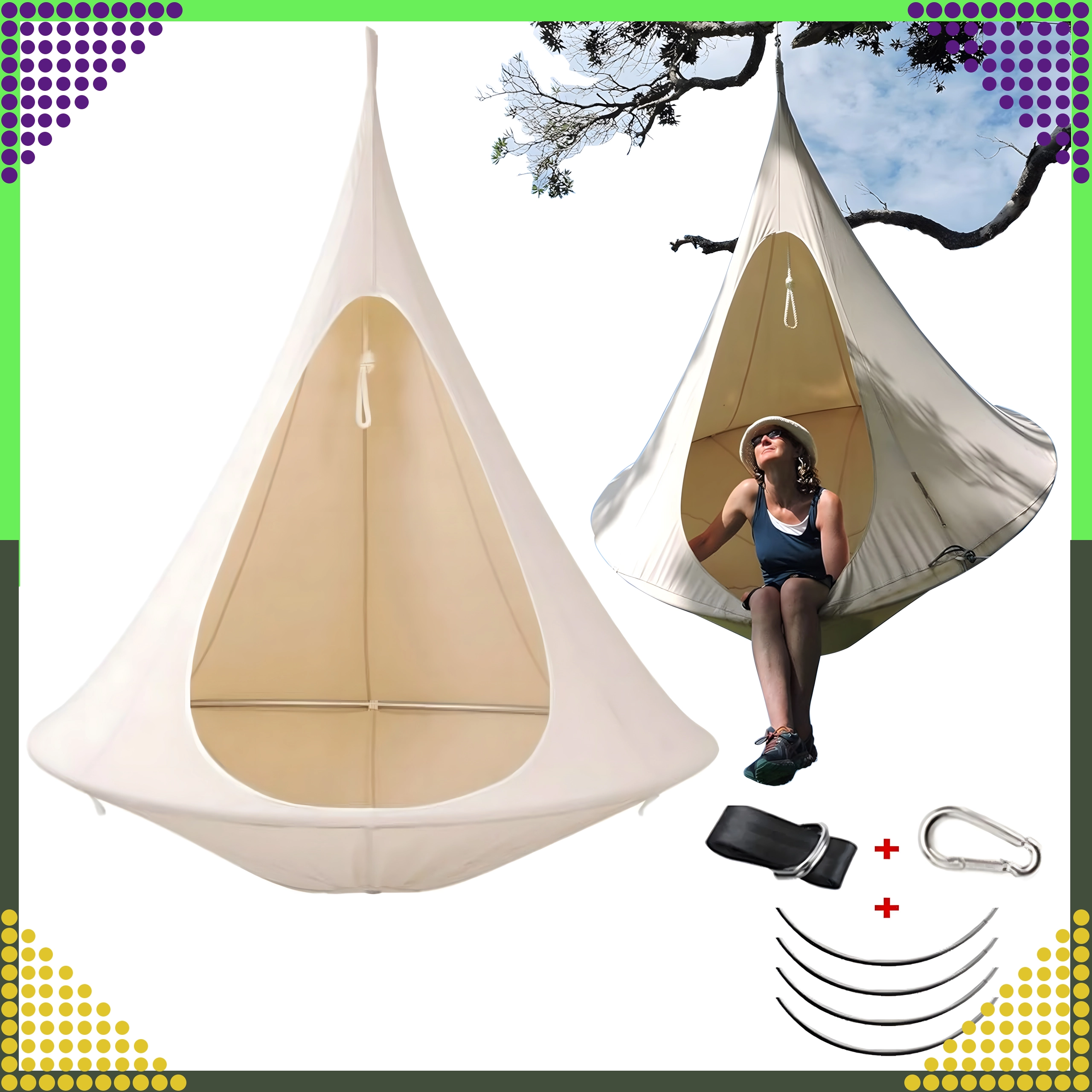 Wiszący hamak w kształcie kokonu tworzy przyjemną, bezpieczną i spokojną przestrzeń do czytania, relaksu lub popołudniowej drzemki. Dzięki oddychającemu materiałowi i trwałemu zawieszeniu na jednym punkcie nadaje się do pokoju dziecięcego, salonu oraz do ogrodu pod drzewem. Beżowy kolor łatwo dopasować do każdego stylu.