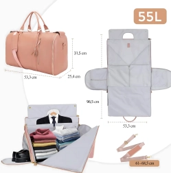 Praktyczna i stylowa torba podróżna 2w1 o pojemności 55 l łączy przestronny weekender/duffel oraz zintegrowany pokrowiec na garnitur lub sukienkę. Jest wodoodporna, wytrzymała i składana, idealna na podróże służbowe, weekendowe wyjazdy oraz business travel – utrzyma Twoje ubrania bez zagnieceń i wszystko przejrzyście zorganizuje.