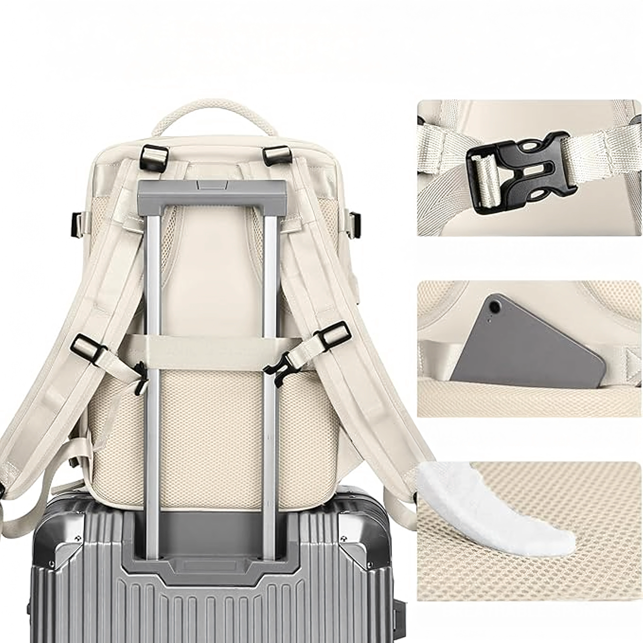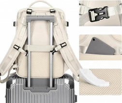 Zintegrowany pas pozwala na nasunięcie plecaka na rączkę walizki. Wyściełane plecy z oddychającej siatki i regulowane szelki zwiększają komfort.