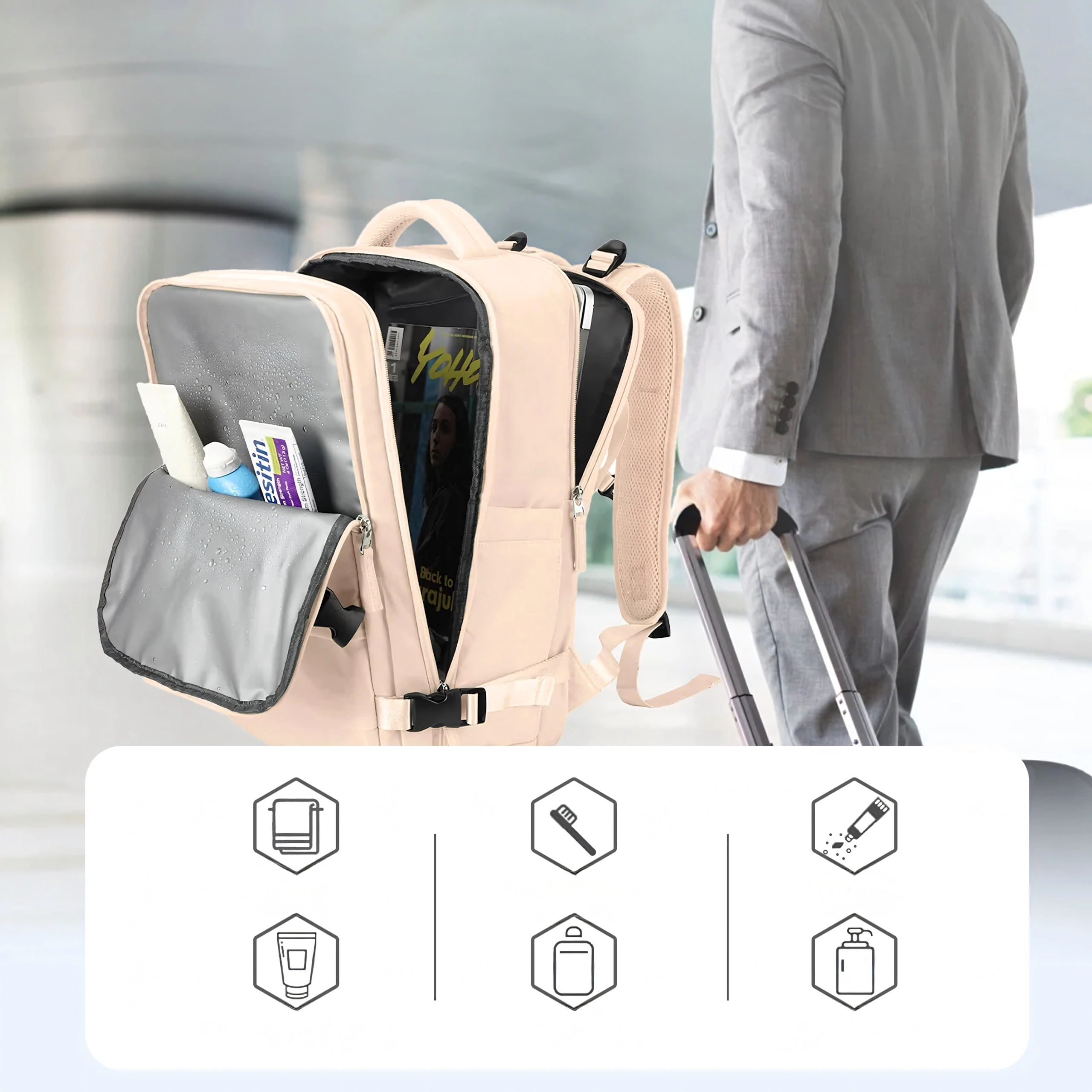 - Wymiary podręczne 46 × 30 × 20 cm odpowiednie dla większości linii lotniczych