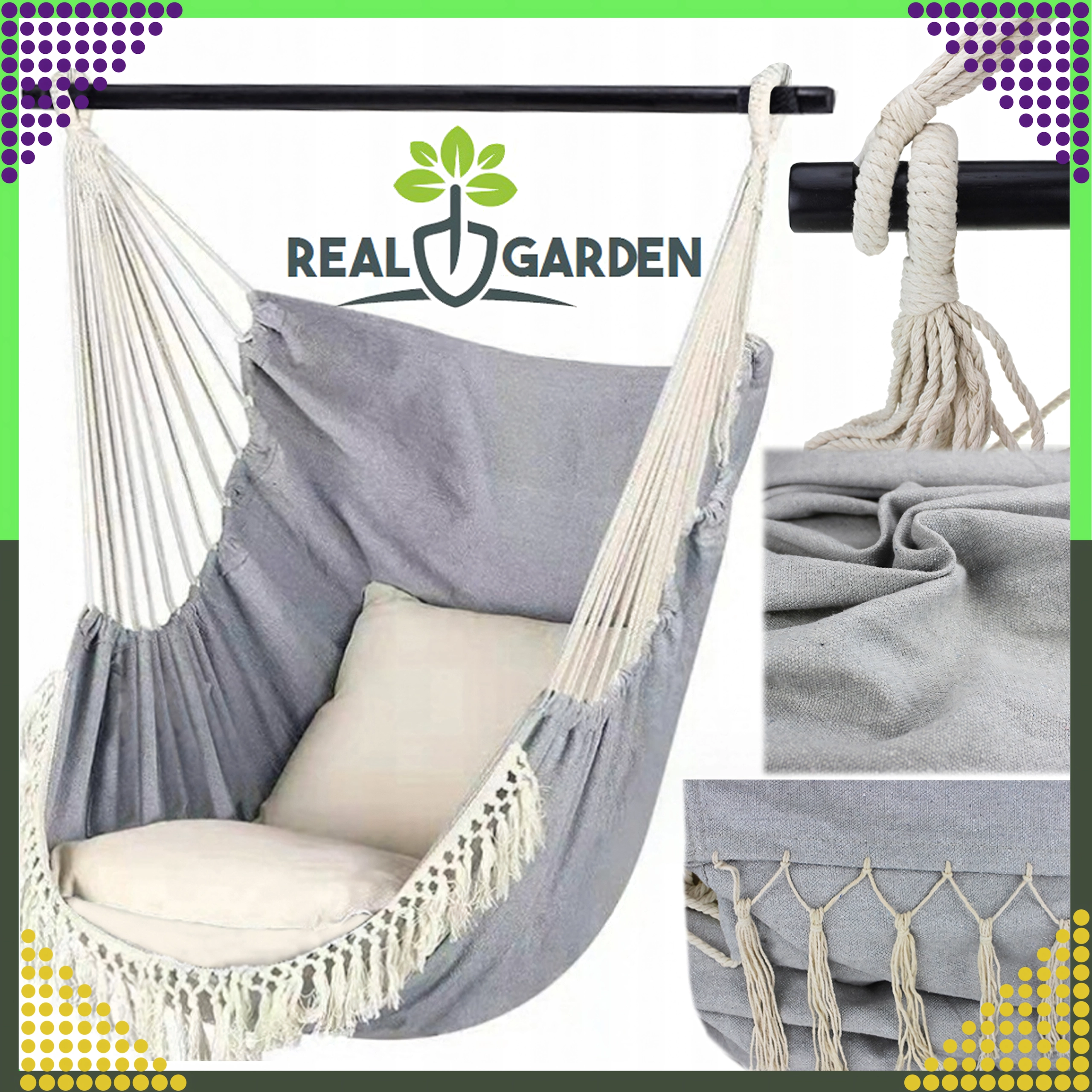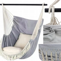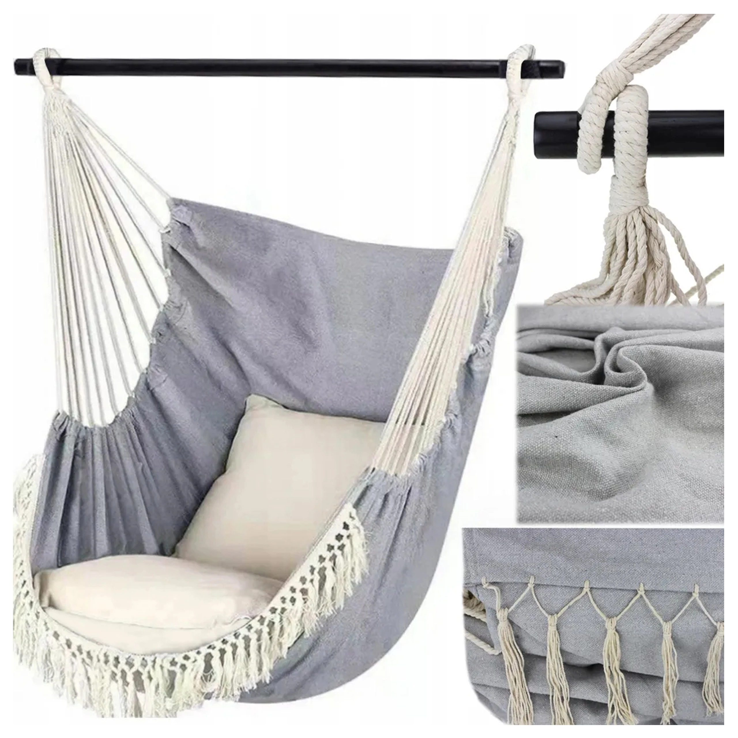 Ciesz się spokojnym relaksem w wygodnym wiszącym fotelu brazylijskim, który łączy nowoczesny styl boho, oddychający i wytrzymały materiał oraz maksymalne obciążenie do 150 kg. Idealny do wnętrz i na zewnątrz, z 2 miękkimi poduszkami i praktyczną torbą do przenoszenia.