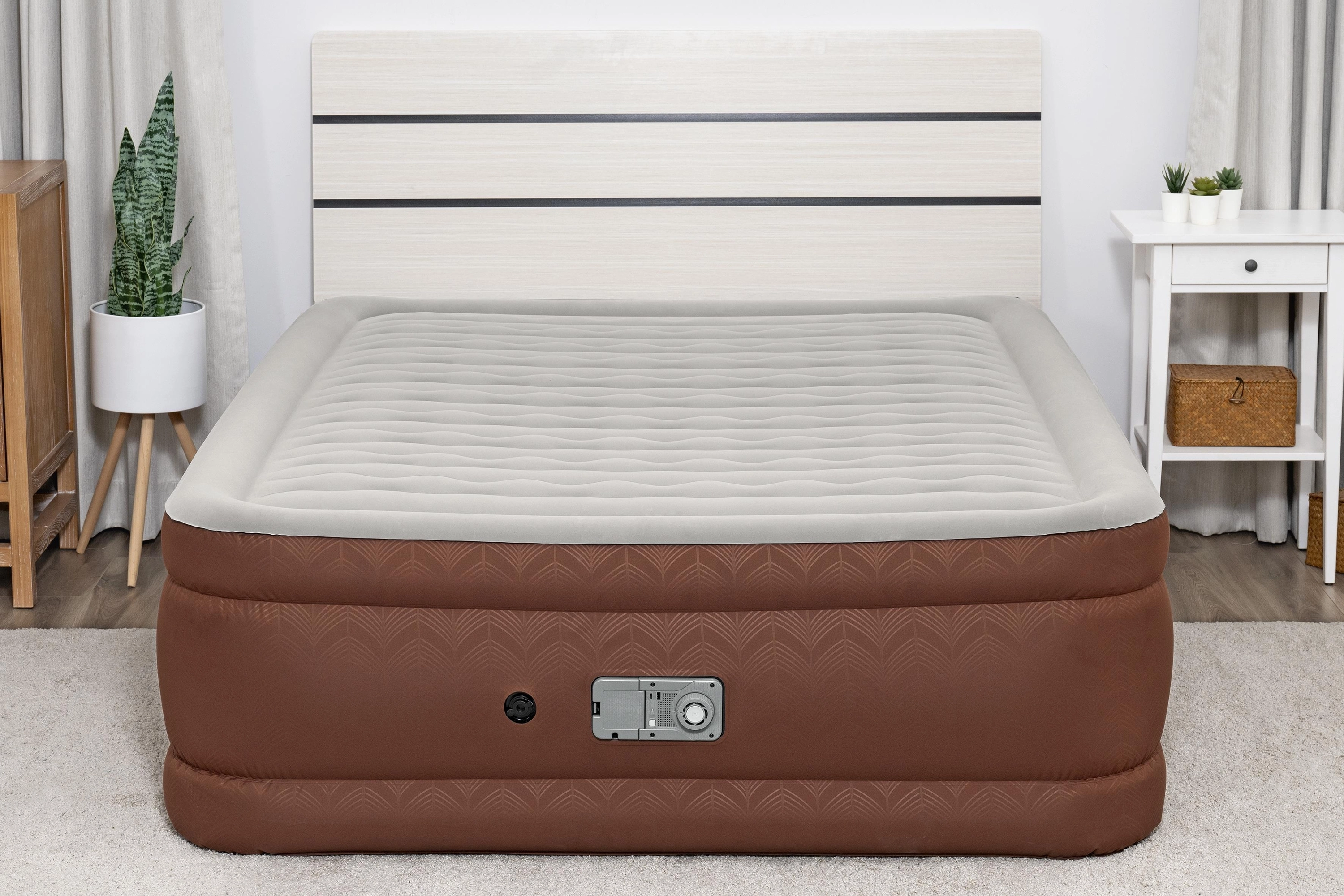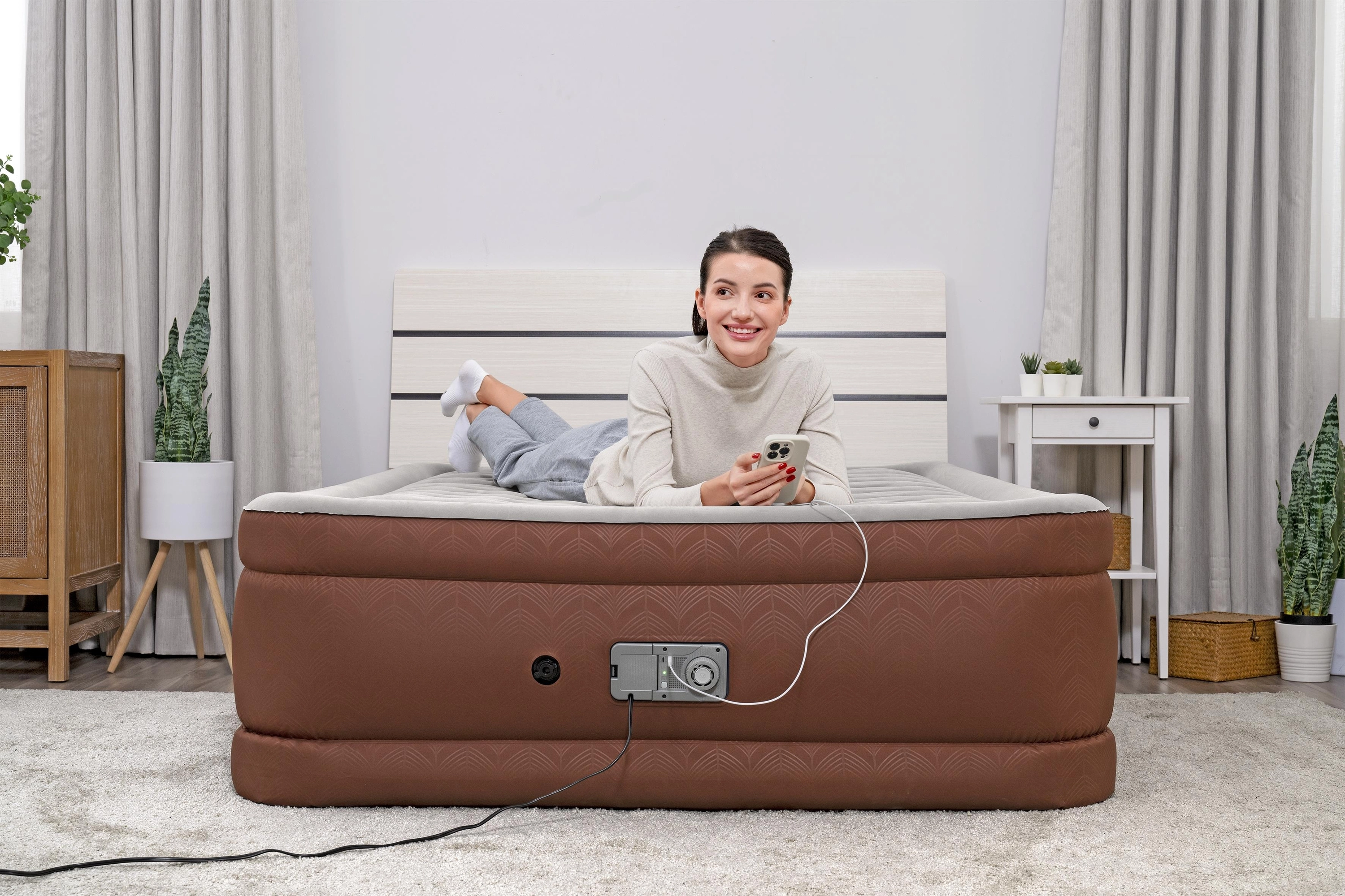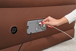 Wbudowana elektryczna pompa (220–240 V) napompuje i wypompuje łóżko w około 3 minuty. Panel sterowania jest czytelny i łatwo dostępny.