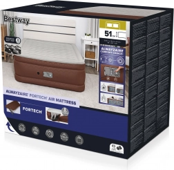 Dmuchane łóżko BESTWAY ALWAYZAIRE Fortech w rozmiarze 203 × 152 × 51 cm zapewnia maksymalny komfort w domu i w podróży. Dzięki technologii AlwayzAire samo automatycznie utrzymuje idealne ciśnienie przez całą noc, ma wbudowaną elektryczną pompę do napompowania w około 3 minuty, przyjemną welurową powierzchnię oraz podwyższoną wysokość 51 cm dla wygodnego wstawania. Wytrzymała konstrukcja Fortech (PVC + poliester) zapewnia długą żywotność i stabilność aż do 350 kg.