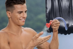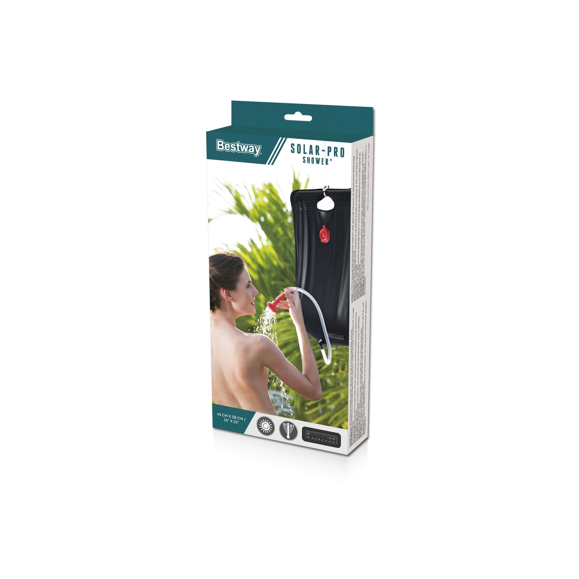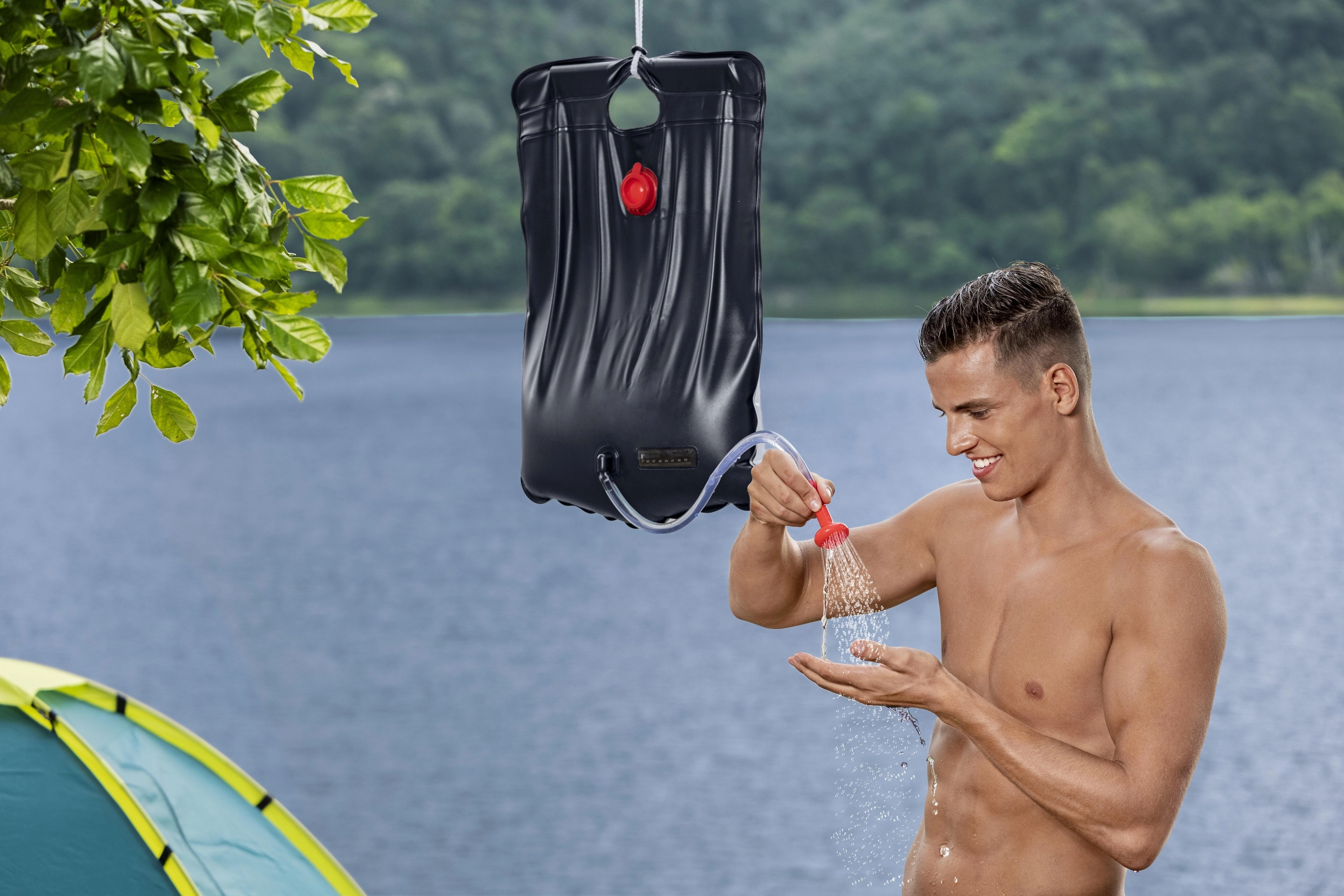 Ciesz się ciepłym prysznicem gdziekolwiek na łonie natury. Przenośny prysznic solarny Bestway podgrzewa do 20 litrów wody do przyjemnych ok. 40 °C w ciągu kilku godzin. Dzięki czarnemu materiałowi dla efektywnego nagrzewania, czytelnemu termometrowi oraz wzmocnionemu uchwytowi łatwo go zawiesić, obsługiwać i przenosić. Po użyciu po prostu złożysz go do kompaktowej formy i zabierzesz wszędzie.