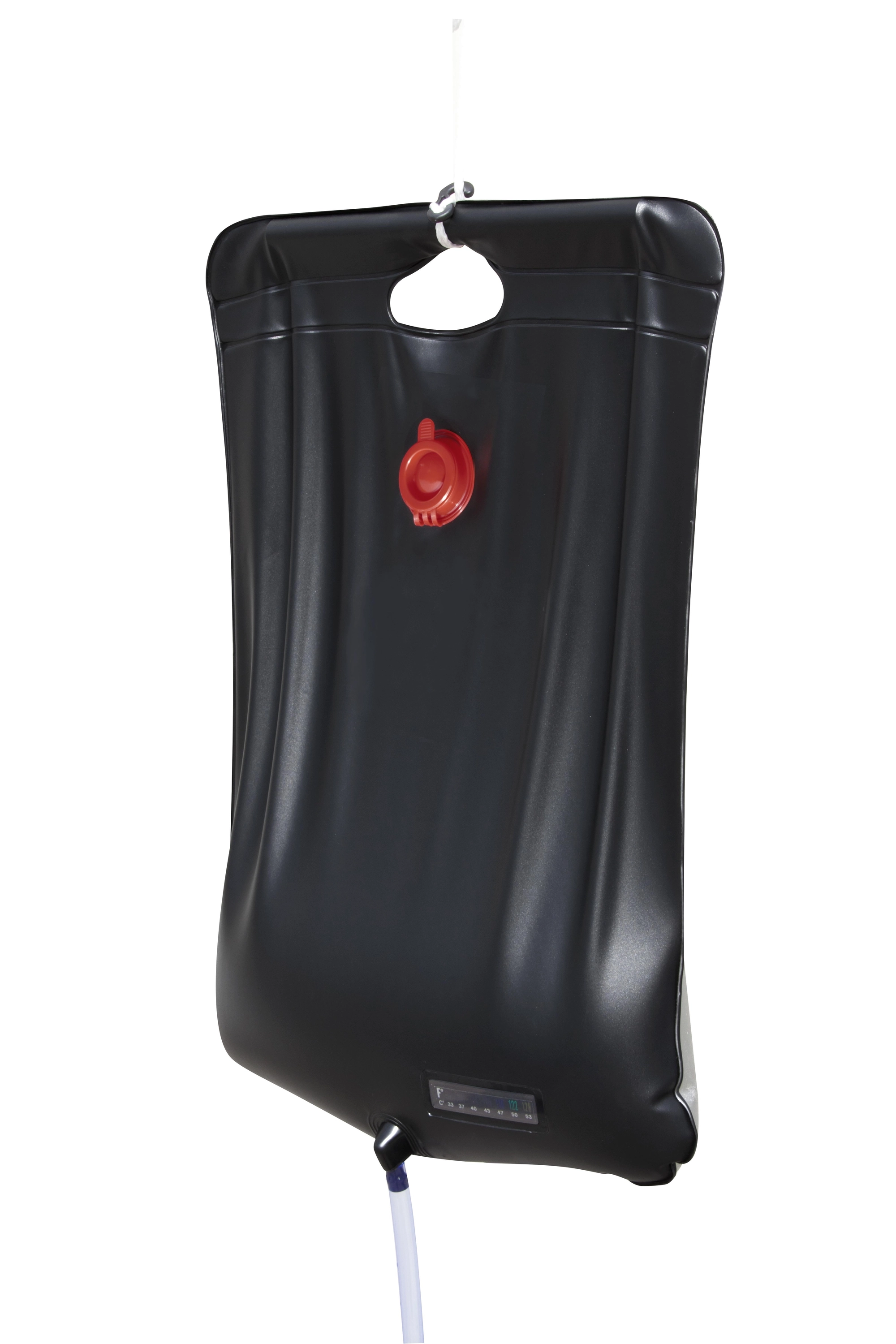 Czarna powierzchnia skutecznie absorbuje promieniowanie słoneczne i podgrzewa do 20 l wody do około 40 °C – idealnie do komfortowego prysznica na kempingu lub nad wodą.