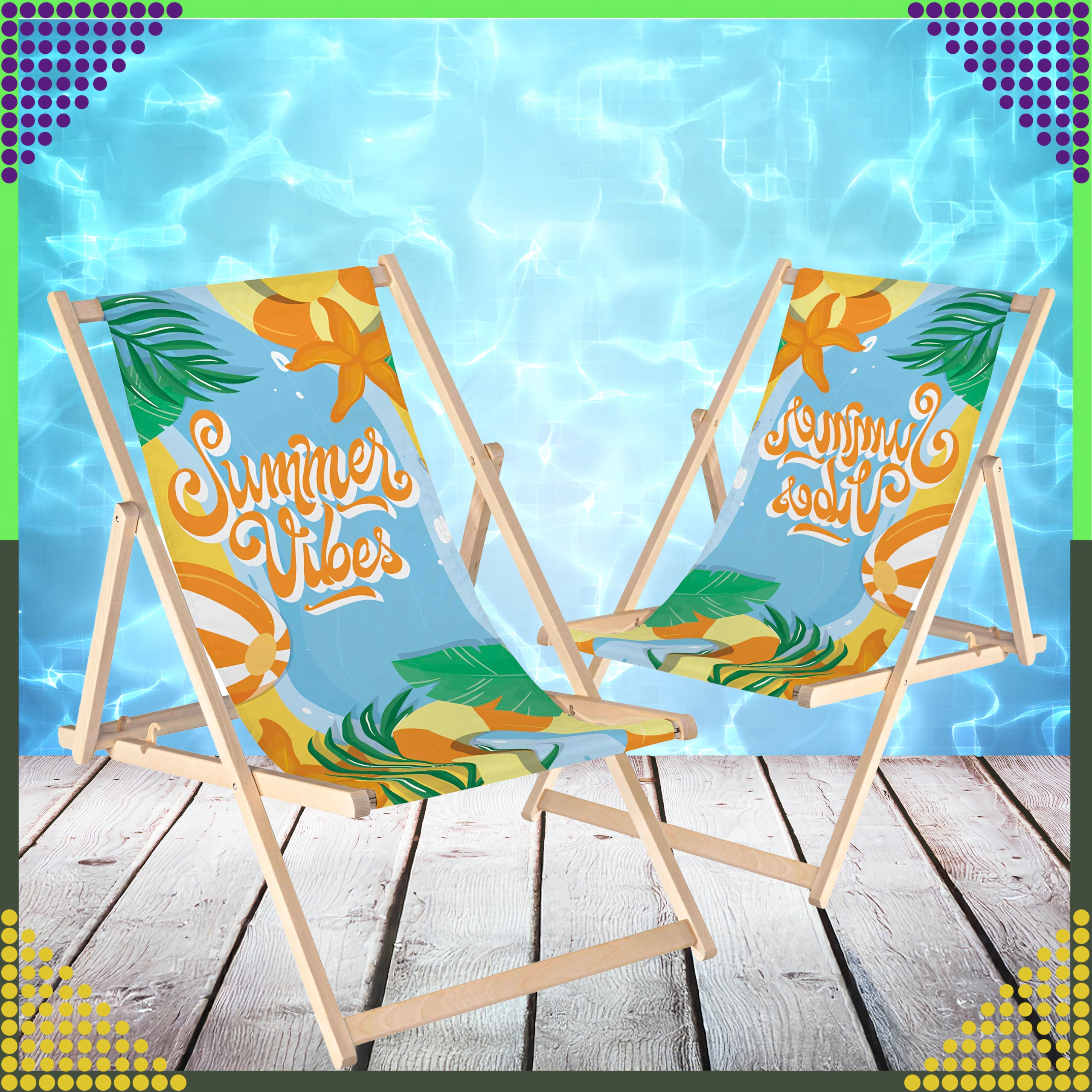 Leżaki mają stabilną drewnianą ramę z gładką powierzchnią oraz wytrzymałe tekstylne siedzisko. Mechanizm składania umożliwia szybkie złożenie i przenoszenie na kemping, kąpielisko czy na wakacje.