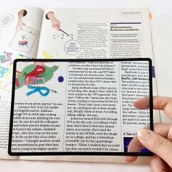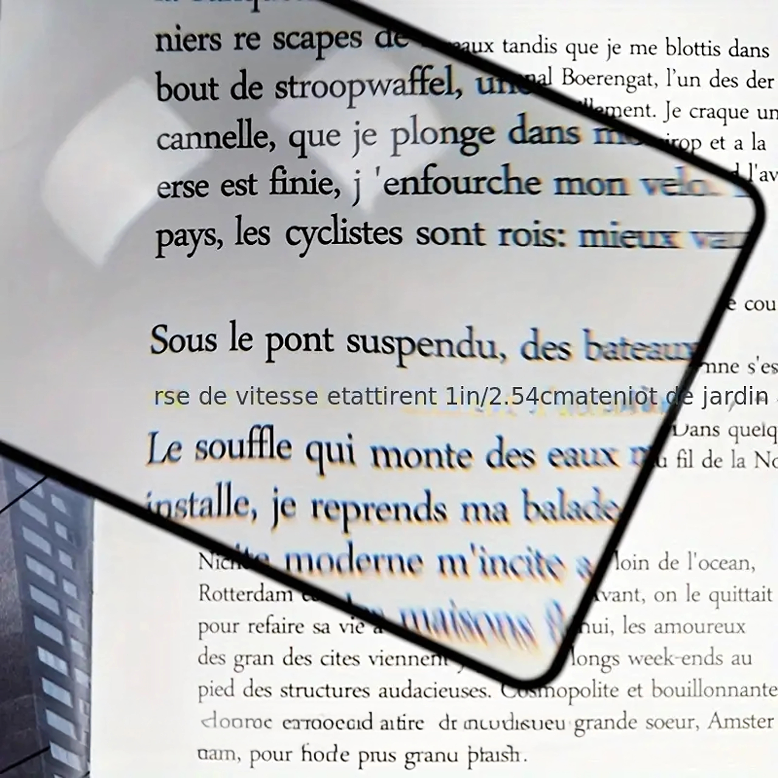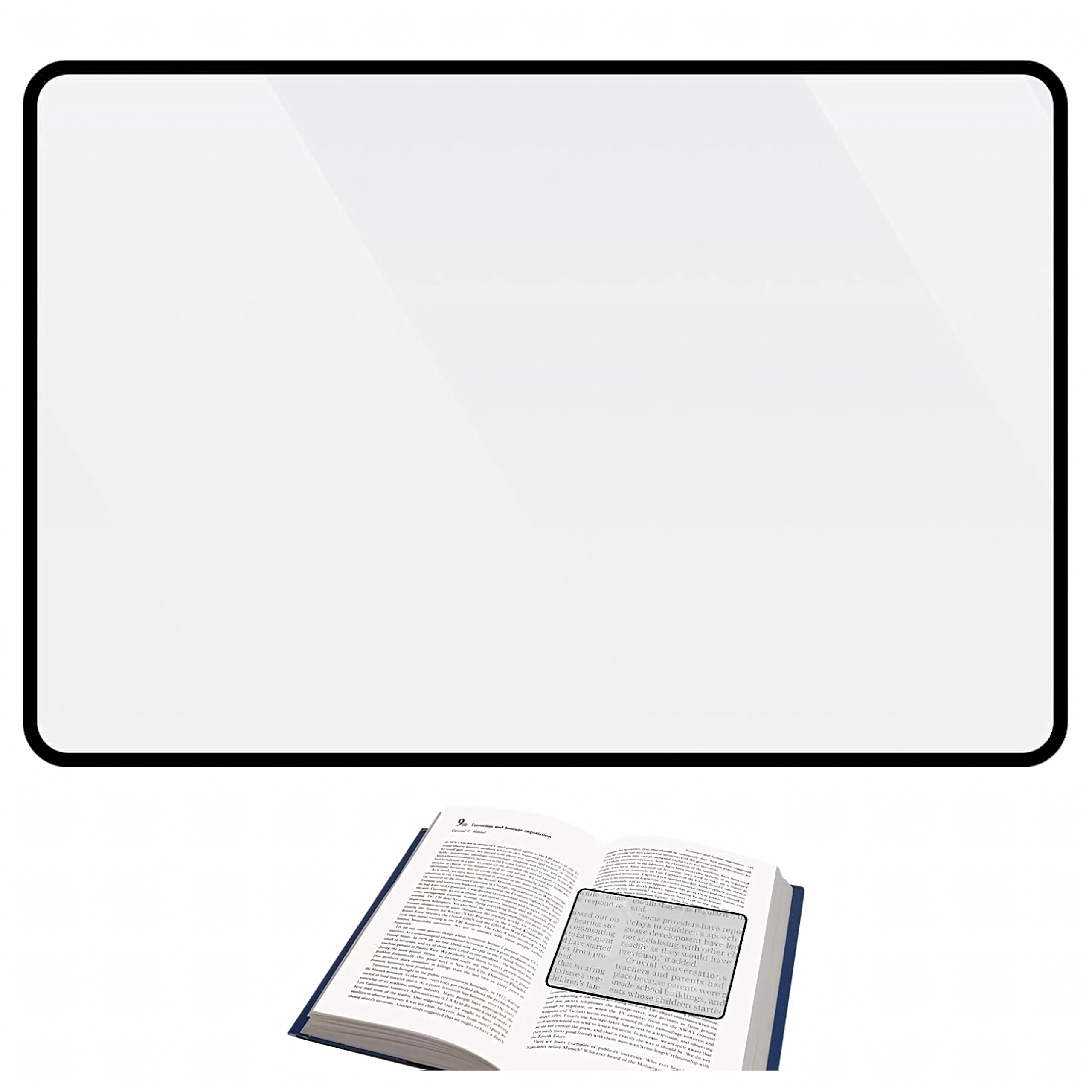 Prostokątna soczewka pokrywa dużą część strony, dzięki czemu widzisz powiększony tekst bez ciągłego przesuwania lupy.