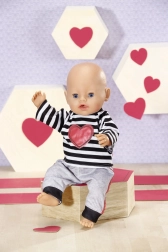 Ubranka Dolly Moda zostały zaprojektowane tak, aby można je było łatwo łączyć i pożyczać między różnymi lalkami. Ten paskowany dres z bluzą i spodniami jest idealny zarówno do wygodnej domowej zabawy, jak i stylowych wyjść lalki. Wyraziste serce na czarno-białych paskach oraz stonowane szare spodnie z kontrastowymi detalami nadają stylizacji nowoczesny wygląd.