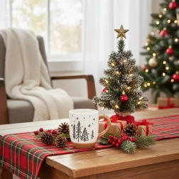 Wnieś do swojego domu świąteczną atmosferę z eleganckim ceramicznym kubkiem zdobionym minimalistycznymi choinkami. Połączenie białej glazury z beżowym uchem i podstawą prezentuje się gustownie i ponadczasowo, dzięki czemu kubek pasuje do każdego nakrycia stołu.