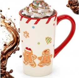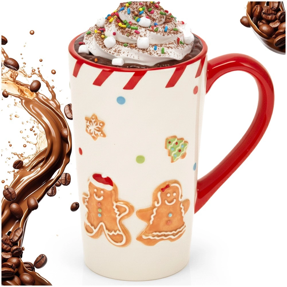 Wprowadź do domu świąteczny nastrój z wysokim ceramicznym kubkiem zdobionym wypukłymi motywami pierniczków, płatków śniegu i choinki. Kontrastowe czerwone ucho i rant nadają kubkowi wyrazisty wygląd, a wysoki kształt oferuje hojną pojemność 570 ml na ulubione ciepłe napoje.