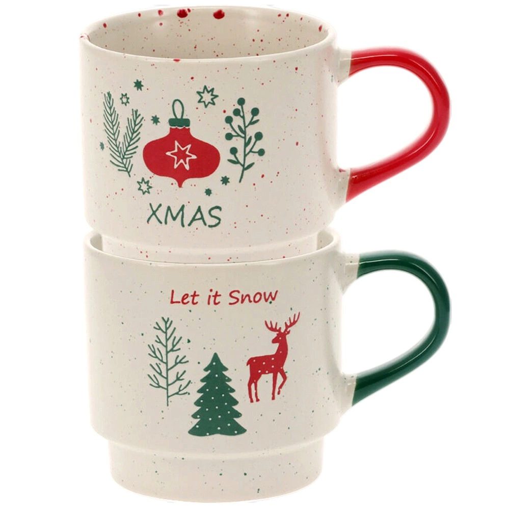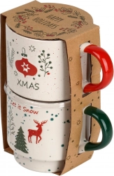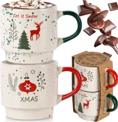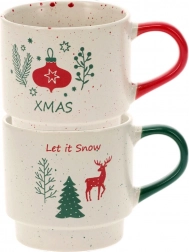 Wprowadź do domu świąteczny nastrój dzięki eleganckiemu zestawowi dwóch kamionkowych kubków o pojemności 350 ml. Każdy kubek zdobią świąteczne motywy i napisy LET IT SNOW oraz STAY WARM, ma wygodne ucho, wytrzymałe wykonanie i jest odpowiedni do zmywarki i kuchenki mikrofalowej. Dzięki możliwości układania w stos oszczędza miejsce i świetnie sprawdzi się do herbaty, kawy i gorącej czekolady.