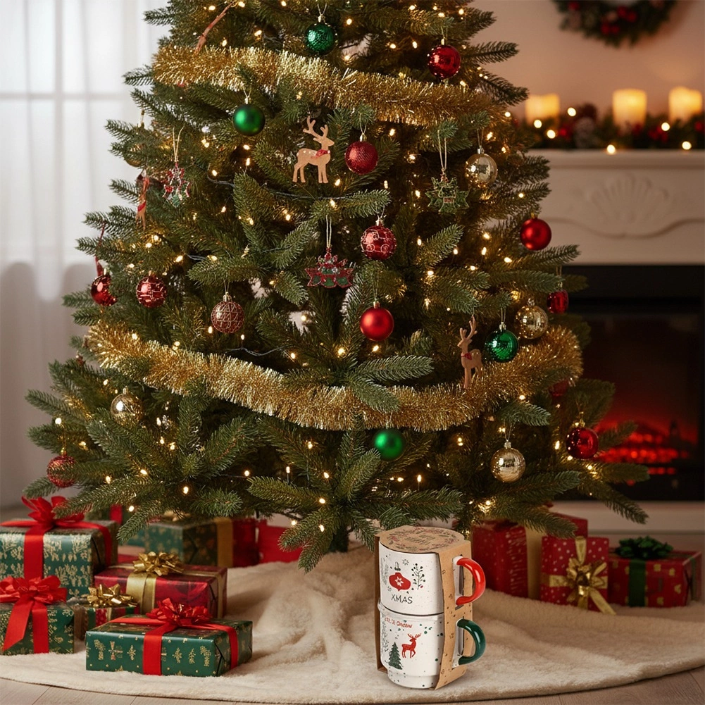 Odkryj urok zimowych chwil z zestawem dwóch wysokiej jakości kamionkowych kubków w beżowym wykończeniu z czerwonymi i zielonymi detalami. Dzięki solidnemu materiałowi doskonale utrzymują ciepło, są przyjemne w dłoni, a ich ponadczasowy kształt pasuje do każdej kuchni. Idealne jako stylowy prezent dla bliskich lub praktyczne uzupełnienie Twojej świątecznej zastawy.