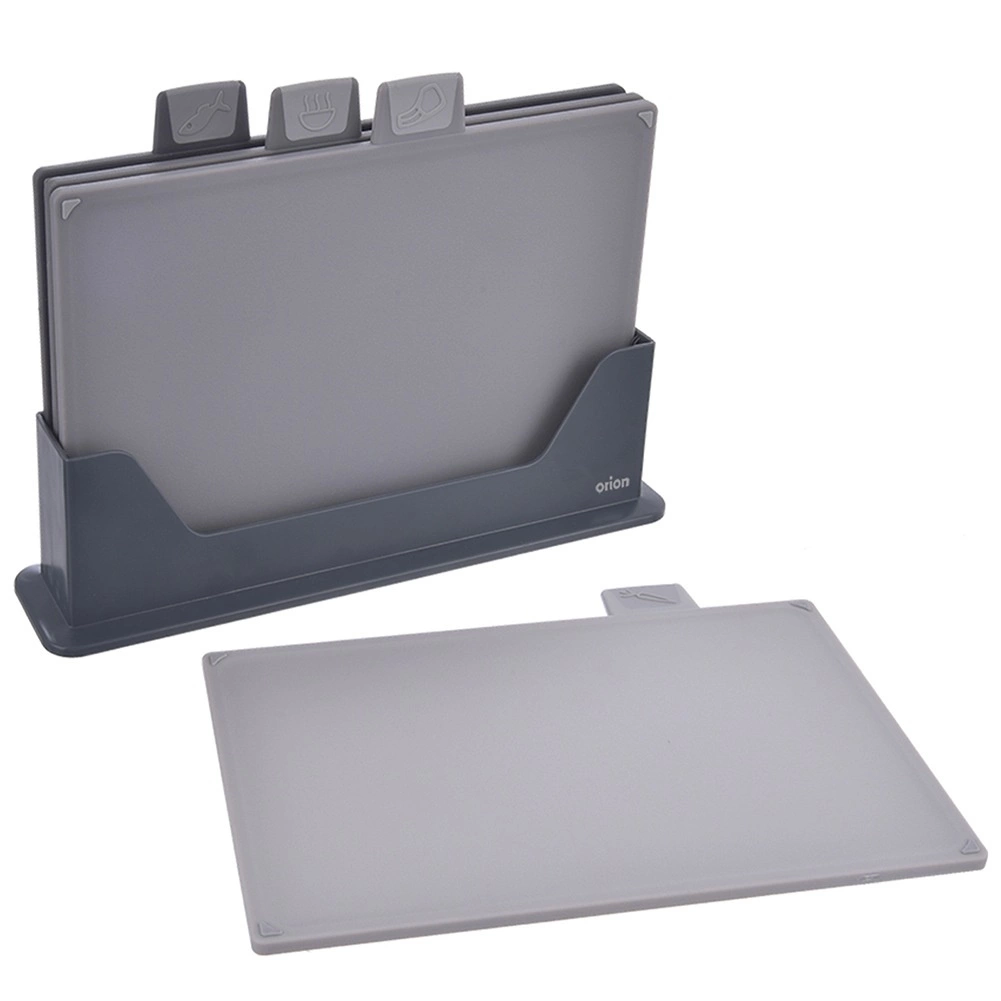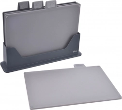 Deski wykonane są z wysokiej jakości, nieporowatego plastiku, są dwustronne i mają specjalnie ukształtowaną powierzchnię, która pomaga zatrzymywać soki z żywności. Antypoślizgowe podkładki po obu stronach zapewniają stabilność na blacie. Praktyczny stojak z wyprofilowanymi rowkami i piankowymi nóżkami zapobiega przesuwaniu i chroni powierzchnię roboczą przed zarysowaniami.
