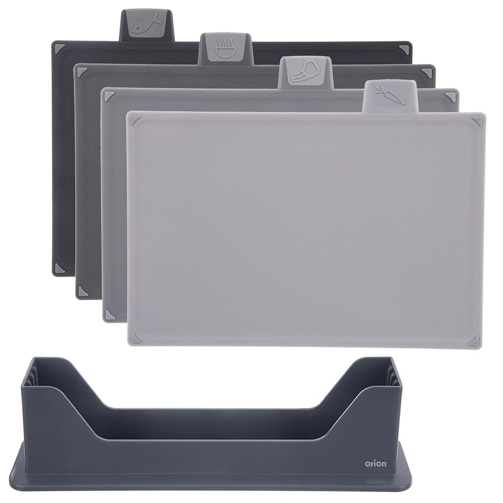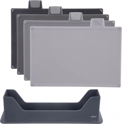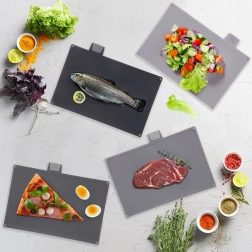 Ten zestaw 4 desek w odcieniach szarości został zaprojektowany do codziennego gotowania z naciskiem na higienę i organizację. Graficzne etykiety na górnych zakładkach wyraźnie wskazują zastosowanie do warzyw, surowego mięsa, dań gotowych i ryb, dzięki czemu łatwo utrzymasz czystość i porządek podczas przygotowywania potraw.