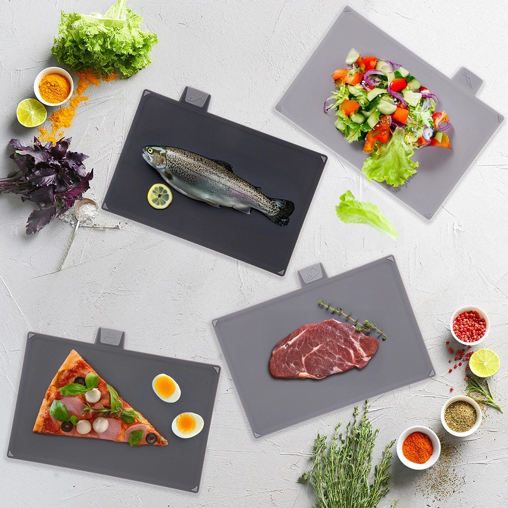 Cztery deski z ikonami dla ryb, mięsa, warzyw i dań gorących pomagają zapobiegać krzyżowej kontaminacji i utrzymują przygotowanie potraw w porządku.