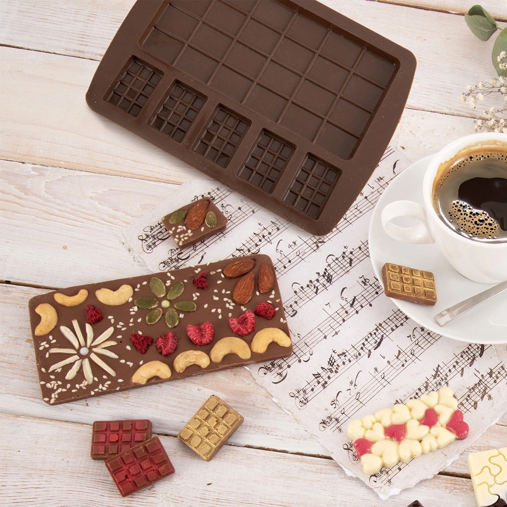 Z tą uniwersalną formą z wysokiej jakości silikonu przygotujesz efektowne tabliczki i mini pralinki z orzechami, suszonymi owocami czy ciasteczkami. Elastyczny materiał jest solidny, trwały i nieprzywierający, dzięki czemu gotowe kawałki łatwo wyjmiesz bez uszkodzeń. Forma ma wymiary całkowite 18,5 × 13,5 × 1,5 cm.