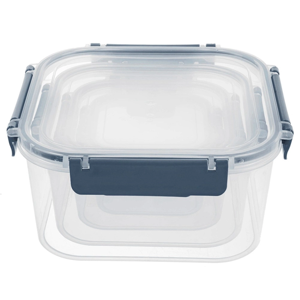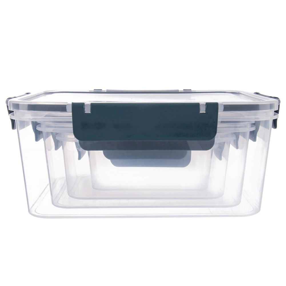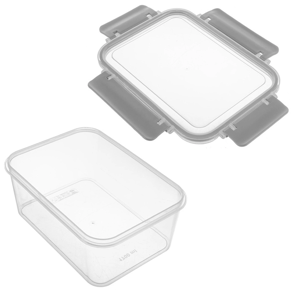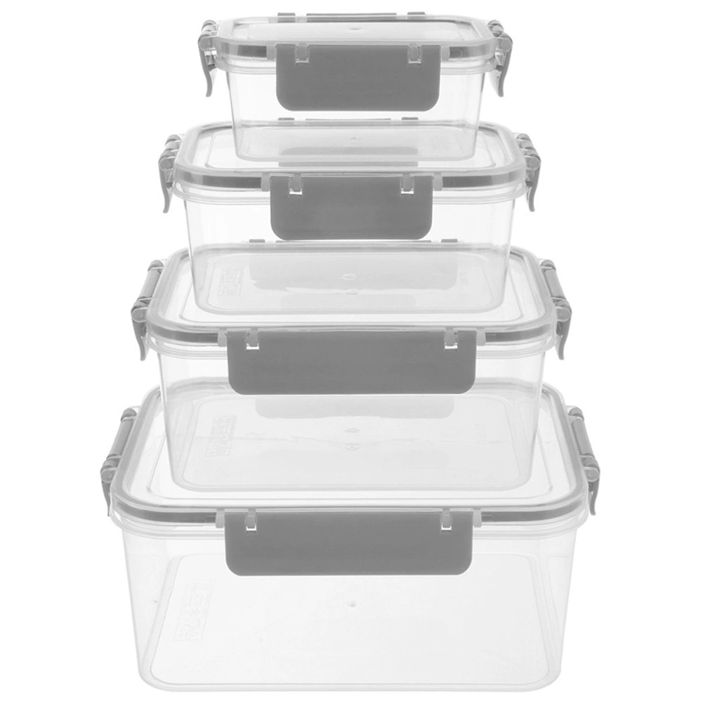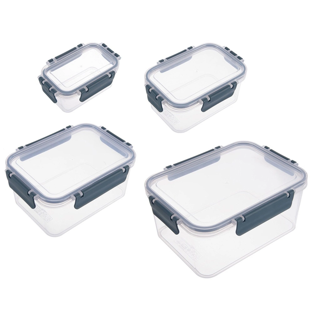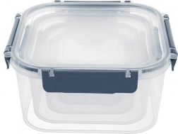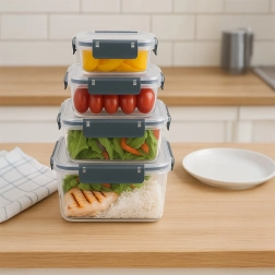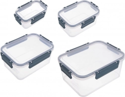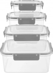 Praktyczny zestaw 4 szczelnych pojemników do przejrzystego i bezpiecznego przechowywania żywności w domu i w podróży. Przezroczysty plastik umożliwia szybki podgląd zawartości, pokrywki z czterema zatrzaskowymi klipsami i silikonową uszczelką utrzymują świeżość i zapobiegają przeciekaniu. Pojemniki są bez BPA, nadają się do zmywarki, kuchenki mikrofalowej (bez pokrywek) oraz zamrażarki, a dzięki możliwości sztaplowania i wkładania jeden w drugi oszczędzają miejsce.