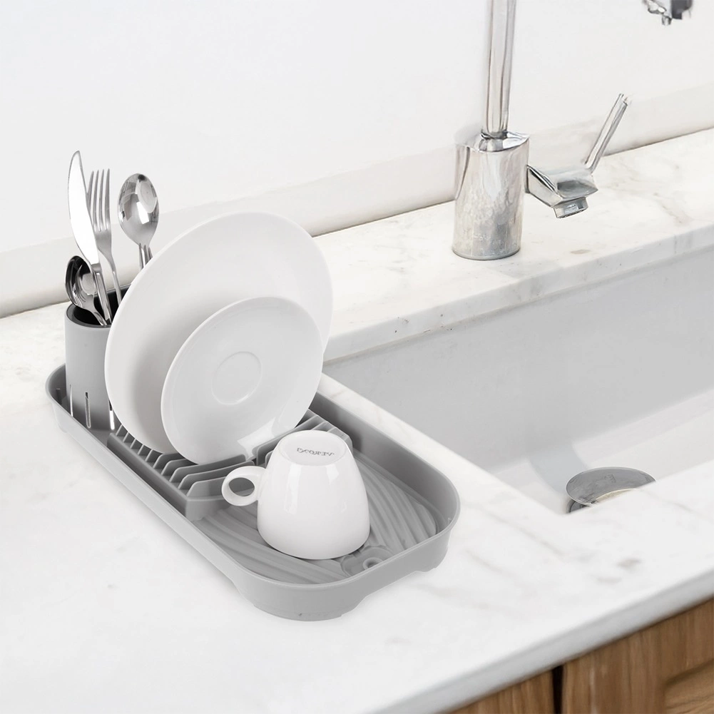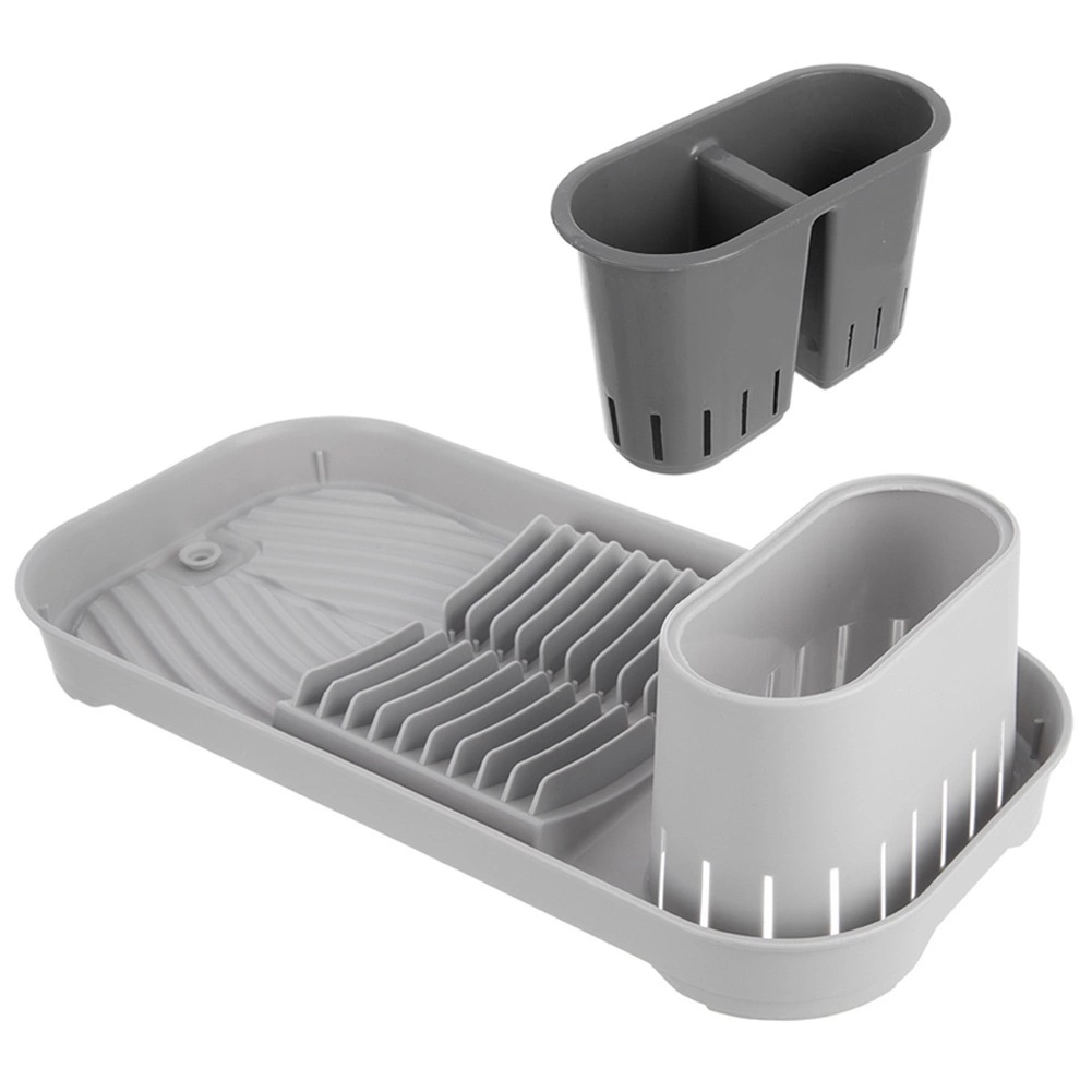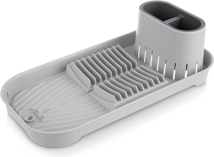 Kompaktowy szary ociekacz na naczynia z wyjmowanym pojemnikiem na sztućce, miejscem na do 9 talerzy oraz przestrzenią na kubki i miski. Dzięki zintegrowanemu odpływowi z zamknięciem odprowadza wodę bezpośrednio z żłobień, chroni blat kuchenny i utrzymuje sucho wokół zlewu. Stabilna, antypoślizgowa podstawa i łatwa pielęgnacja to oczywistość. Wymiary 39 × 19,5 × 11 cm.