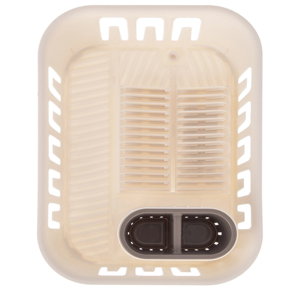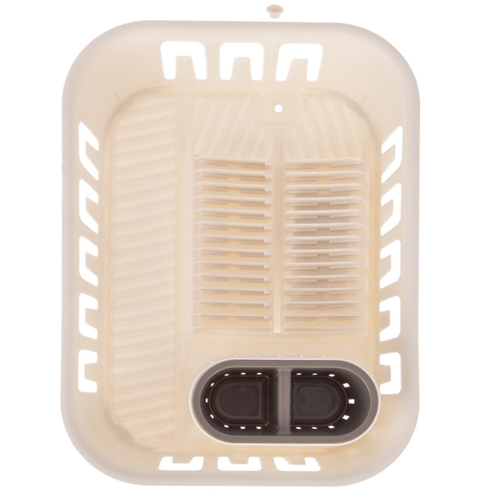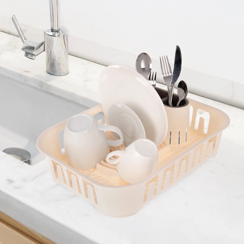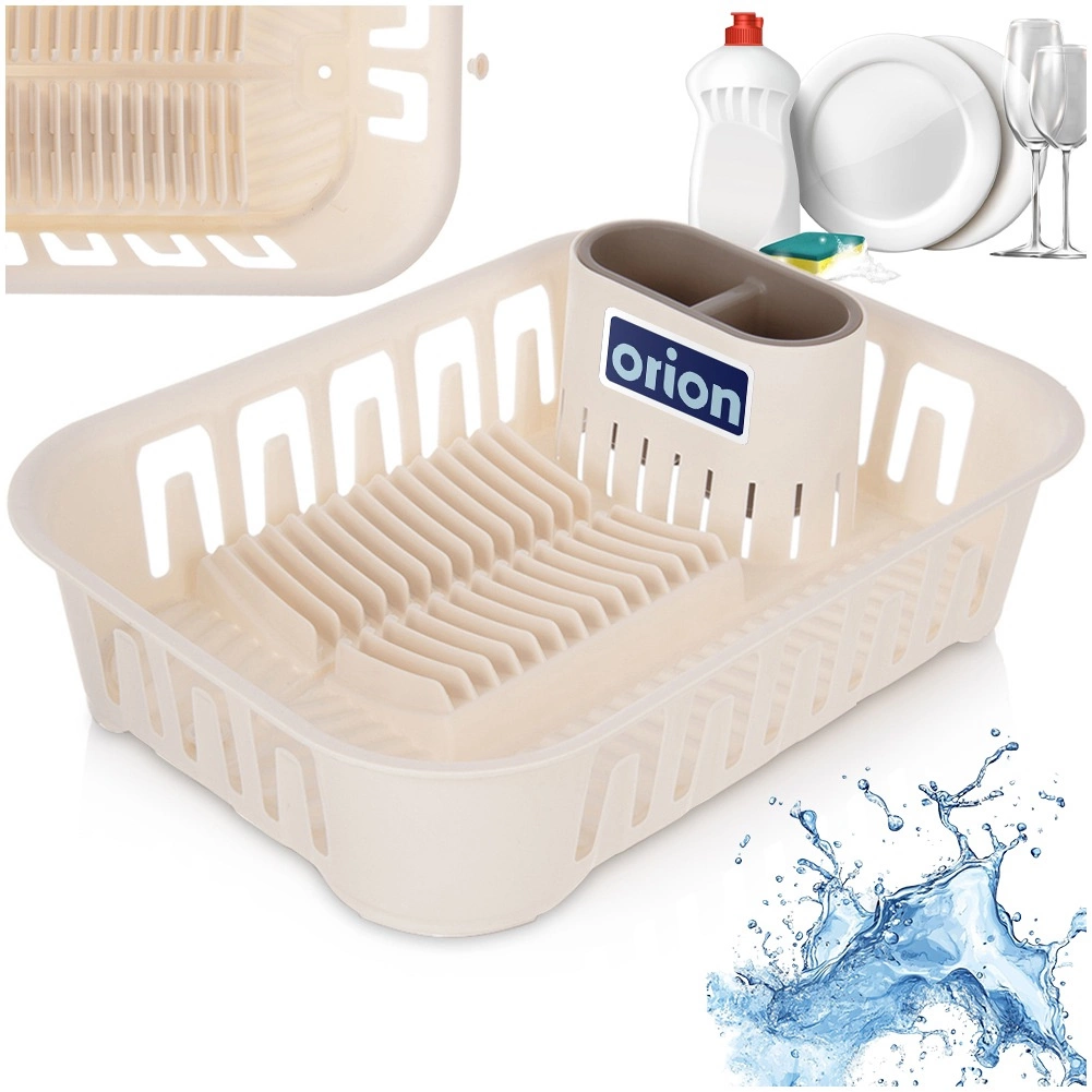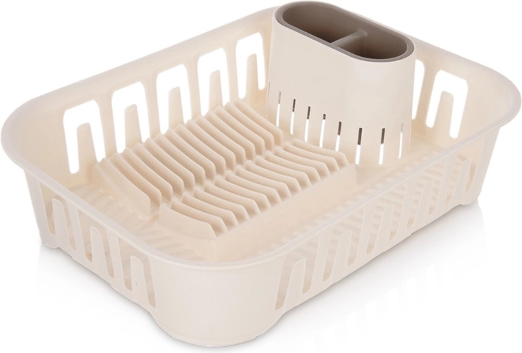 Praktyczna kremowa suszarka do naczyń / ociekacz do naczyń z wyjmowanym pojemnikiem na sztućce i miejscem na do 13 talerzy. Posiada system odprowadzania wody z zamykanym odpływem, stabilną, antypoślizgową podstawę i łatwo się czyści – idealna do kuchni, na działkę i do kampera.