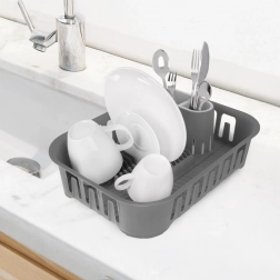 Poręczna suszarka do naczyń w eleganckim, szarym kolorze ułatwi suszenie umytych talerzy, kubków i sztućców, a jednocześnie ochroni blat kuchenny przed wodą. Ma przemyślane dno z zintegrowanym odpływem i korkiem, więc nie potrzebujesz dodatkowej tacki. W zestawie znajduje się wyjmowany pojemnik na sztućce z dwiema komorami dla wygodnego sortowania.