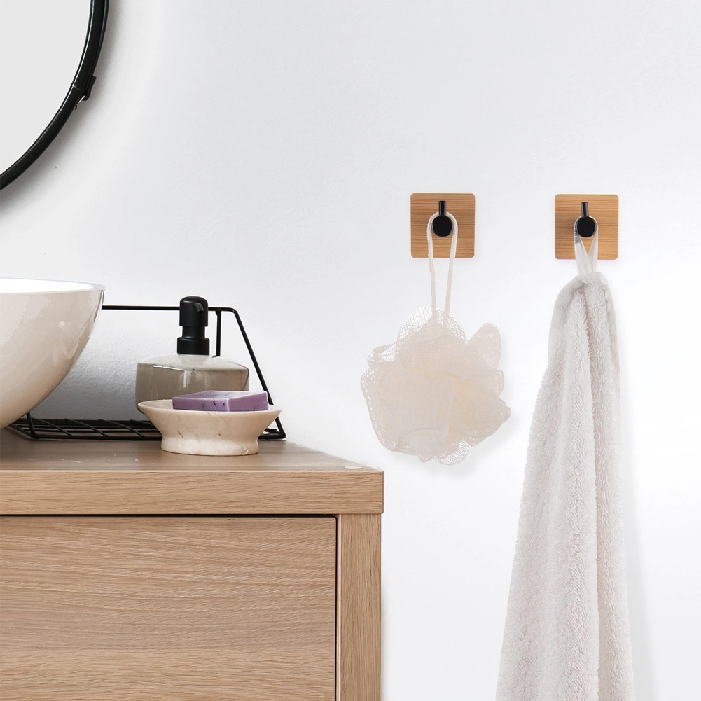 Praktyczny zestaw dwóch haczyków ściennych łączy drewno bambusowe i matowy czarny metal, oferując eleganckie i trwałe rozwiązanie organizacji. Montaż samoprzylepny bez wiercenia umożliwia szybkie przymocowanie w łazience, kuchni czy przedpokoju. Kompaktowy wymiar 4,5 × 4,5 cm idealnie nadaje się na ręczniki, ubrania lub torby.