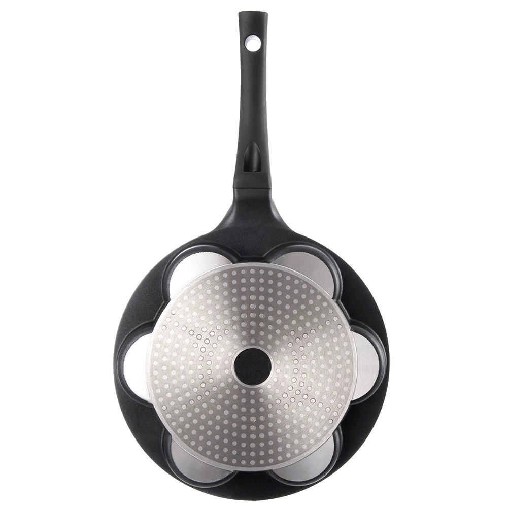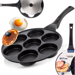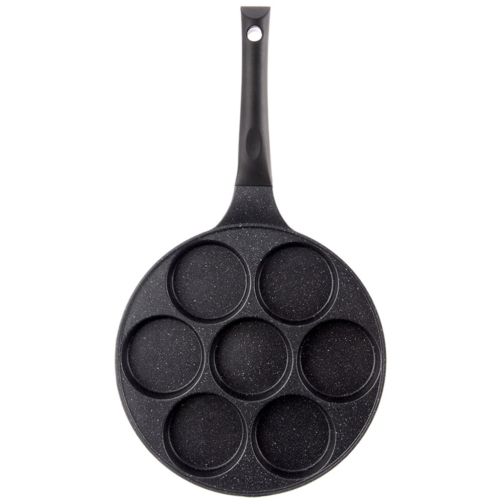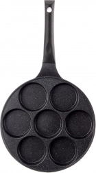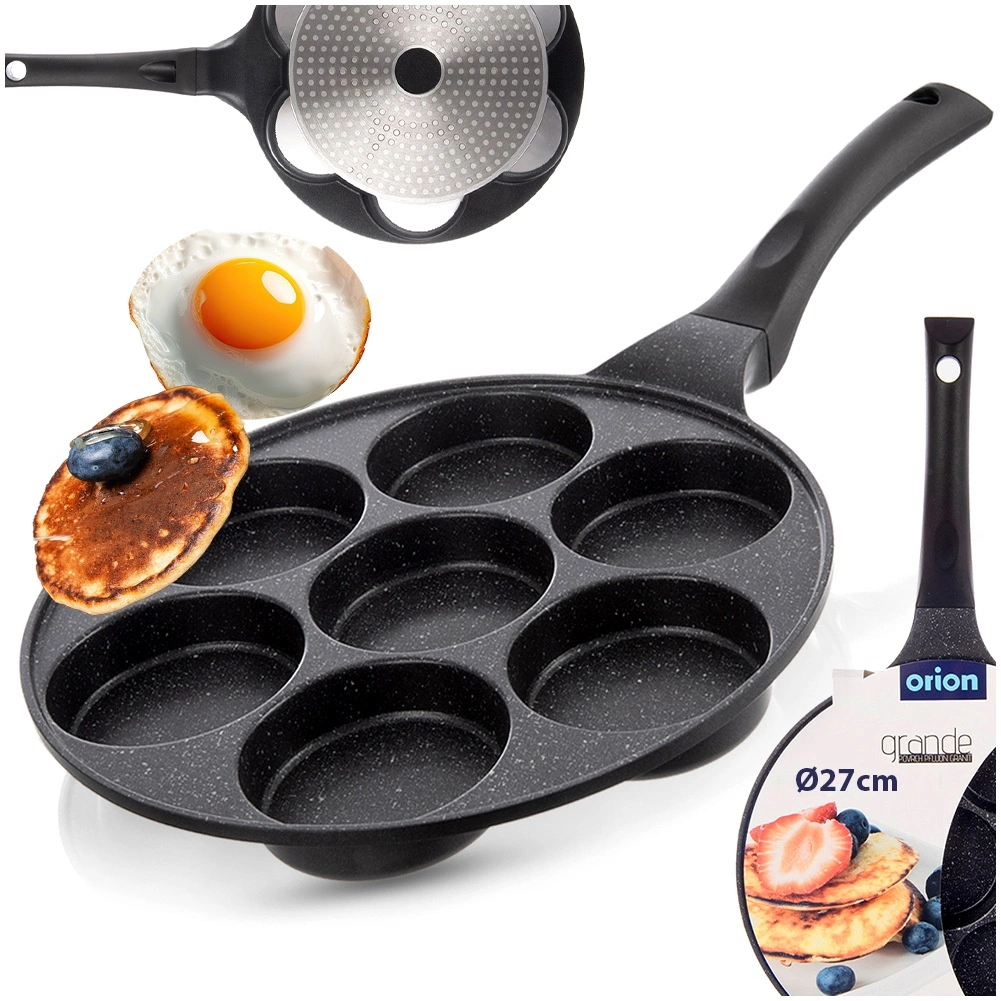 Ta stylowa patelnia z nieprzywierającą, granitową powłoką jest idealna do szybkiego przygotowania śniadań i przekąsek. Dzięki siedmiu okrągłym formom zawsze uzyskasz równe porcje o perfekcyjnym kształcie – od jajek sadzonych, przez placuszki, po mini naleśniki. Aluminiowe korpus z powłoką PFLUON GRANIT umożliwia zdrowsze smażenie przy minimalnej ilości oleju i ułatwia czyszczenie.