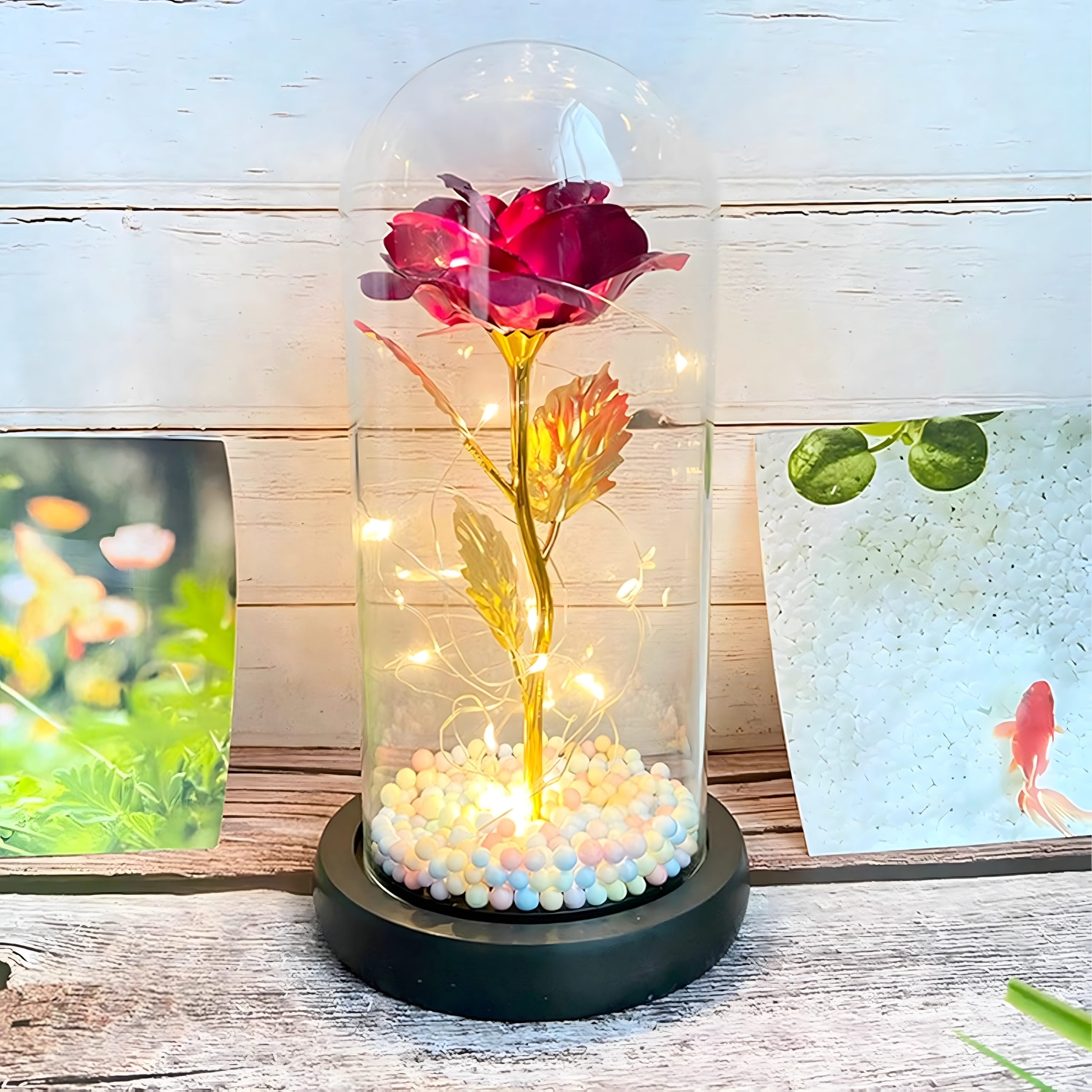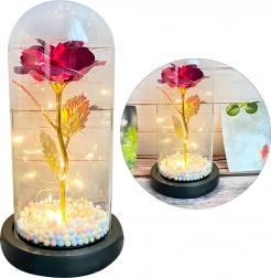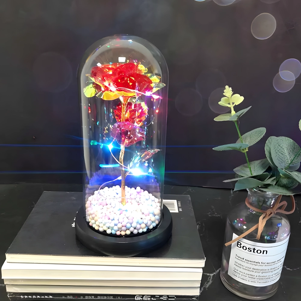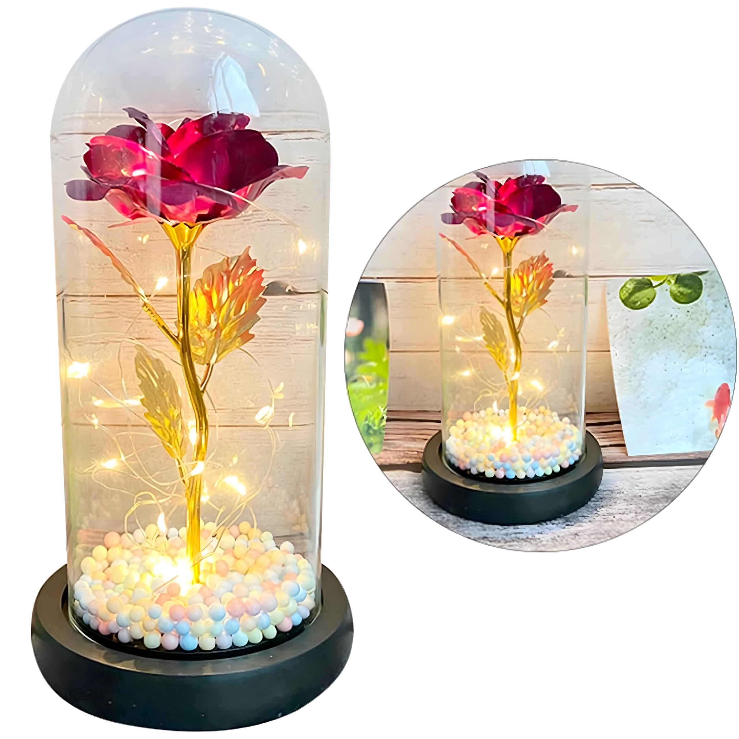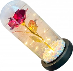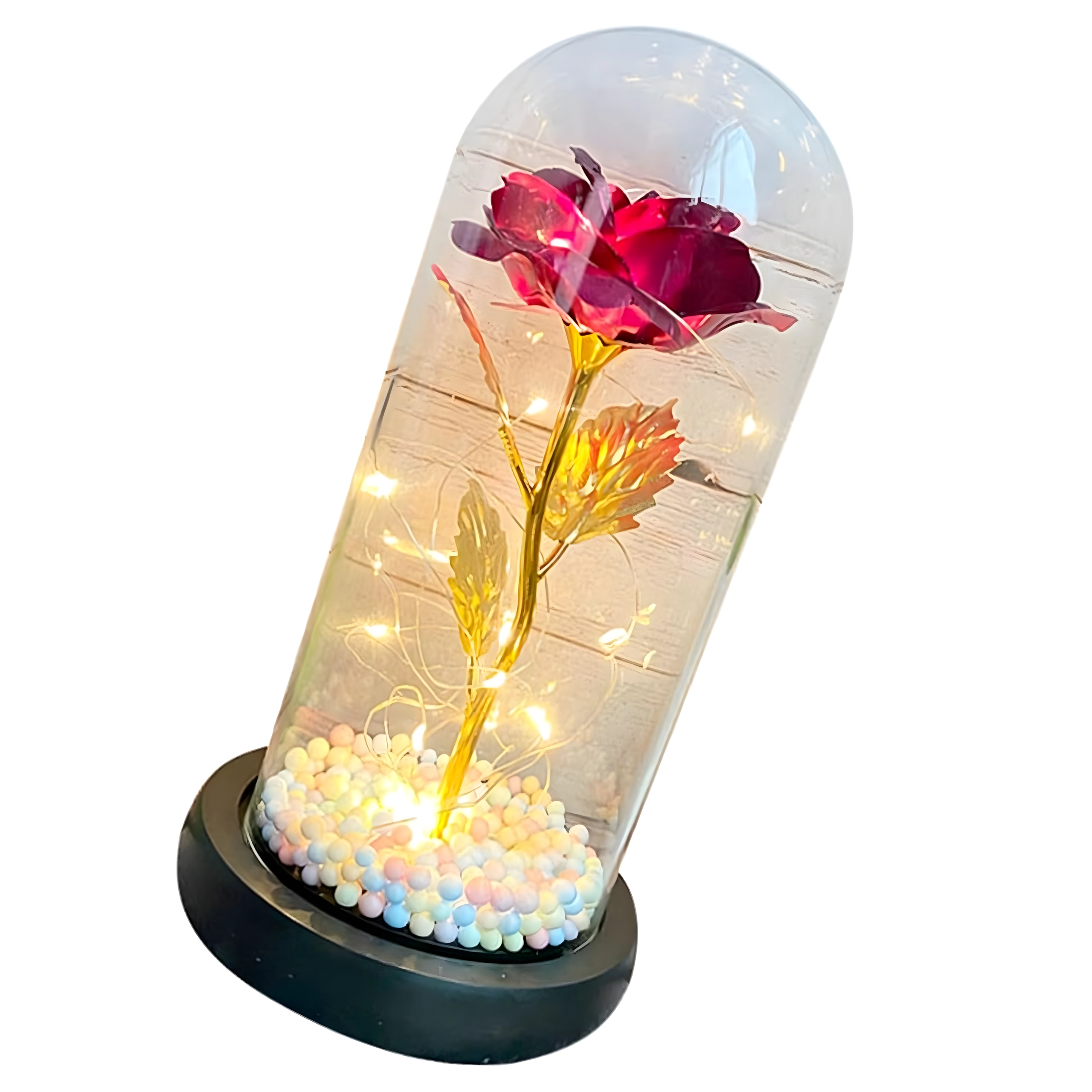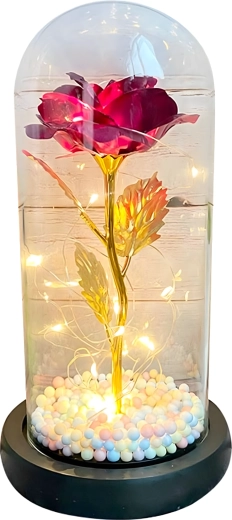 Urzekająca dekoracja, która łączy piękno róży z ciepłym światłem. Szklany klosz chroni kwiat przed kurzem, a łańcuszek LED tworzy subtelne refleksy na złotej łodydze i liściach. Kolorowe/pastelowe koraliki w podstawie dodają delikatnego, figlarnego akcentu.