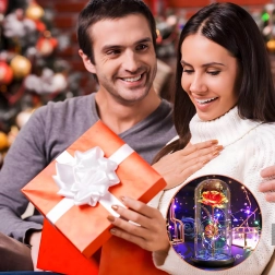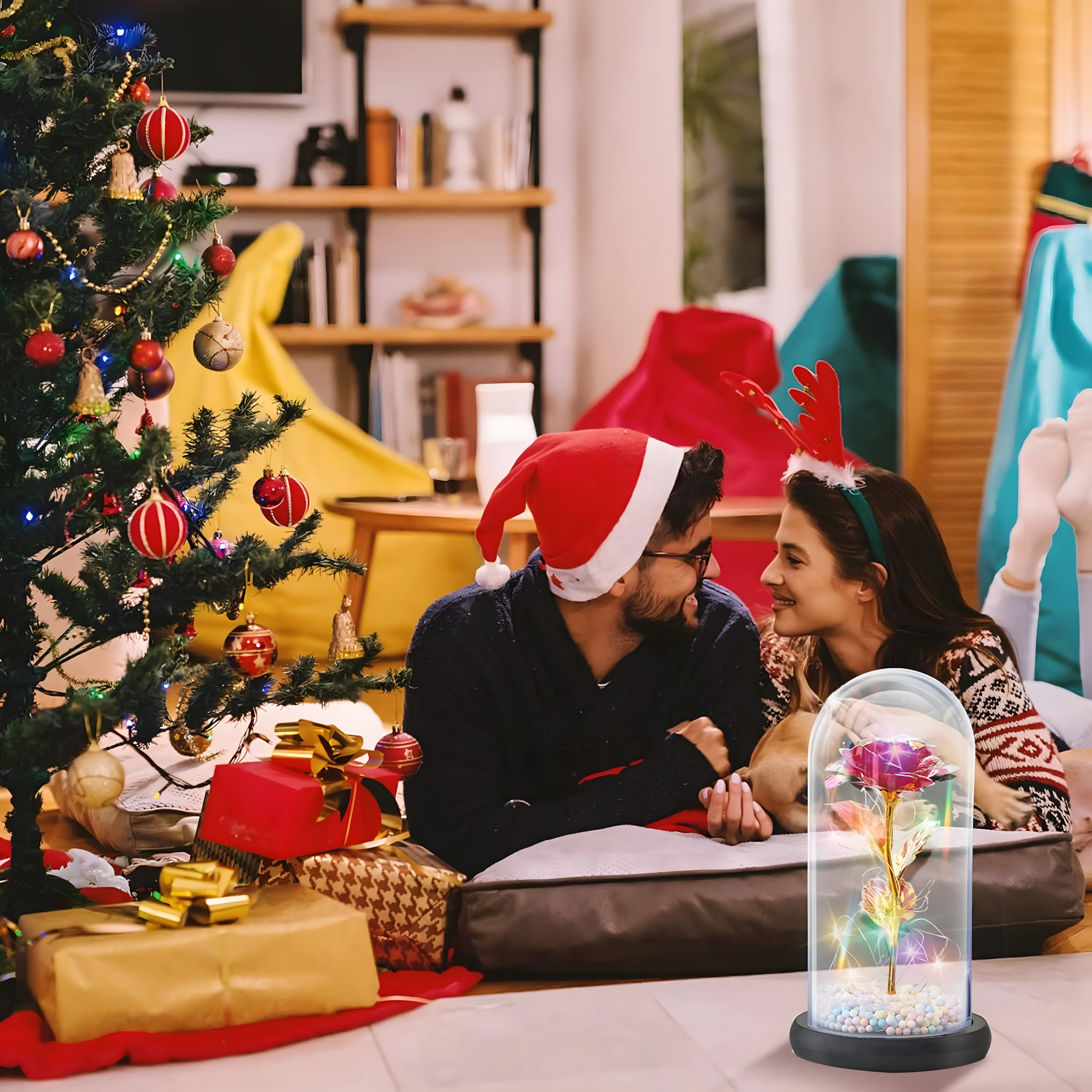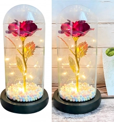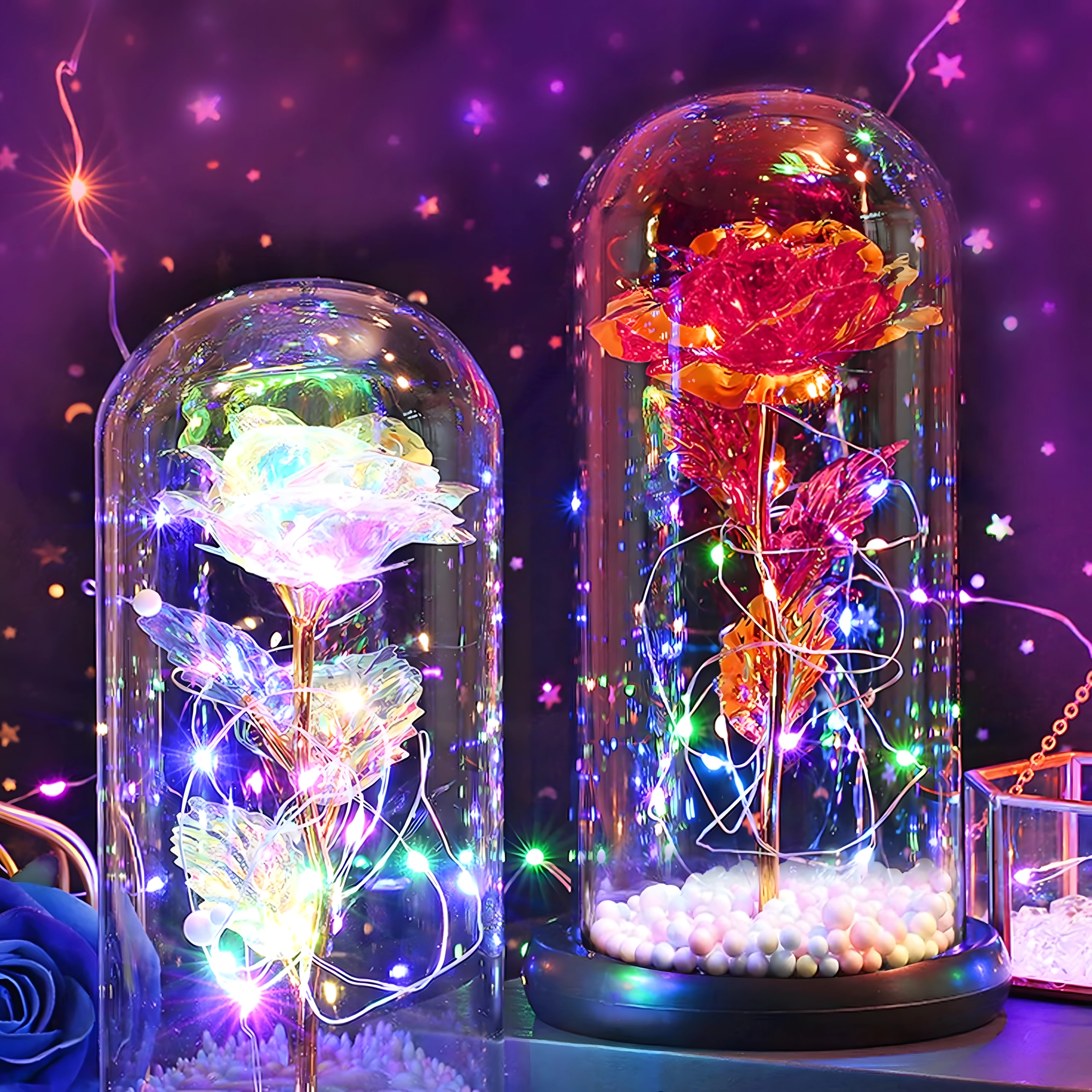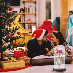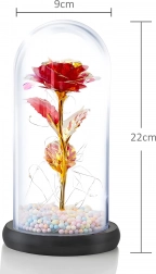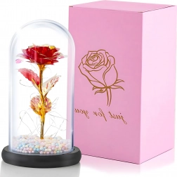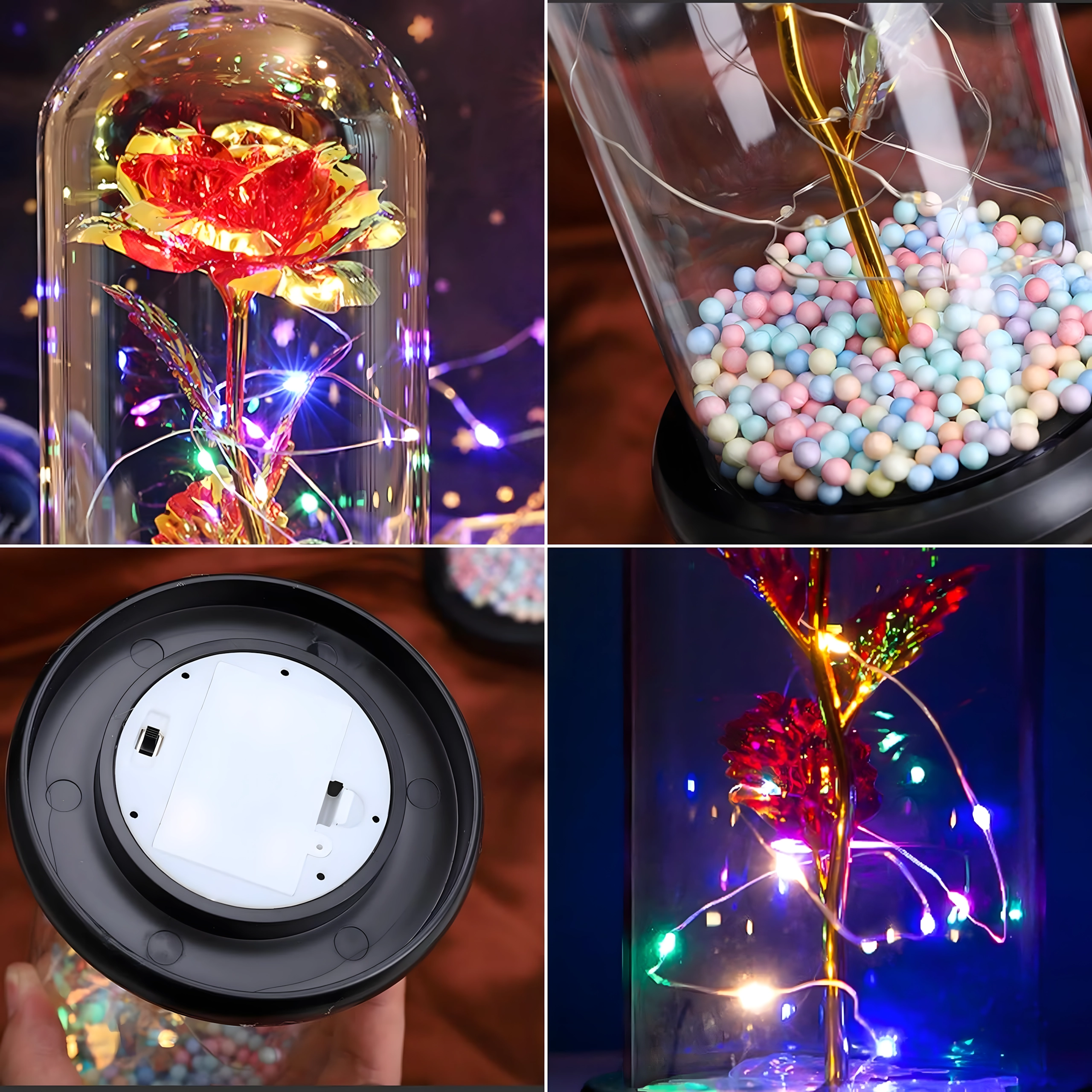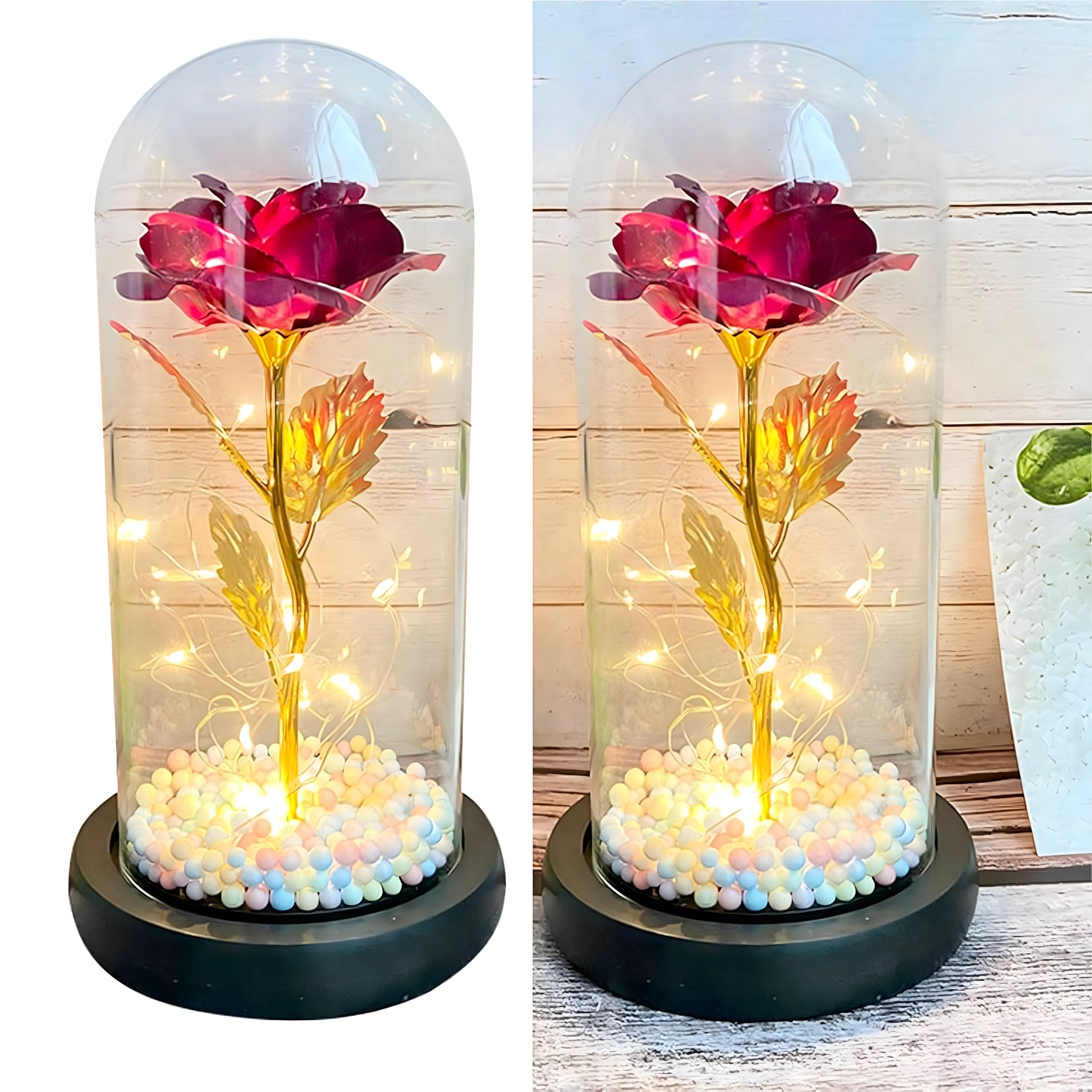 Urzekająca dekoracja, która łączy piękno róży z ciepłym światłem. Szklany klosz chroni kwiat przed kurzem, a łańcuszek LED tworzy subtelne refleksy na złotej łodydze i liściach. Kolorowe/pastelowe koraliki w podstawie dodają delikatnego, figlarnego akcentu.