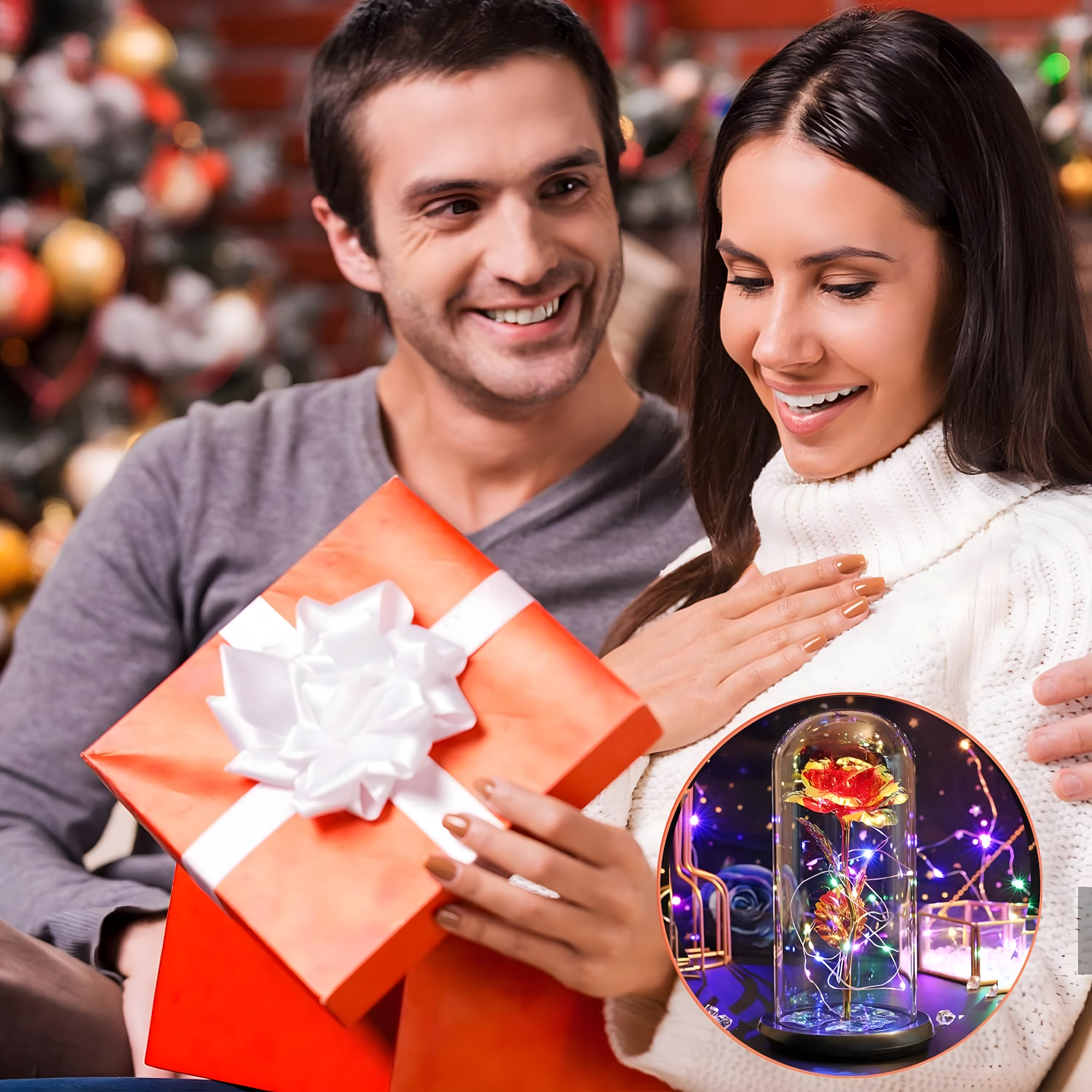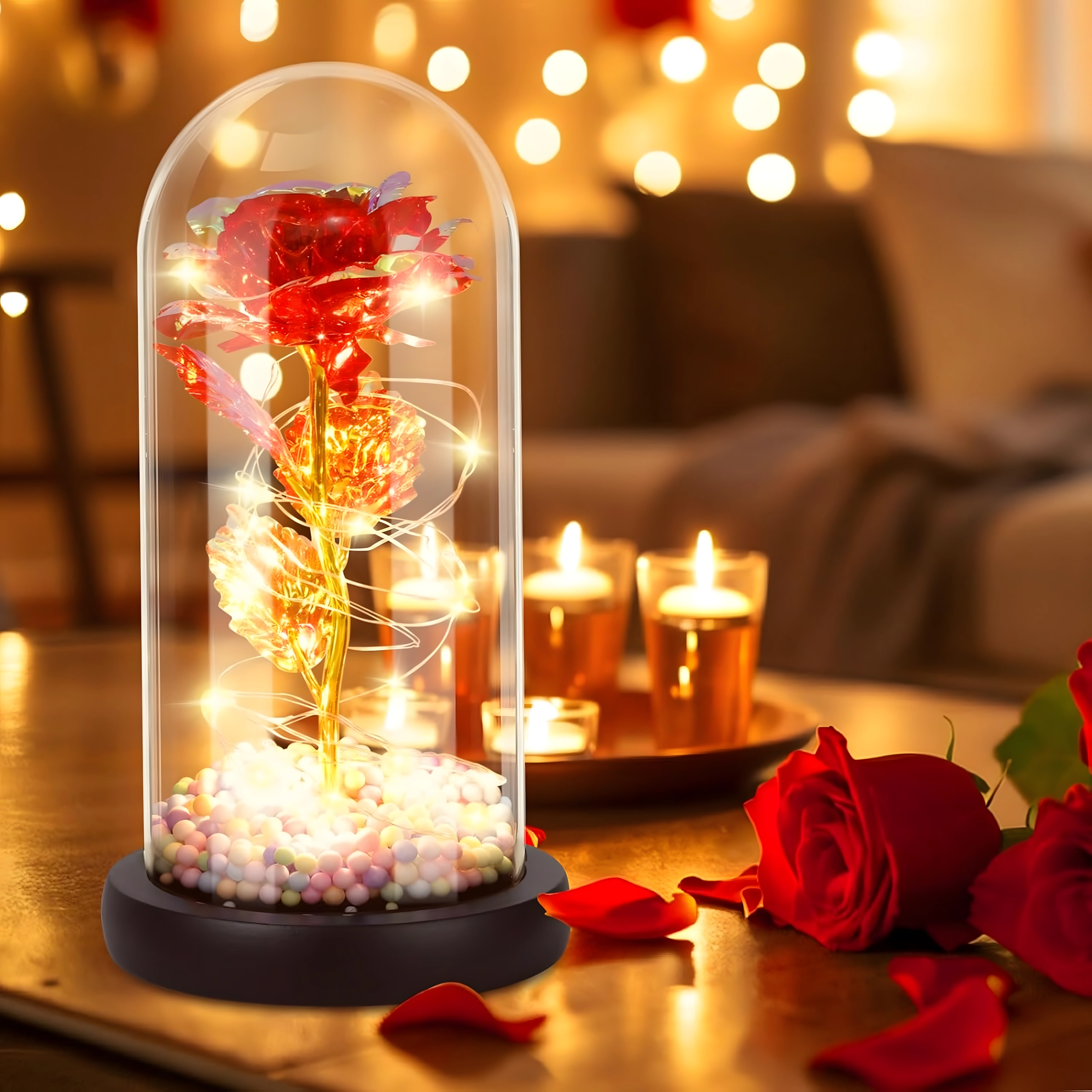Podaruj magię, która nigdy nie zwiędnie. Ta elegancka czerwona róża w szklanym kloszu ze złotą łodygą i delikatnymi światełkami LED tworzy romantyczne, nastrojowe oświetlenie do każdego wnętrza. Idealna jako oryginalny prezent na rocznicę, urodziny lub Święta – gotowa do wręczenia w eleganckim opakowaniu.