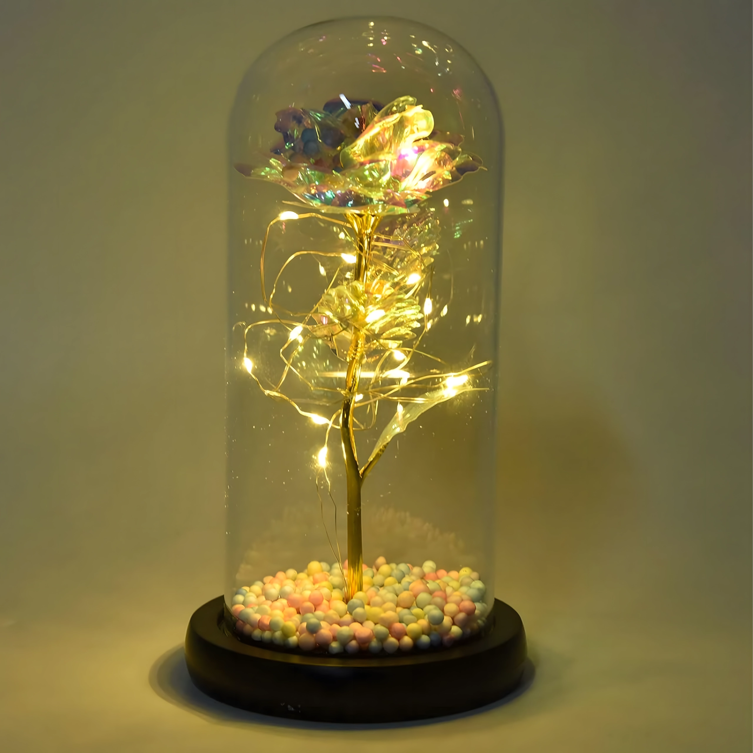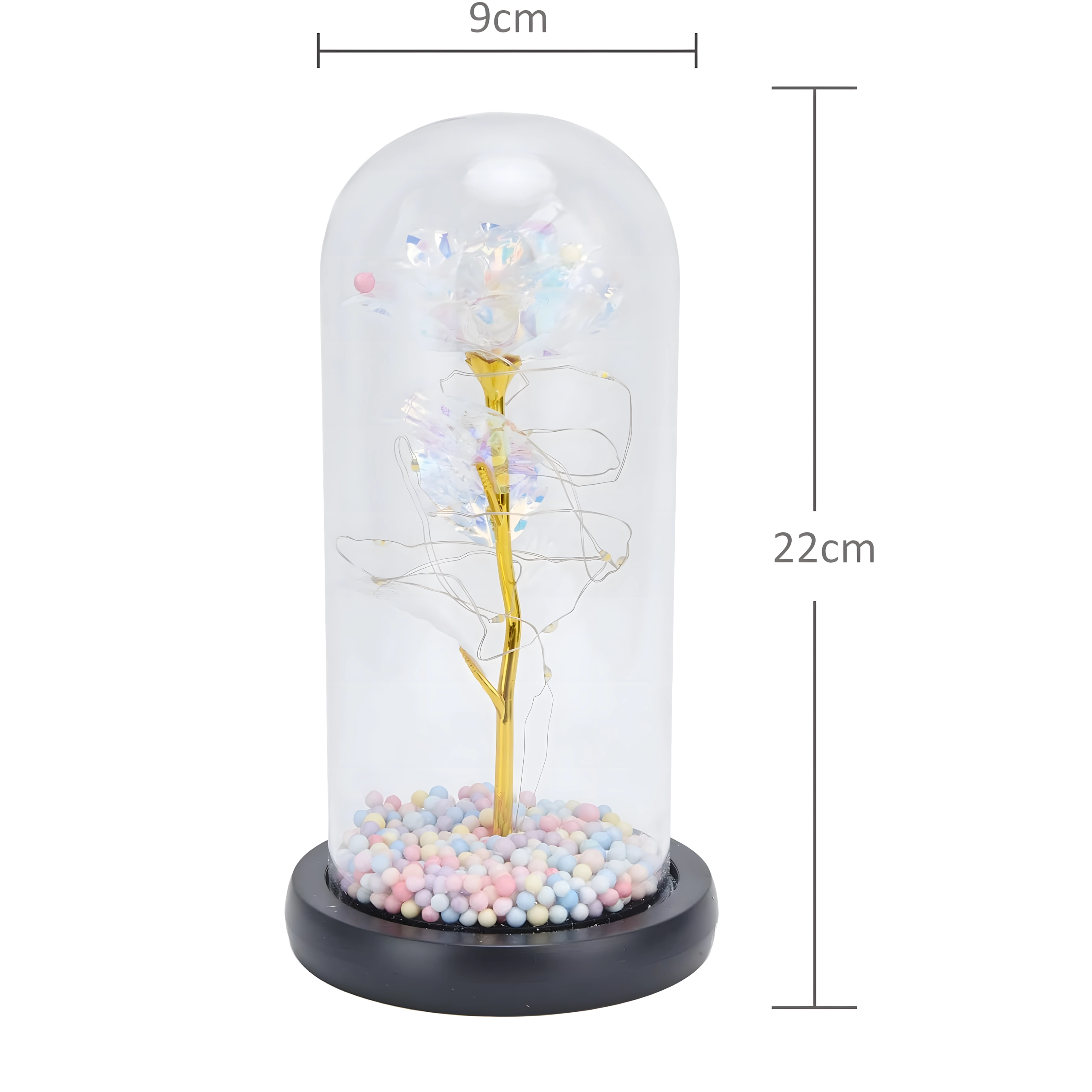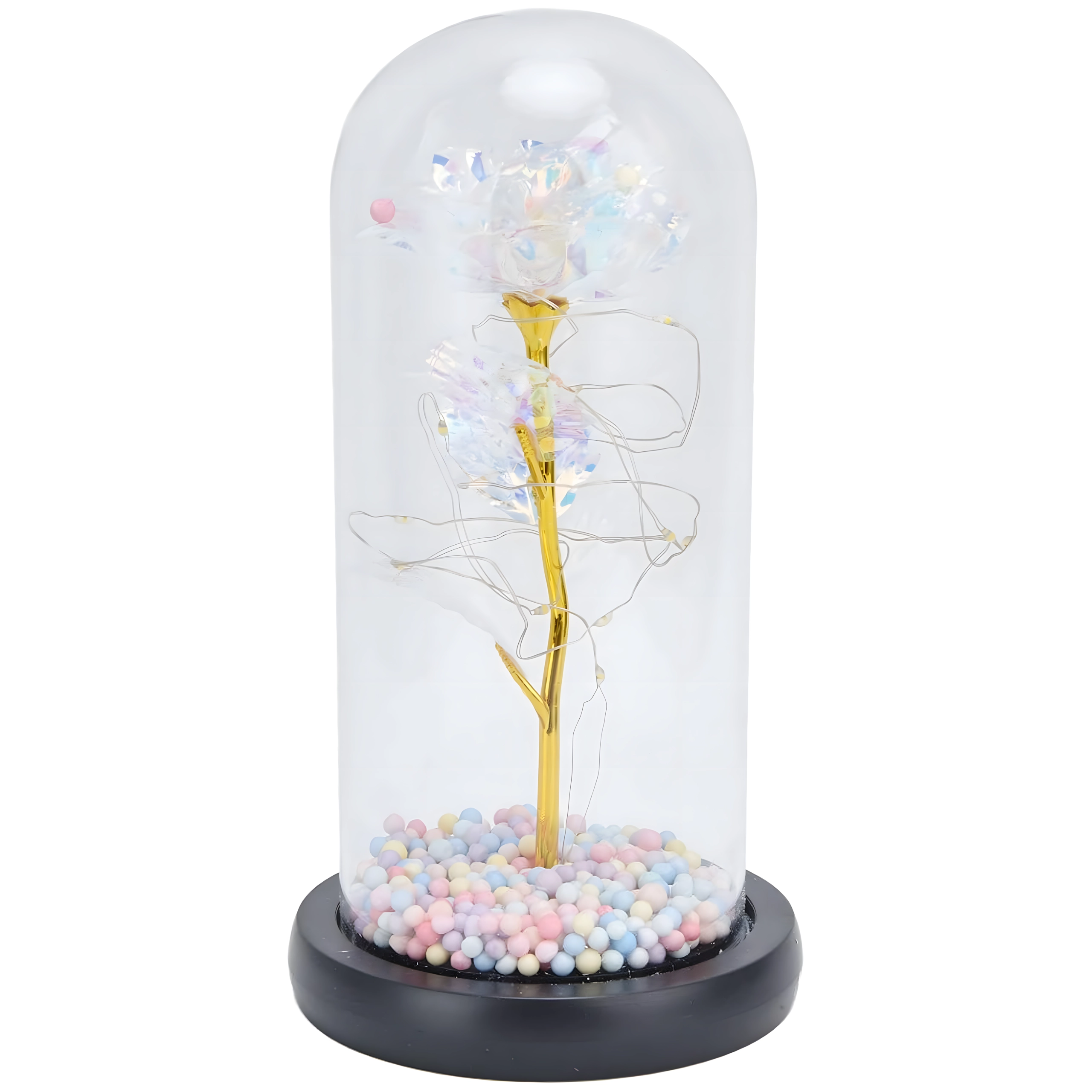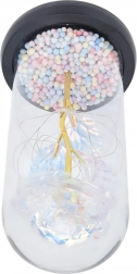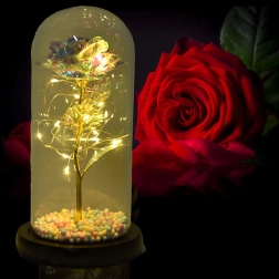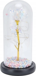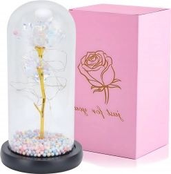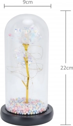 Ta biała wieczna róża w kloszu to symbol ponadczasowej miłości i wyrafinowanego designu. Szklany klosz chroni subtelne detale kwiatu, a drobne przewody LED oplatają złotą łodygę, tworząc ciepłe, nastrojowe światło. Pastelowe koraliki w podstawie dodają dekoracji figlarnego akcentu.