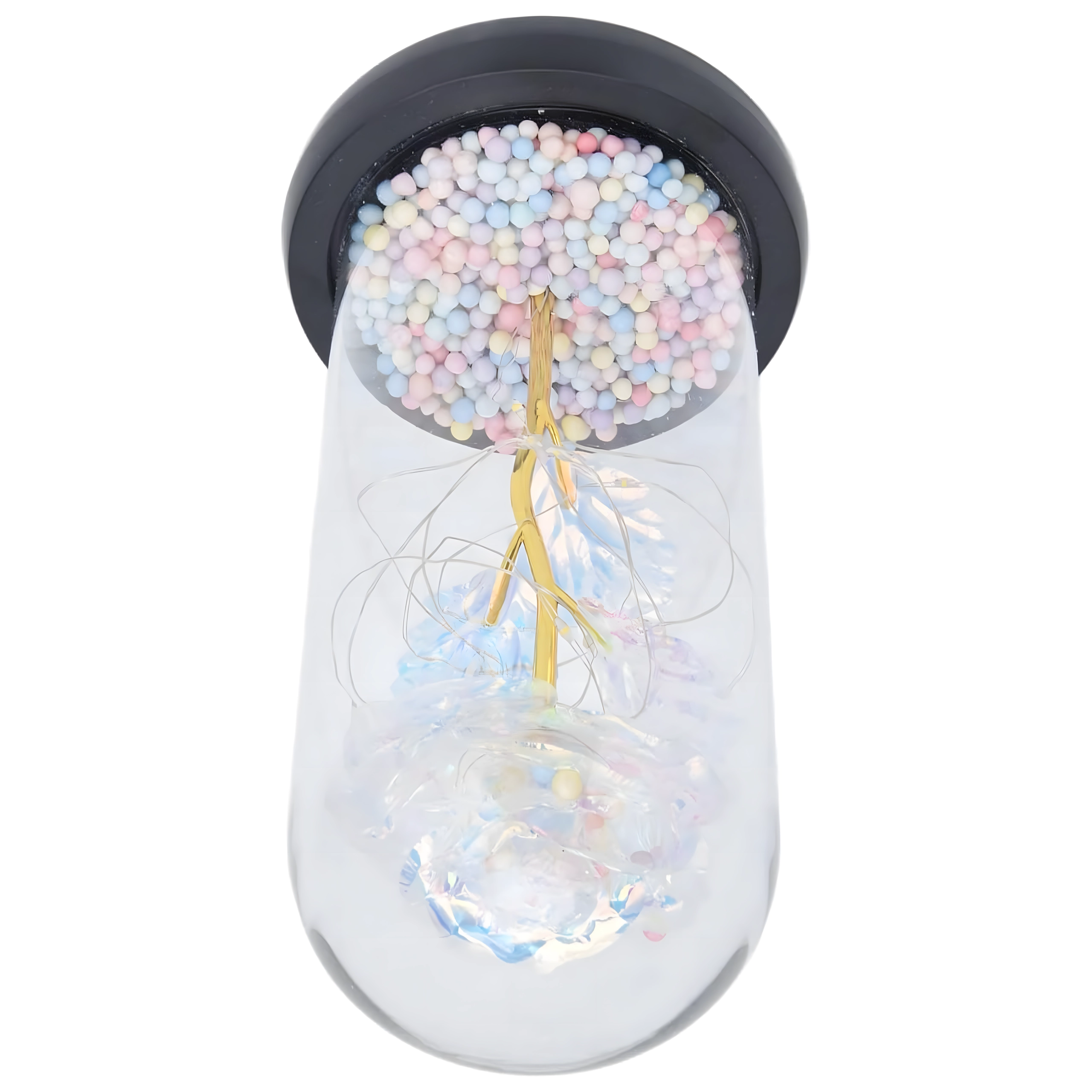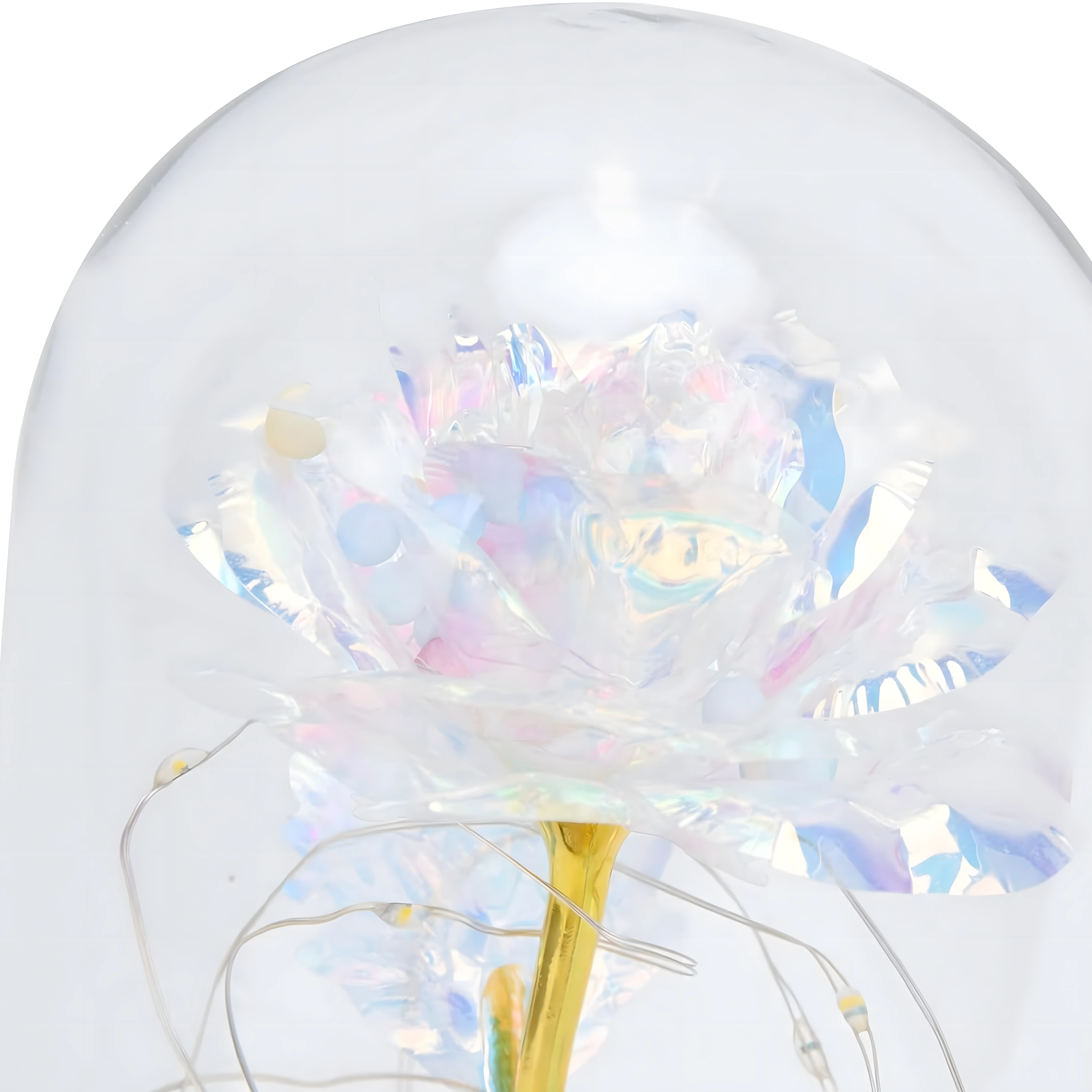 Przezroczysty szklany klosz chroni kwiat przed kurzem i podkreśla jego lśniące, tęczowe płatki – dekoracja zachwyca z każdego kąta.