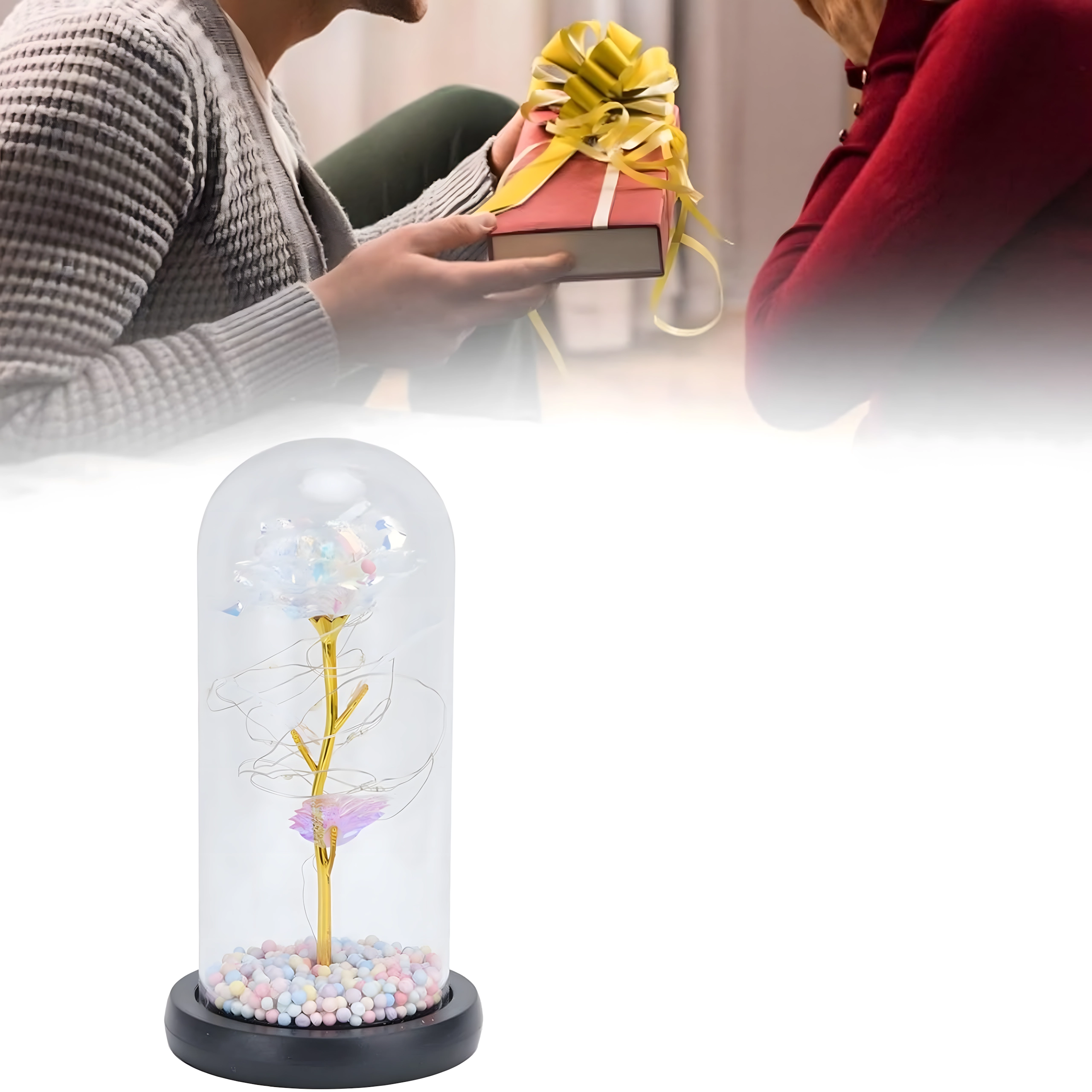 Dekoracja jest zasilana bateriami, więc bez trudu ustawisz ją gdzie chcesz, bez kabli – na stoliku nocnym, półce lub w kąciku salonu. Świetny wybór jako oryginalny prezent na rocznicę, urodziny albo po prostu dla przyjemności.