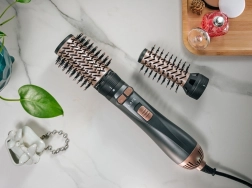 Mieszane włosie delikatnie chwyta pasma bez szarpania, a obrotowa głowica dodaje objętości u nasady, tworzy gładkie fale i eleganckie loki w kilka minut.