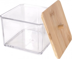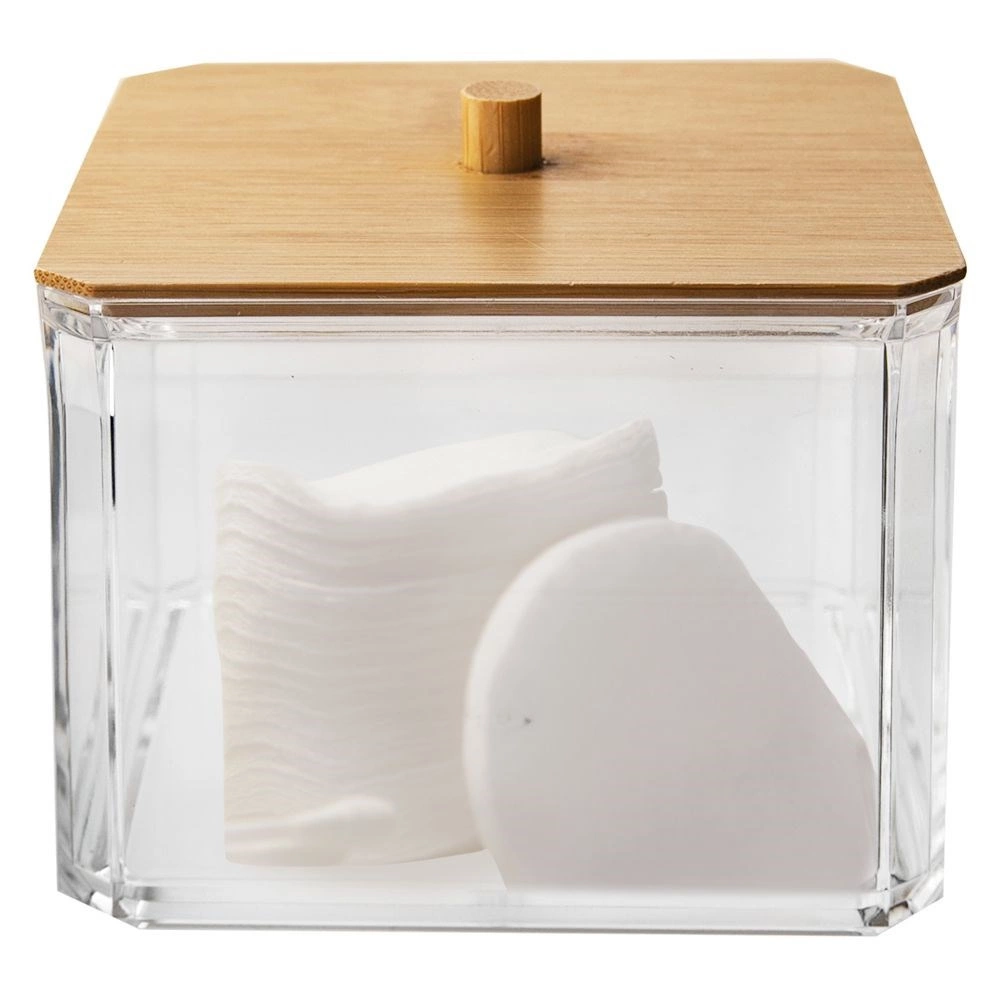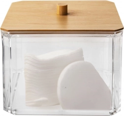 Praktyczny i stylowy organizer na patyczki kosmetyczne z przezroczystego plastiku z naturalną bambusową pokrywką i uchwytem. Utrzymuje zawartość w czystości, zawsze pod ręką i doskonale wpasuje się w każdą łazienkę lub na toaletkę. Dzięki przezroczystym ściankom masz natychmiastowy podgląd zapasów, a uzupełnianie jest wyjątkowo łatwe dzięki górnemu otworowi. Wytrzymałe wykonanie, bambusowa pokrywka przeciwkurzowa oraz nowoczesny design dla codziennej wygody.