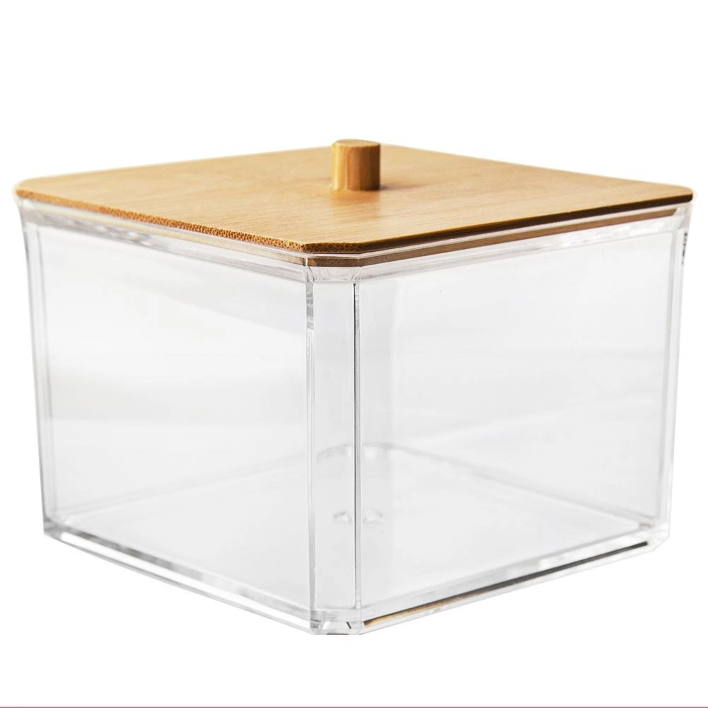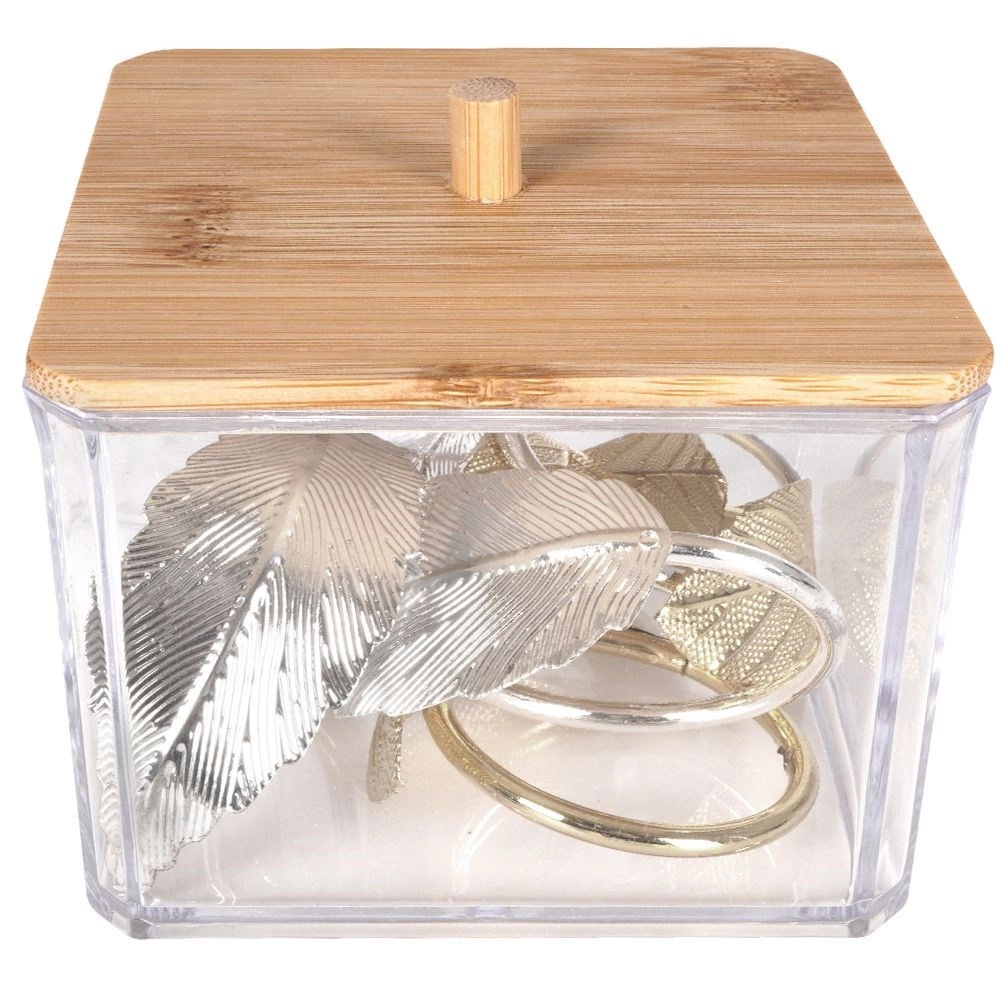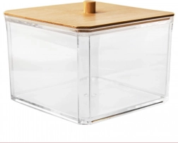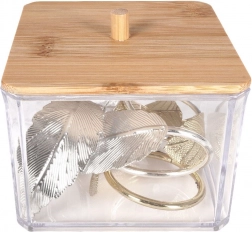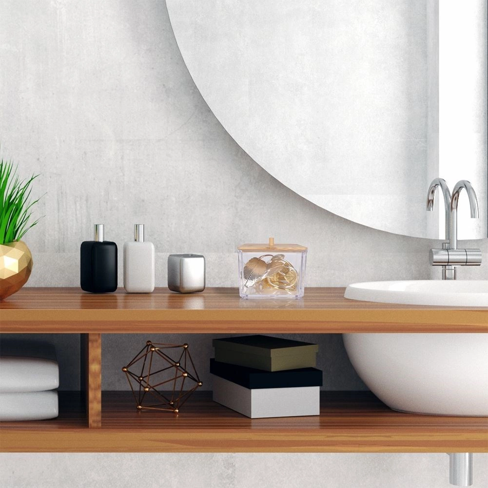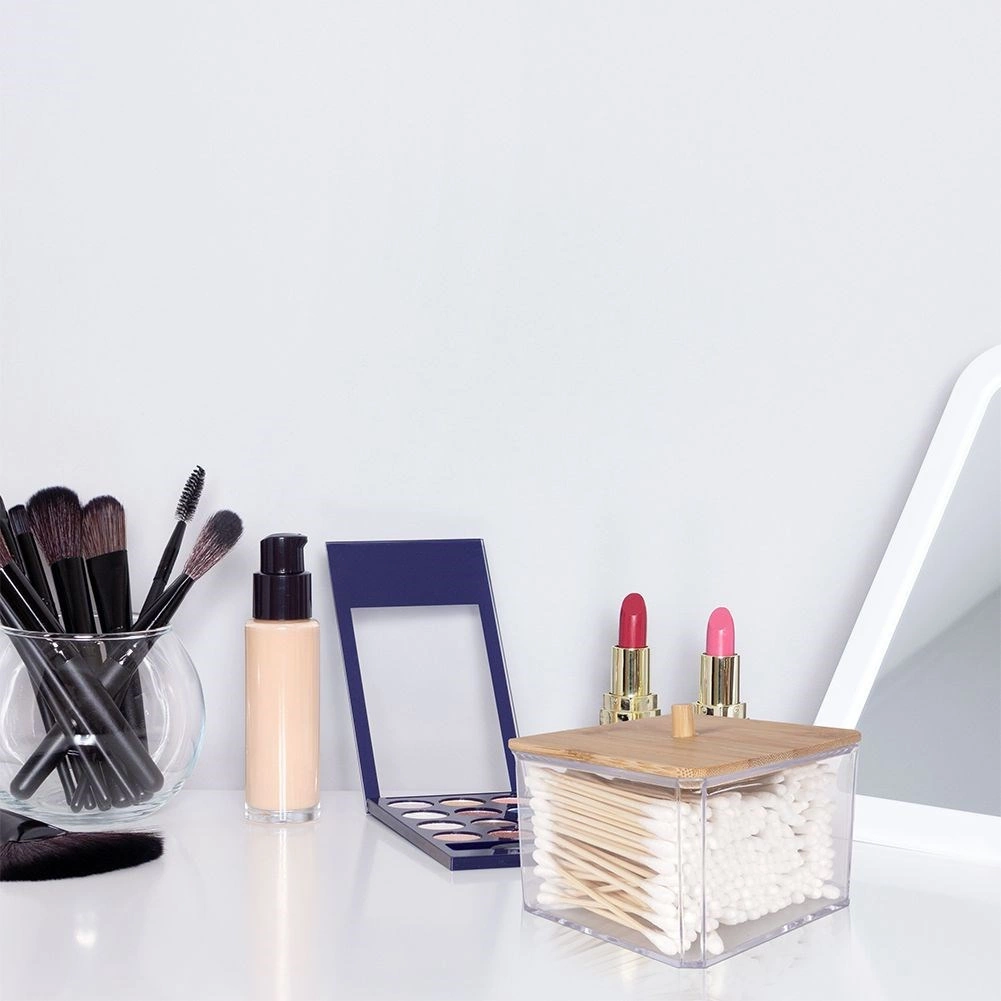 Ten elegancki pojemnik na patyczki kosmetyczne łączy przejrzyste ścianki z wytrzymałego plastiku z naturalnym wyglądem bambusowej pokrywki z praktycznym uchwytem. Świetnie sprawdzi się w łazience, sypialni i w kąciku kosmetycznym – utrzyma drobiazgi przejrzyście uporządkowane i bez kurzu.
