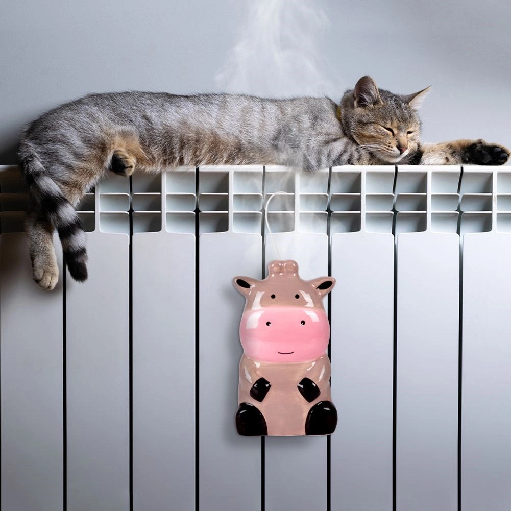 Ten wiszący nawilżacz powietrza w kształcie krówki wystarczy napełnić wodą i zawiesić na ciepłym kaloryferze. Ciepło stopniowo odparowuje wodę, dzięki czemu naturalnie zwiększa wilgotność powietrza bez prądu i hałasu. Dzięki pojemności 170 ml jest idealny do mniejszych pomieszczeń i codziennego uzupełniania.