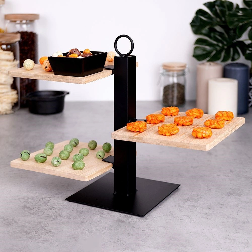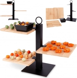 Solidna metalowa konstrukcja z czarną powłoką i stabilna kwadratowa podstawa (13 × 13 cm) gwarantują bezpieczne użytkowanie. Praktyczny górny uchwyt ułatwia przenoszenie. Etażerka to świetny wybór na domowe przyjęcia, bufety, do kawiarni i cateringu — doskonale sprawdzi się na słodkich stołach, podczas brunchu, a także jako stojak do serwowania serów i wędlin.