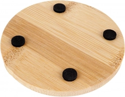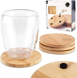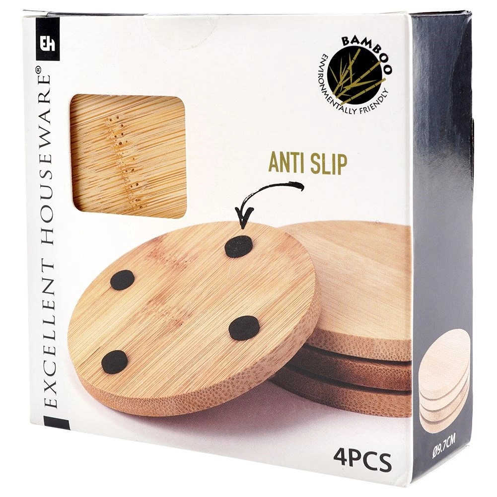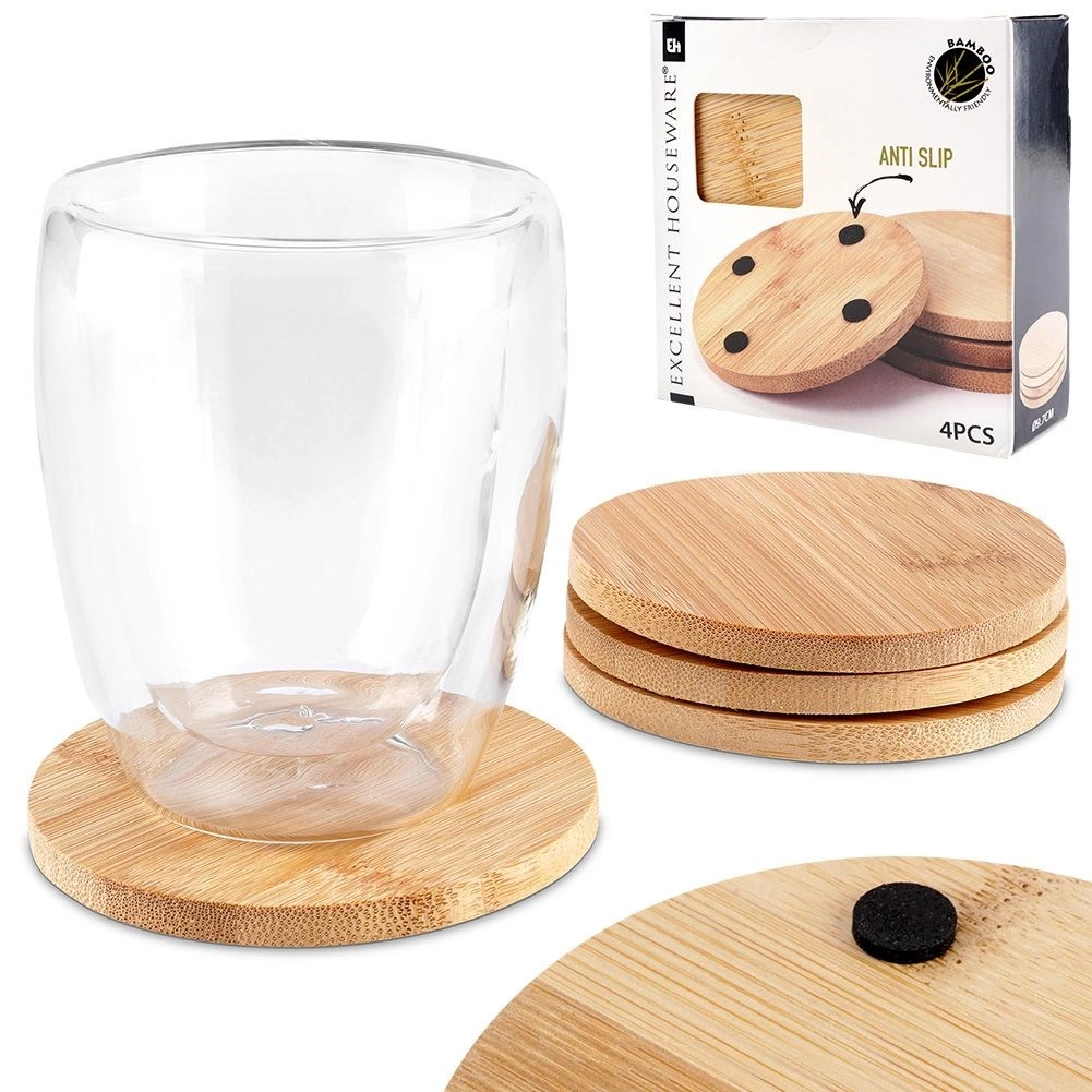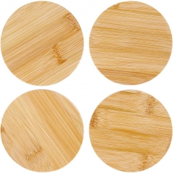 Elegancki zestaw czterech okrągłych podkładek z naturalnego bambusa chroni stół przed wysoką i niską temperaturą oraz wilgocią. Mają średnicę 9,7 cm, gładką powierzchnię oraz na spodzie antypoślizgowe filcowe podkładki dla stabilności. Wytrzymały bambus jest ekologiczny, odporny na wilgoć i nie chłonie płynów, dzięki czemu podkładki świetnie sprawdzają się przy gorących i zimnych napojach, pozostawiając stół bez kółek i zarysowań.