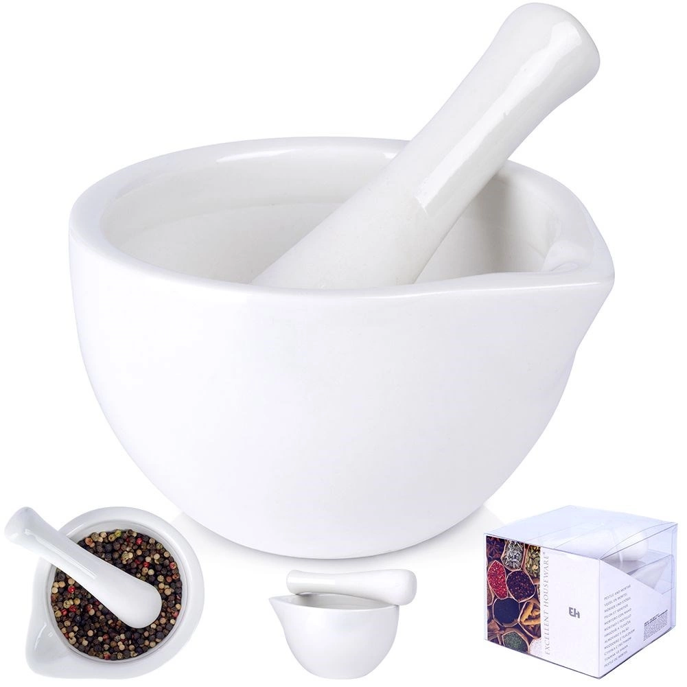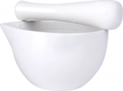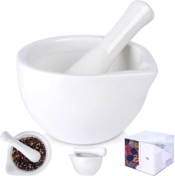 Trwała i ciężka porcelanowa konstrukcja zapewnia stabilność podczas pracy, a dzióbek ułatwia przelewanie past i dressingów. Moździerz jest łatwy w utrzymaniu i nadaje się do zmywarki, co oszczędza czas i wysiłek.