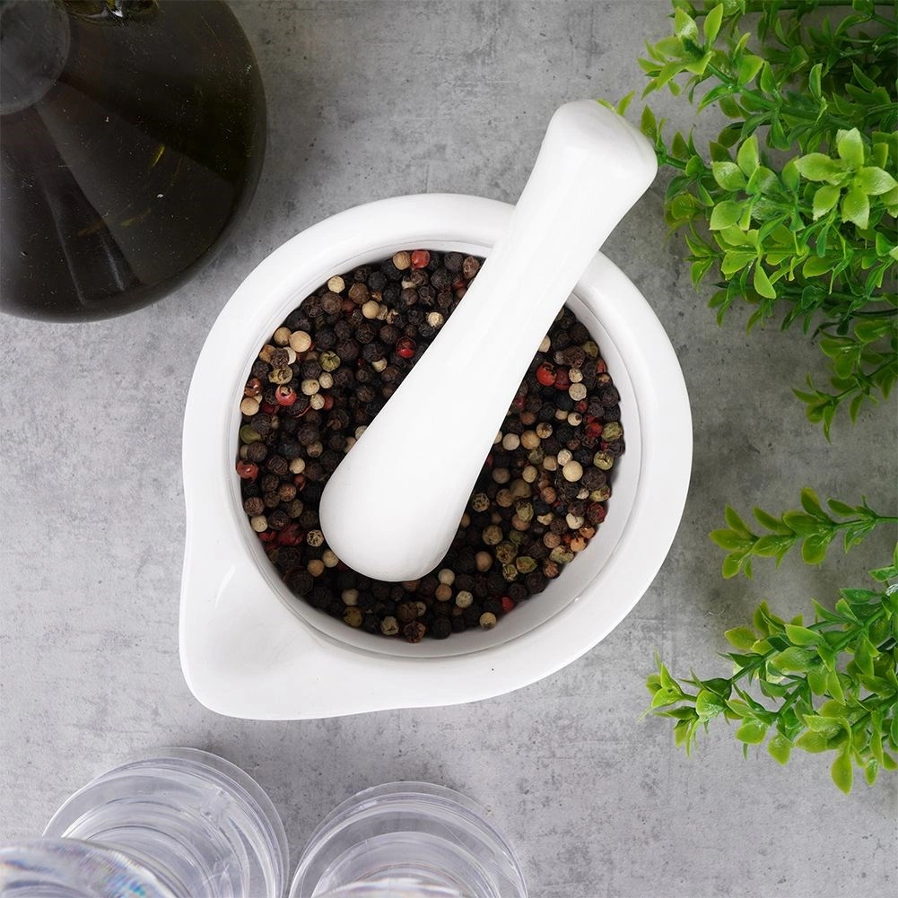Ten biały porcelanowy moździerz to idealny wybór dla domowych kucharzy i miłośników gastronomii, którzy chcą wydobyć maksimum smaku i aromatu z przypraw oraz ziół. Dzięki nieszlifowanej wewnętrznej powierzchni skutecznie rozdrabnia nawet twardsze składniki i pozwala przygotować świeże pesto, aromatyczne mieszanki czy domowe curry.