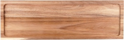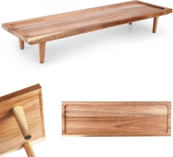Elegancka drewniana deska z akacjowego drewna na stabilnych nóżkach do stylowego serwowania i krojenia. Oferuje podwyższoną konstrukcję dla łatwego nabierania, zabezpieczający podwyższony rant przeciw ześlizgiwaniu się jedzenia oraz naturalny, wytrzymały materiał, który nie pochłania zapachów i szybko schnie.