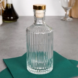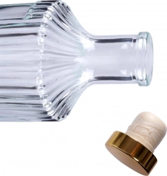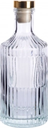 Stylowa butelka z przezroczystego szkła z nowoczesnym żebrowanym wzorem i ozdobnym złotym korkiem sprawdzi się do serwowania i przechowywania napojów. Kompaktowe wymiary ułatwiają obsługę oraz przechowywanie w lodówce czy na półce. Butelka jest łatwa w czyszczeniu i odpowiednia do codziennego użytku w domu i gastronomii.