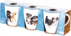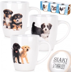 Spraw sobie radość zestawem trzech ceramicznych kubków z delikatnym motywem piesków, który rozświetli Twoją poranną kawę i popołudniową herbatę. Dzięki kompaktowej pojemności 220 ml są idealne do espresso lungo, cappuccino, kakao oraz naparów ziołowych. Kubki wykonano z wysokiej jakości białej ceramiki z odpornym nadrukiem szczeniąt i błyszczącą glazurą.
